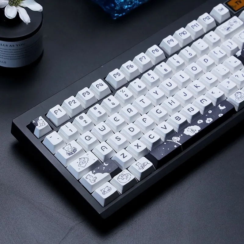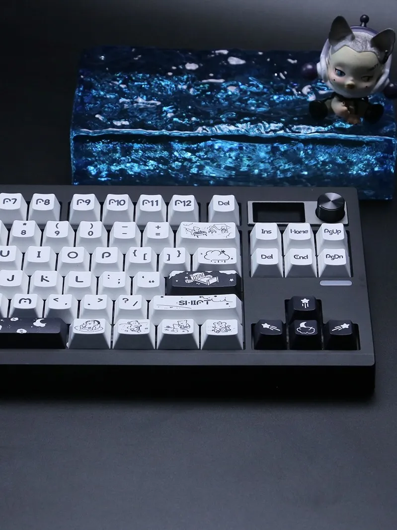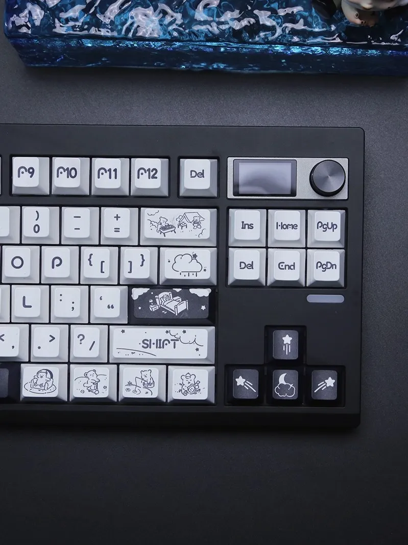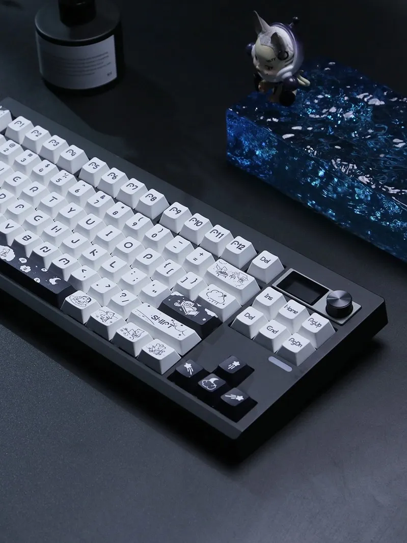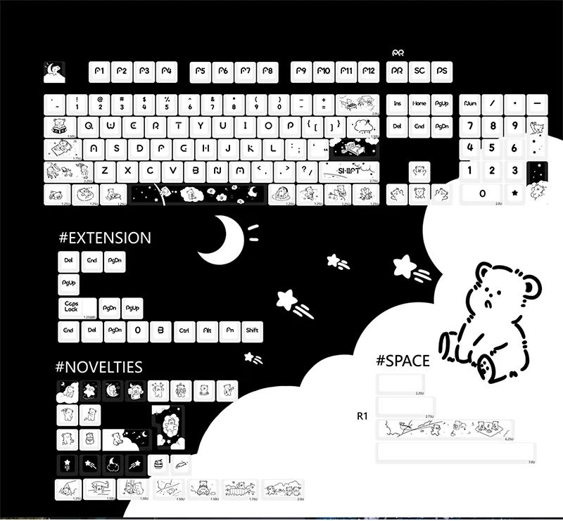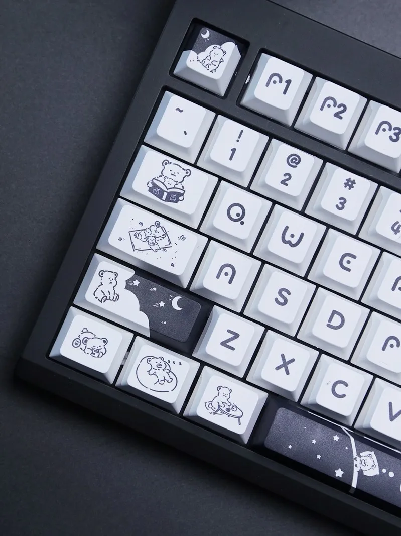 Redesign your keyboard with the adorable Adorable Bear Cherry Keycap Set! With its sleek black keycaps and clean white base that this charming set creates a dramatic contrast. A whimsical touch is added with each keycap’s display of black letters in a distinctive font style. Adorable bear emblems adorn keycaps such as Space and Shift which adding to the quirky appearance. For both dreamers and creatives the directional keys captivating star, moon and cloud emblems are ideal. These keycaps are made of excellent PBT. That blends pleasure and utility to make typing a delightful experience!