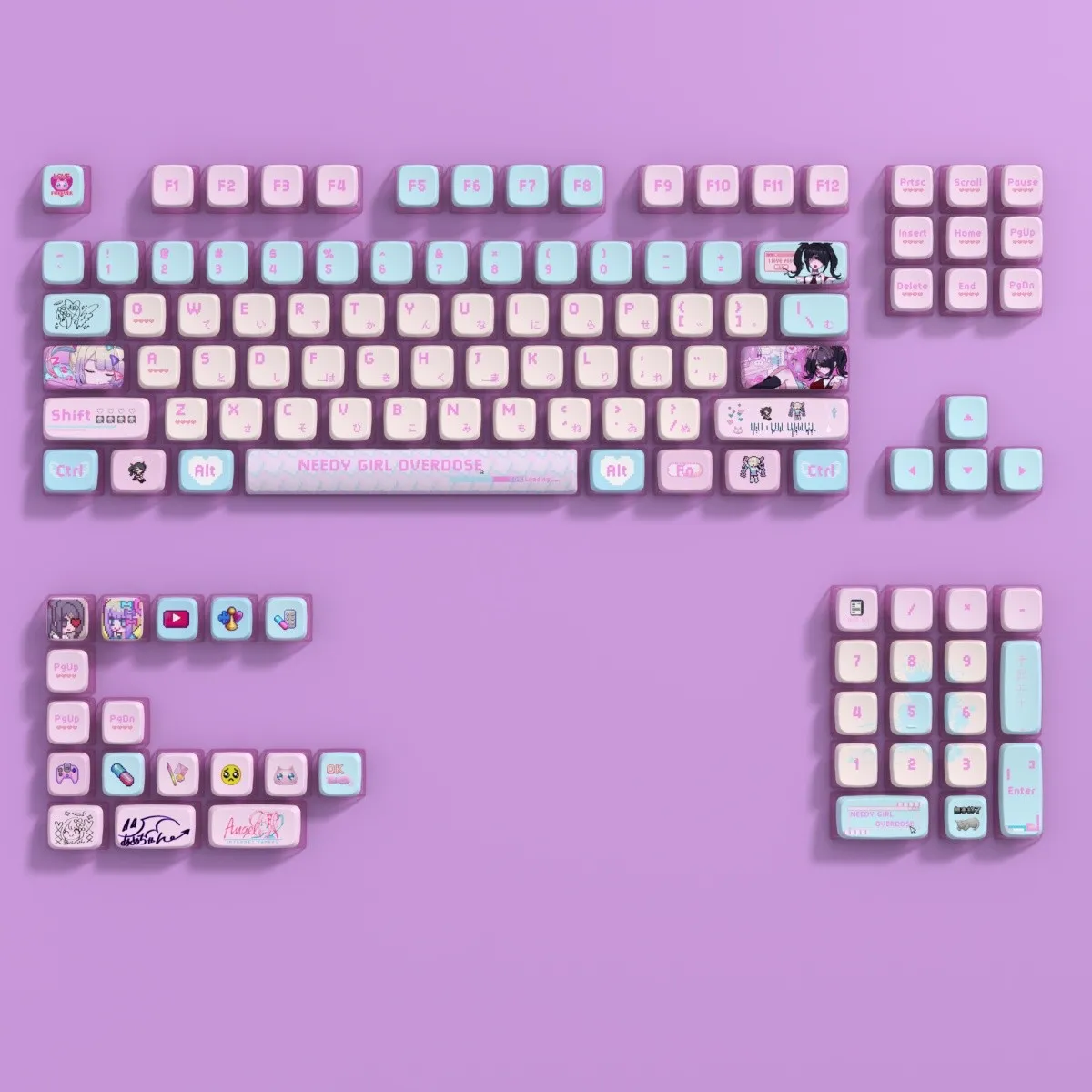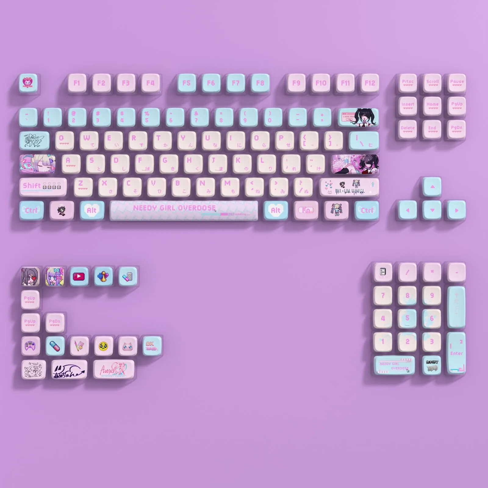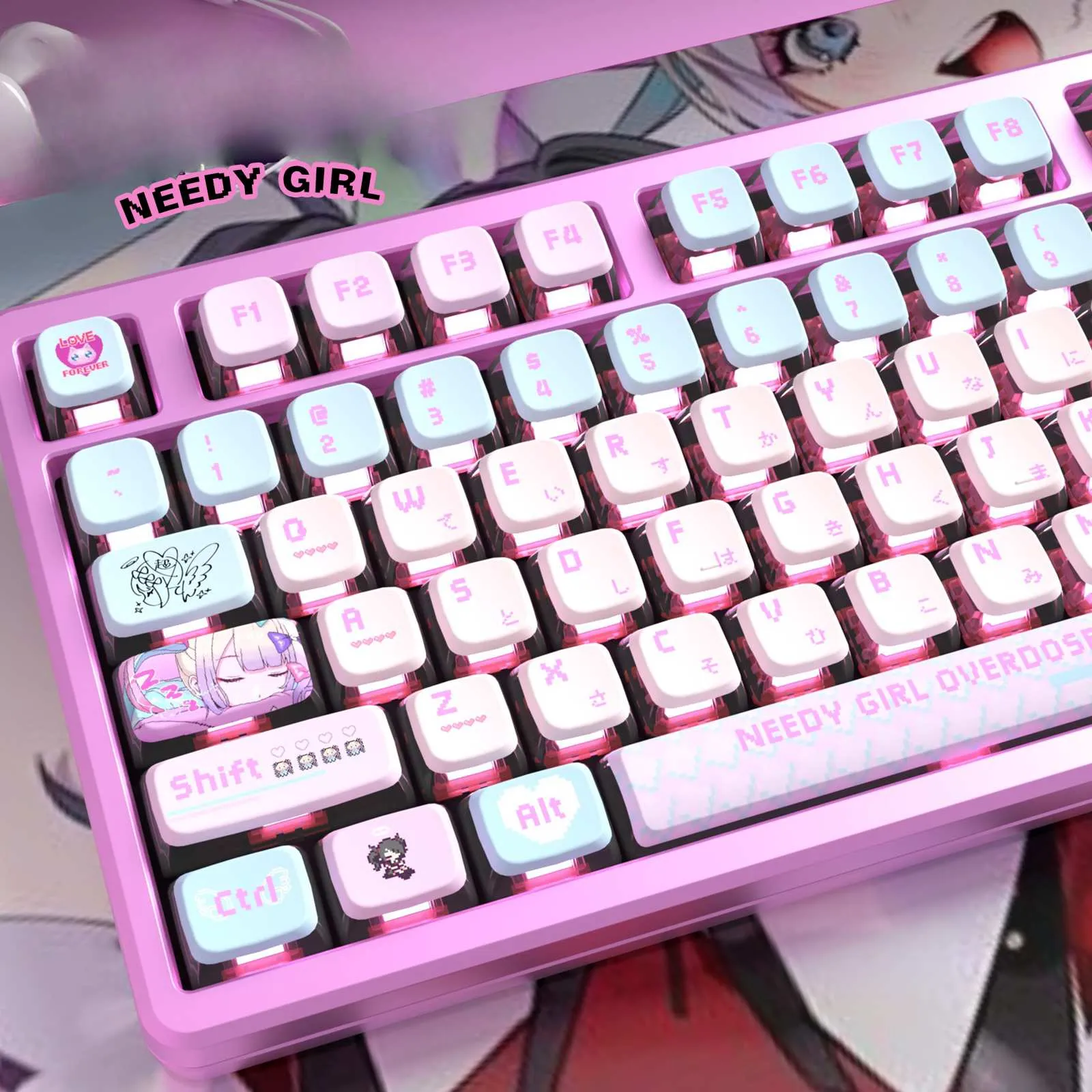 Elevate your typing experience with the Needy Streamer Overload: Ame-Chan OEM Keycap Set! For added style which select the upgraded Ame-Chan Keycap Set or the normal one. This set which has a light pink base and bright blue keycaps for sure to turn heads. Every keystroke is enjoyable because to the fun touch of the pink letters in a distinctive design. The Enter and Backspace keys are decorated with unique character icons that provide flair and functionality. This OEM keycap set is long lasting because it is made of sturdy PBT and PC materials. It adds fun and creativity to your setup. That making it ideal for gamers and streaming fans!