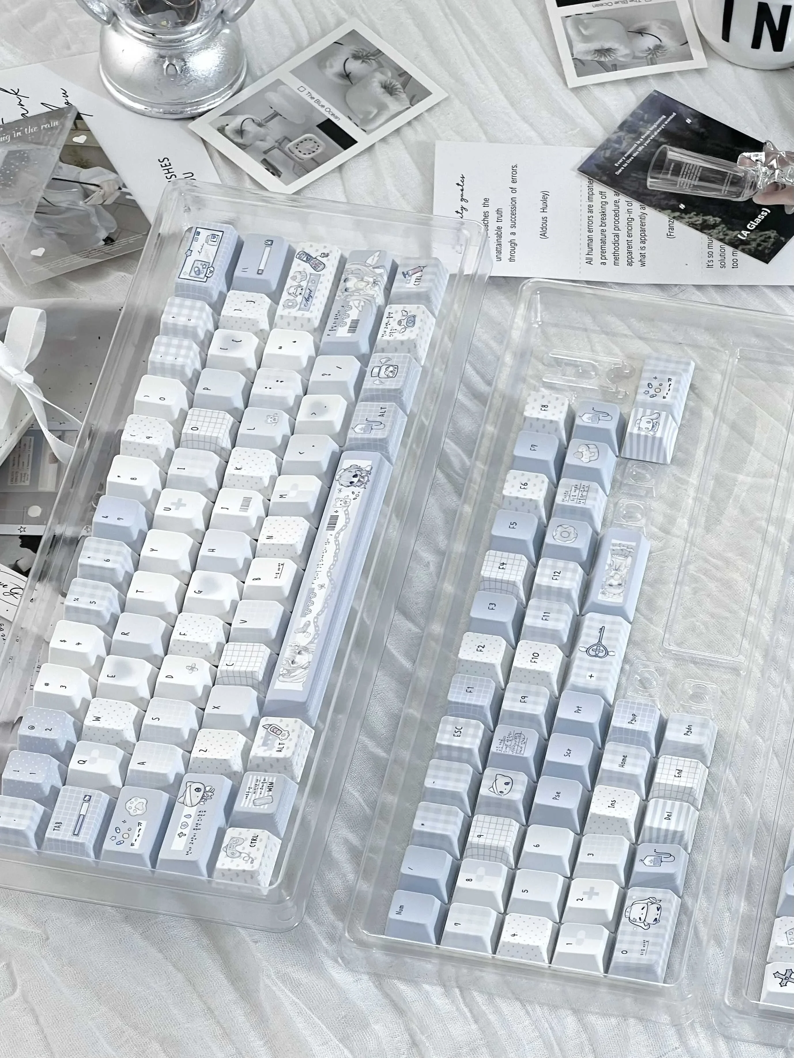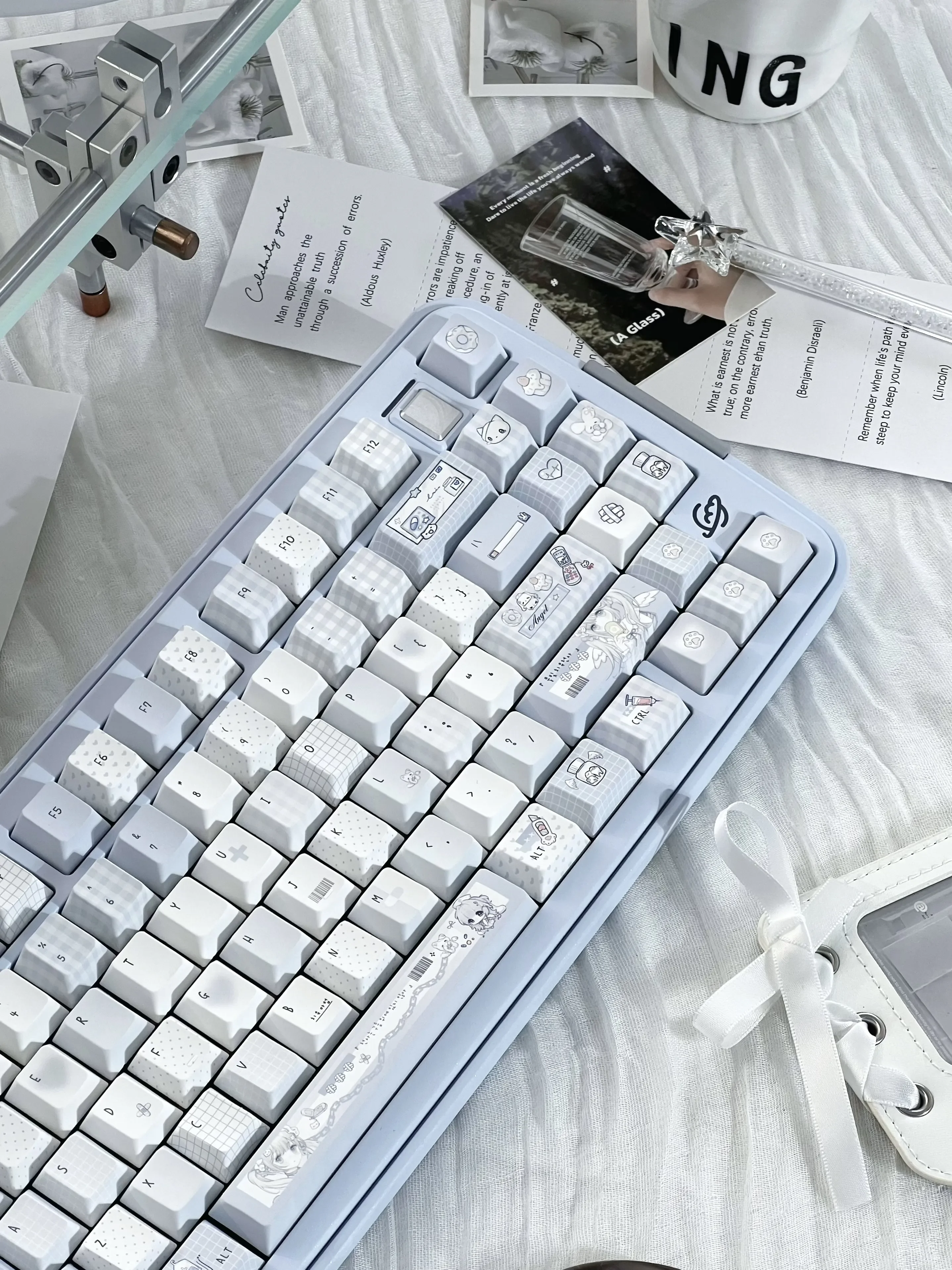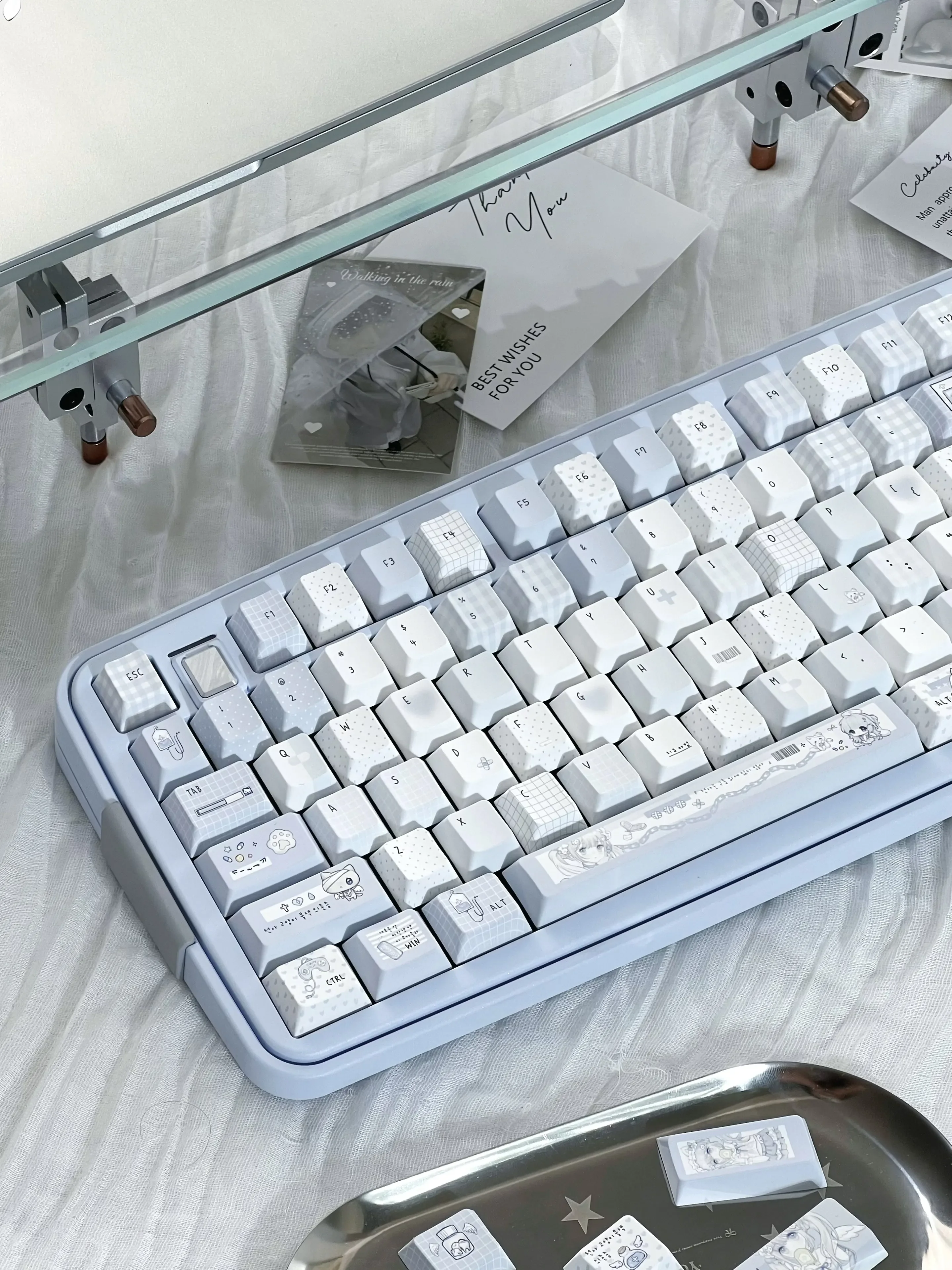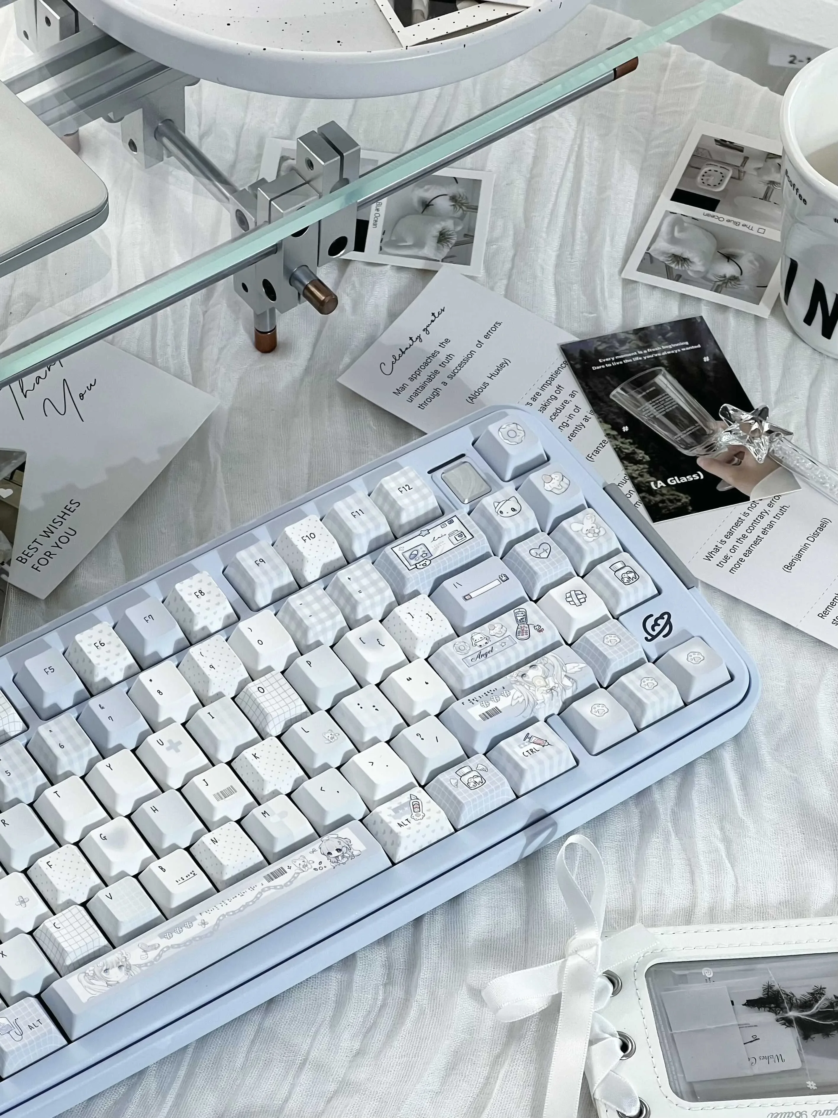 Discover a new realm of keyboard aesthetics with the Aqua Angel Cherry Keycap Set, designed to infuse your workspace with ethereal serenity and playful charm. These exquisite Aqua Angel PBT Keycaps boast unparalleled durability, crafted from high-quality PBT material to withstand the rigors of daily use while maintaining their pristine appearance. The angelic design, rendered through an exquisite five-sided dye-sublimation process, ensures that every detail, every subtle blue hue, is permanently etched onto the surface, resisting fade and wear. As a complete Cherry profile keycap set with 131 keys, it offers broad compatibility for various mechanical keyboard layouts, inviting you to personalize your setup with ease. Experience the delight of these cute blue keycaps, turning your keyboard into a captivating art piece and a source of calm inspiration. Perfect for creative personalization and collection, these dye-sub PBT keycaps promise a premium typing experience with an unmatched visual theme.