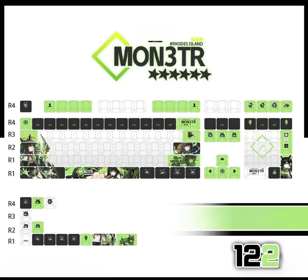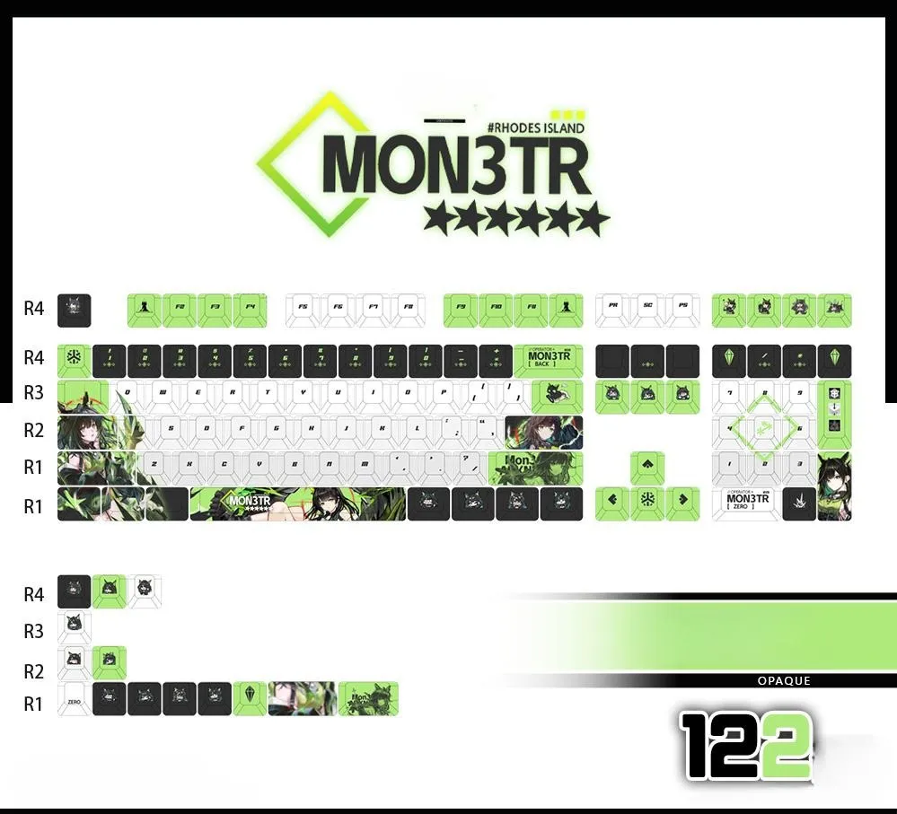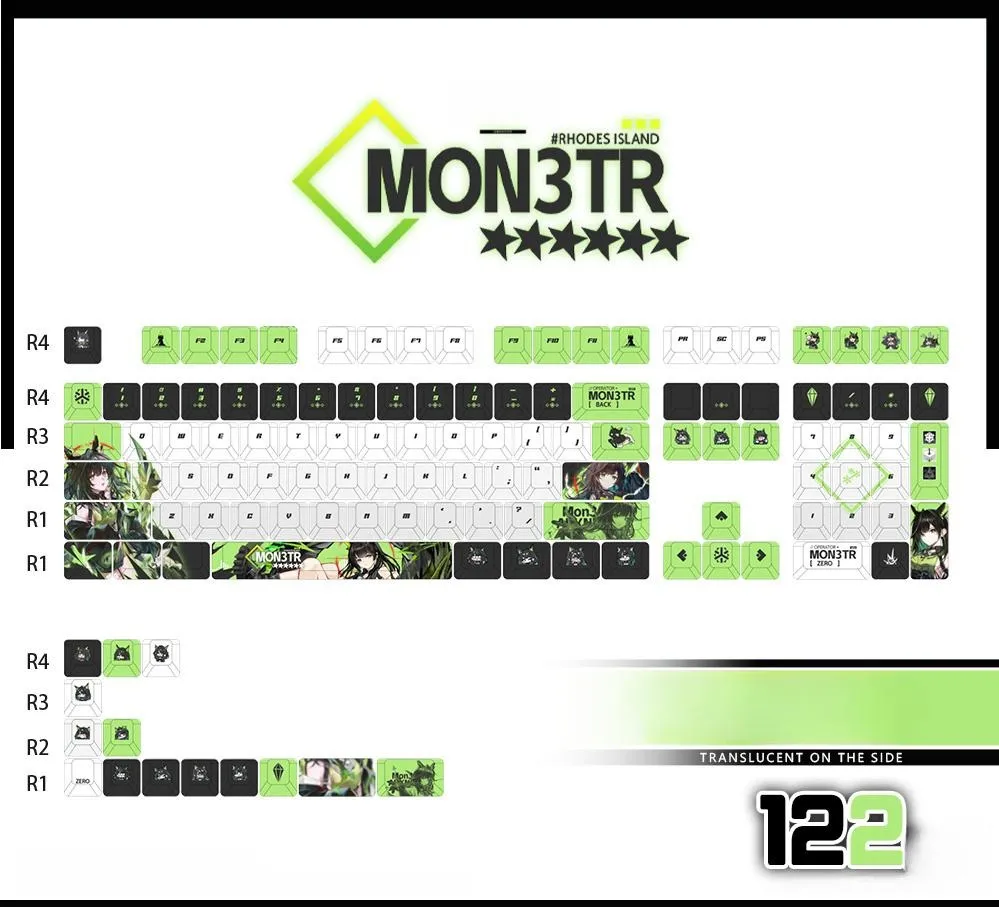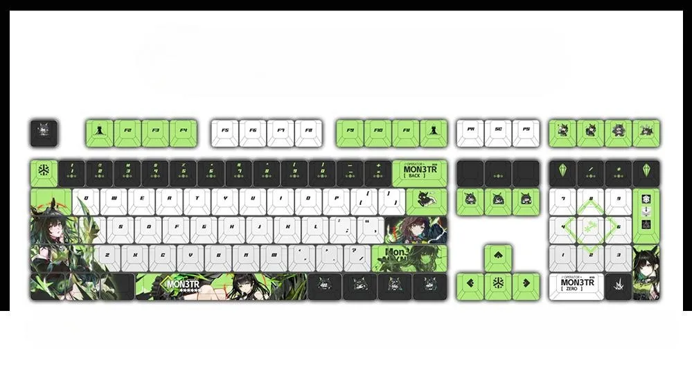 Make typing more enjoyable with the Arknights: Mon3tr Mechanical Keyboard and Cherry Keycap Set! There are fifteen possibilities with three different kinds of keycaps: opaque, side-lit and front-lit. Five options are included in each version that including different keyboard configurations and keycap sets with 122 keys. The distinctive green and black text is well contrasted with the sleek white base of the keycaps. While some keycaps have the name “Mon3tr” on the Space, Backspace and Shift keys. As others have cute character icons such as the ESC key. This set made from sturdy PBT in a cozy Cherry profile. Which is ideal for any Arknights supporter!