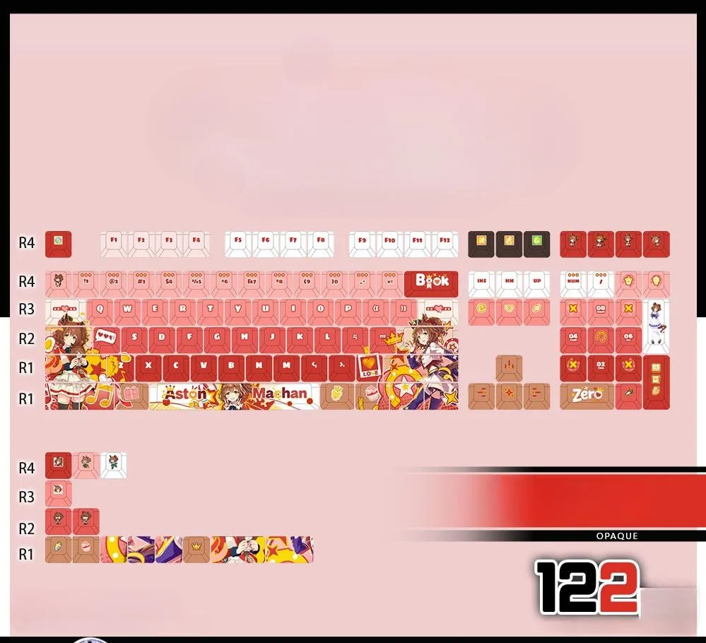 Upgrade your gaming experience with the gorgeous Uma Musume Pretty Derby: Aston Machan Mechanical Keyboard and Cherry Keycap Set! Each of the three eye-catching keycap varieties—Front-Lit, Side-Lit and Opaque. Which offers five distinct alternatives. Choose from keyboards with 87, 108 or tri-mode versions for smooth connectivity. With personalize your experience with keycap sets that include 122 keys. The sophisticated white and brown keycaps are complemented by the vivid red base Which certain keycaps have endearing character symbols. The name “Aston Machan” displayed with pride on the space key. While a cute heart-shaped emblem on the tab key. These Cherry-profiled which is long-lasting PBT keycaps blend fashion. That utility for the best possible gaming experience!