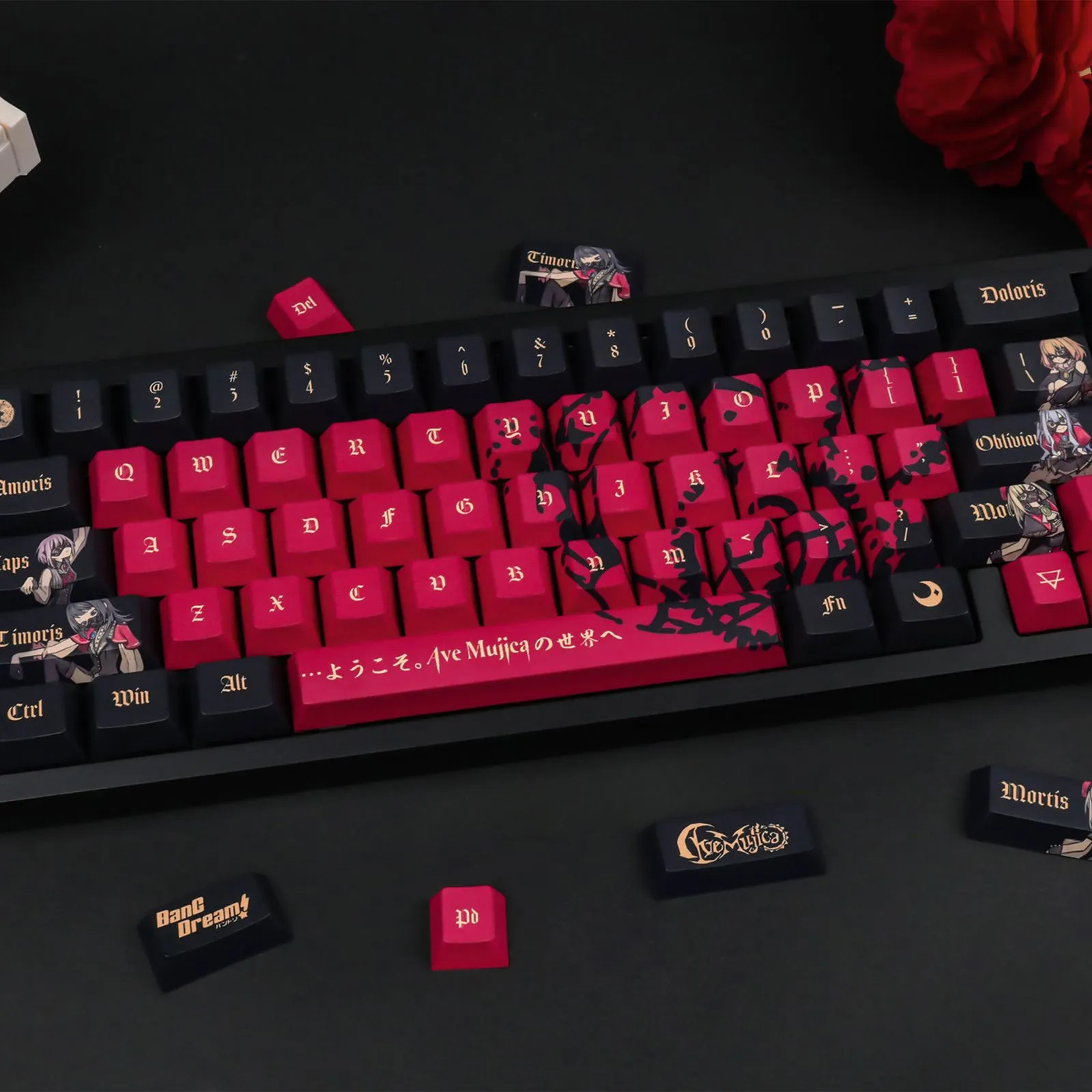 Unleash your passion for music with the BanG Dream! Ave Mujica: Band Keycap Set & Mechanical Keyboard! A Band Keycap Set or a wired/wireless keyboard with different switch kinds (red, brown, blue, or black). Which are among the nine alternatives available. Orange lettering in a distinctive font style highlights the products. Which the sleek black keycaps and vivid red foundation of this eye-catching design. Character icons give your system a unique touch by adorning keys like Enter, Shift and Caps. “Ave Mujica” that shown with pride on the Space key and a cute moon emblem on the Esc key. This keyboard set which is made of sturdy PBT material. That blends design and practicality to provide an amazing typing experience!