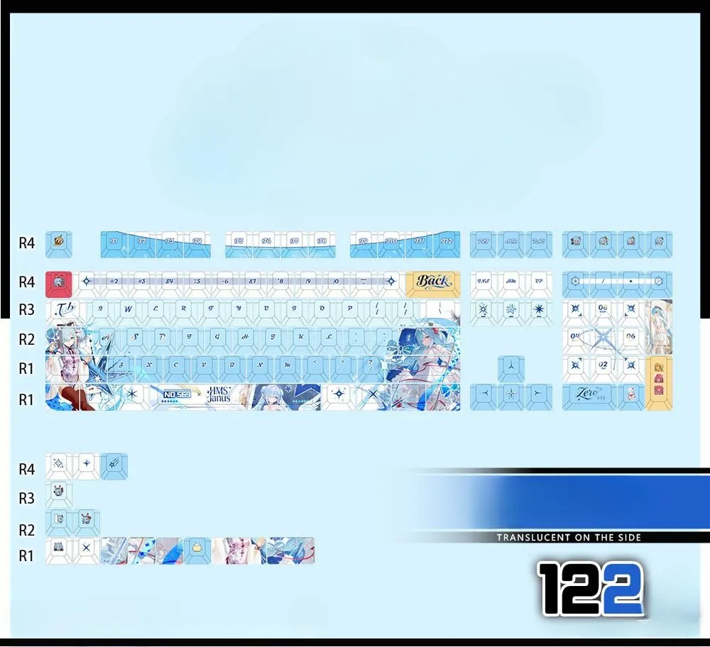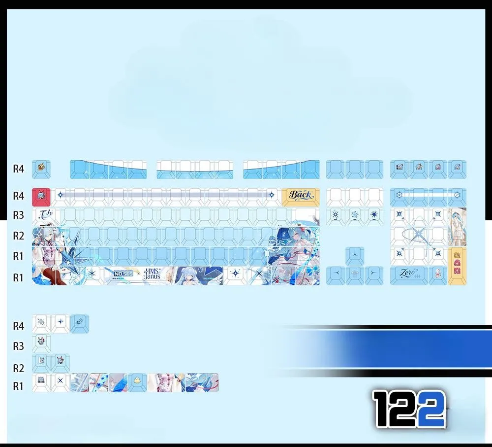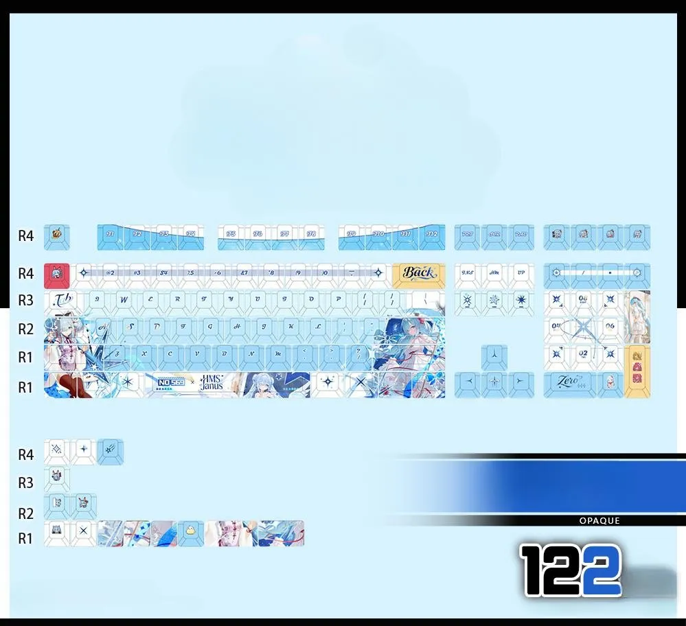 Transform your typing experience with the stunning Azur Lane: Janus Cherry Keycap Set & Mechanical Keyboard! There are fifteen alternatives in this set which includes three kinds of keycaps: opaque, side-lit and front-lit. Five options are available for each version. That including Tri-Mode Keyboards with 87 or 108 keys and Keycap Sets with 122 keys. Eye-catching white, yellow and red keycaps. Which with blue and white lettering in a distinctive font style compliment the vivid blue series base. The Enter and Shift keys have character images and the Space key has “Janus.” These Cherry profile keycaps which are made of sturdy PBT. That are the ideal blend of fashion and utility!