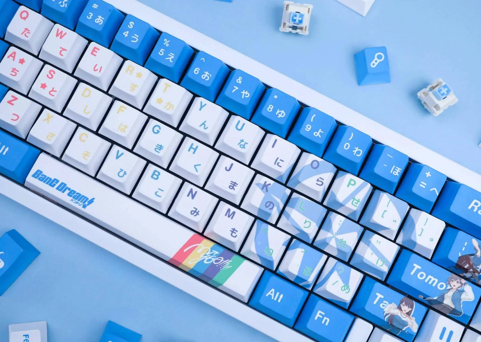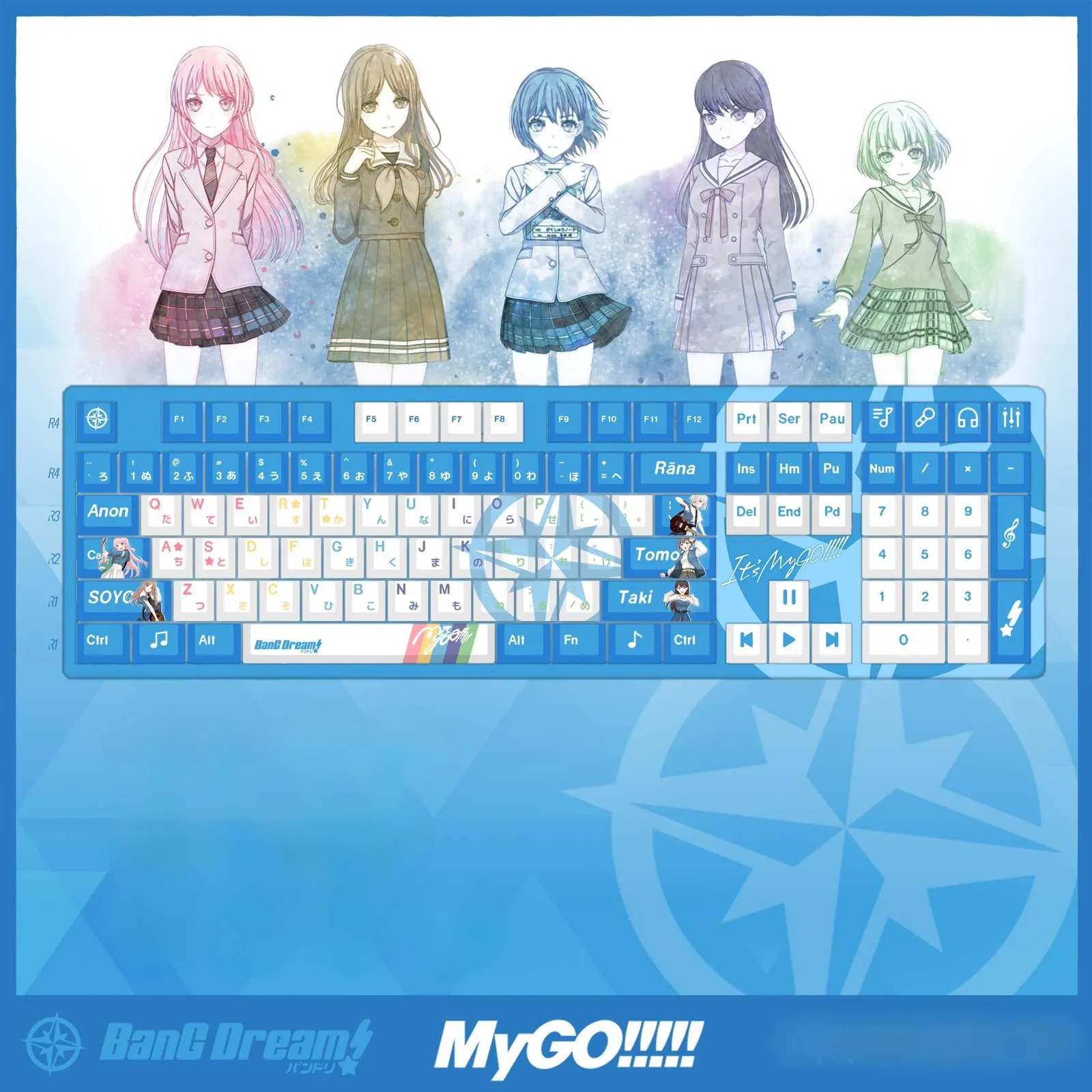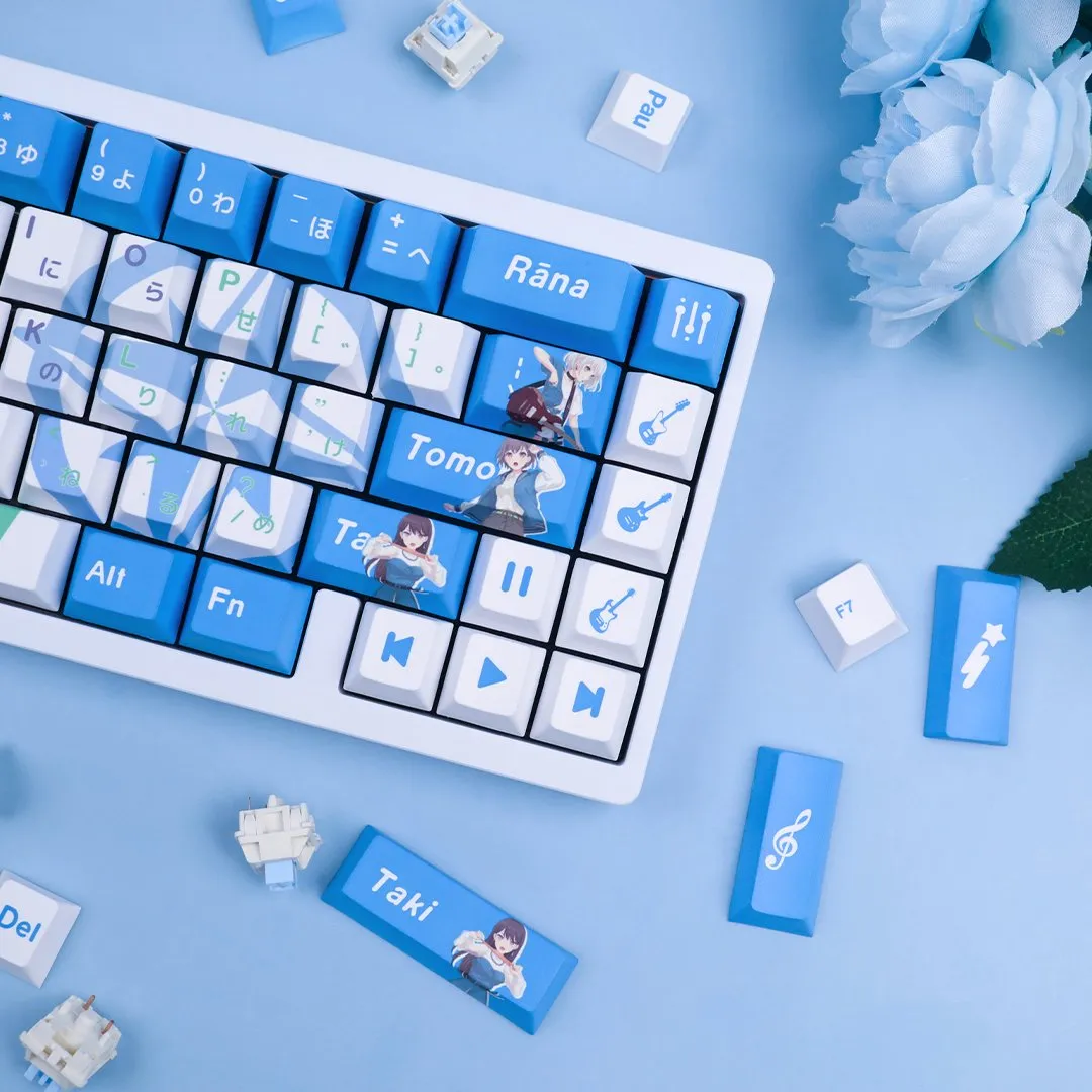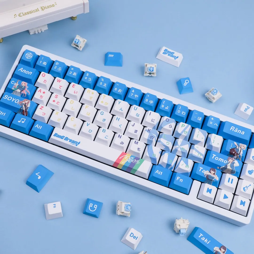 Transform your typing experience with the BanG Dream! It’s MyGO!!!!!: Character Keycap Set & Mechanical Keyboard! For maximum customization that select between keycap set, wired and wireless keyboards. Which keyboard version was with switches that are red, brown, blue or black option. Vibrant blue keycaps elegantly compliment the bright white base. That making for an eye-catching arrangement. To add a playful touch, a number of keycaps display character icons such as the Enter, Shift and Caps keys. The directional keys have icons for play, pause and next icon design. While musical instrument icons add to the theme on some keycaps as well. With its proud display of “BanG Dream” on the Space Key stands out. These keycaps made of sturdy PBT material that are ideal for any lover of BanG Dream!