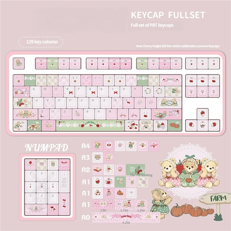Transform your mechanical keyboard into a delightful escape with our Picnic Bear Cherry Keycap Set. Each keycap tells a part of a charming picnic diary, featuring adorable bears enjoying a sunny day amidst pastel hues and nature-inspired motifs. This PBT keycap set brings a touch of joyful nostalgia and playful aesthetics to your desk. Crafted from premium, durable PBT material, these dye-sub keycaps ensure legends remain crisp and vibrant. The Cherry height provides a comfortable and ergonomic typing experience, perfect for long creative sessions or gaming marathons. More than just a keyboard accessory, these cute bear keycaps are an invitation to personalize your setup with unique style. Elevate your workspace with this whimsical keycap set and let every keystroke transport you to a serene, charming picnic scene.