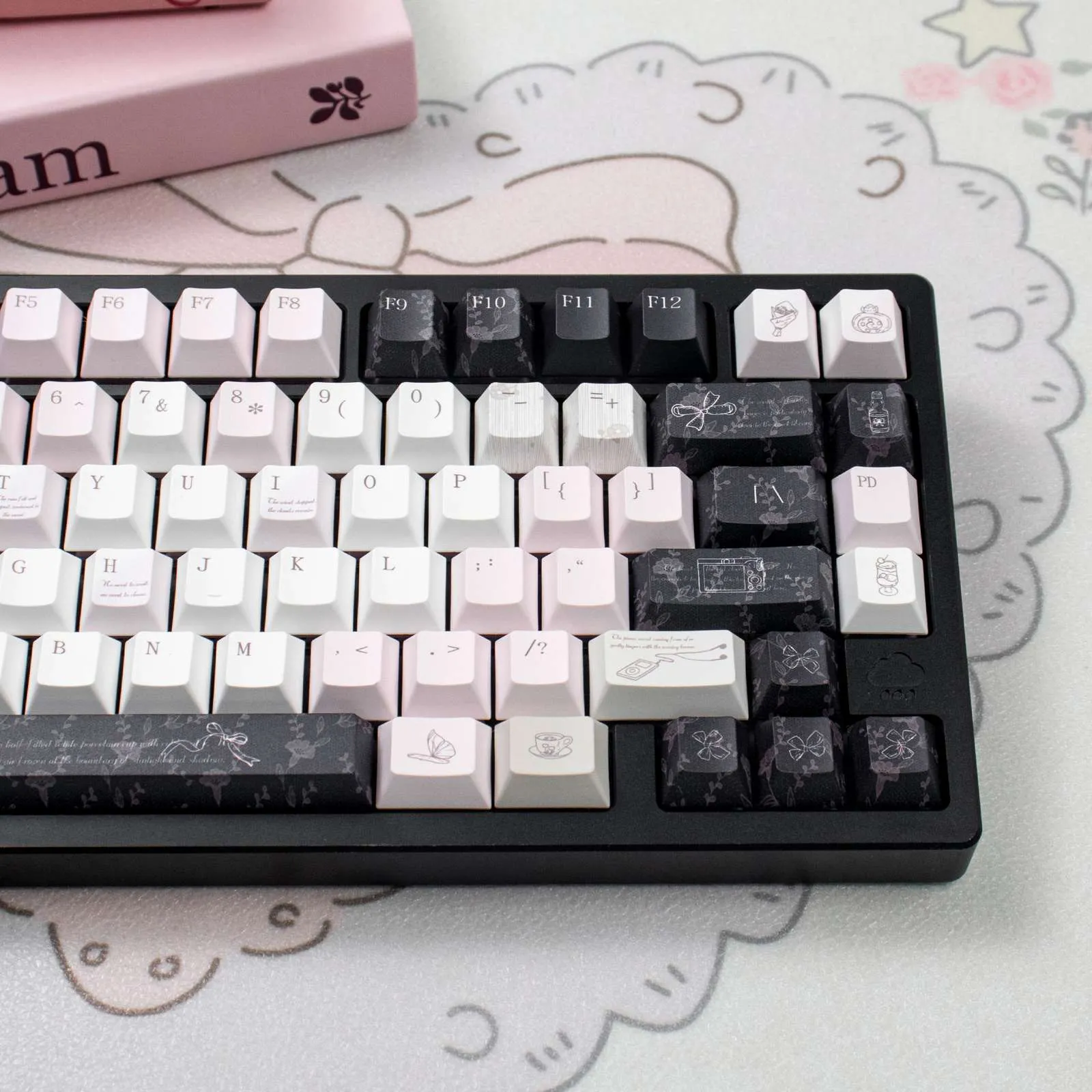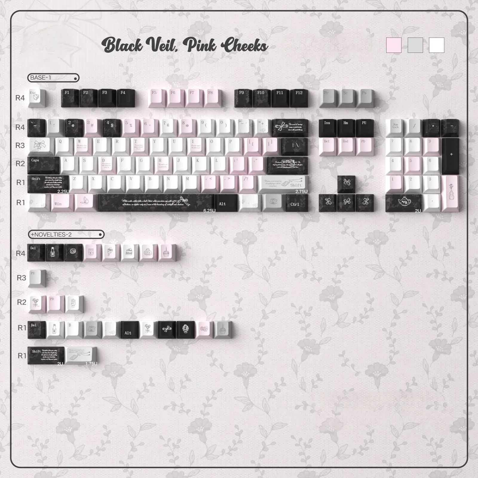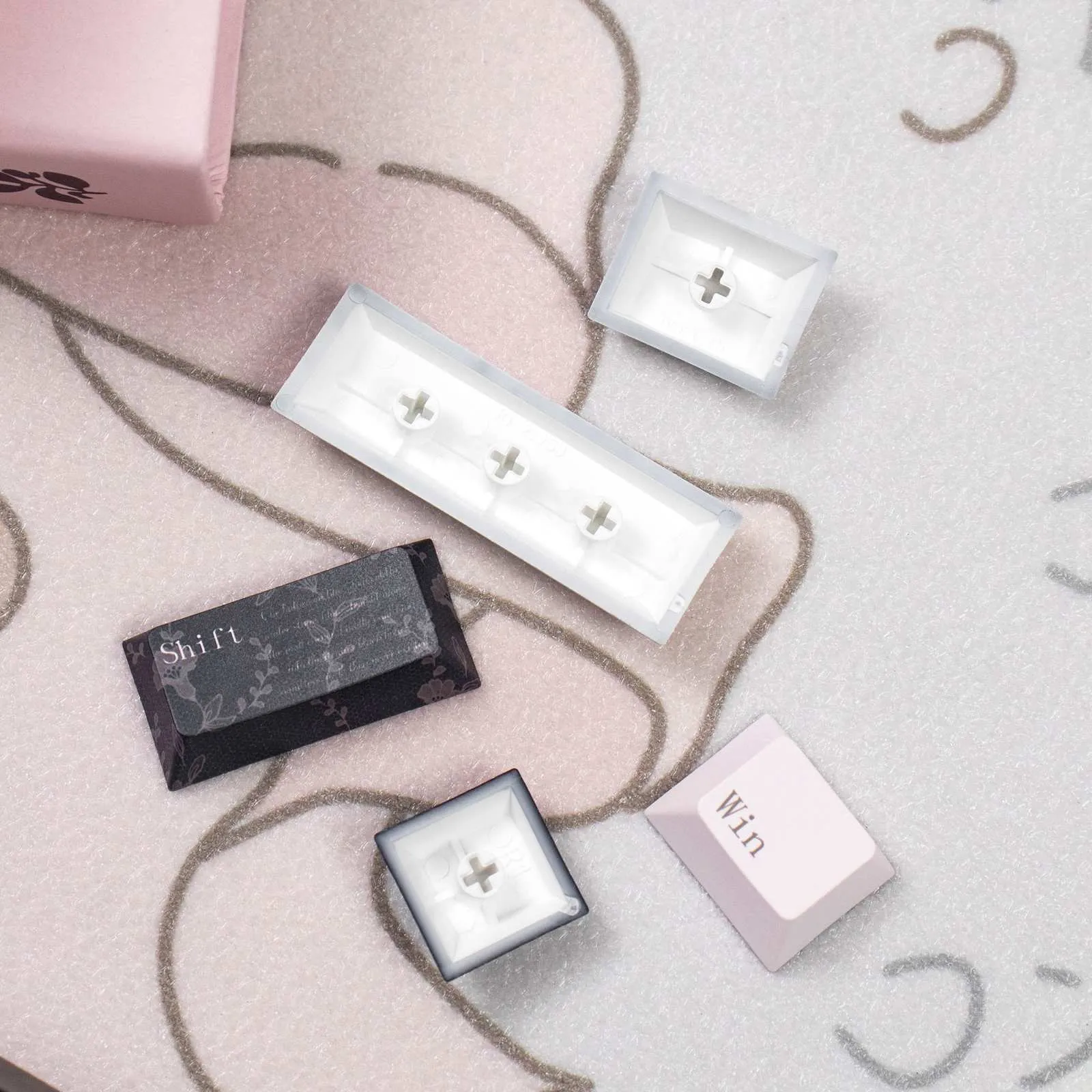 Utilize the gorgeous Black Veil Pink Cheeks Cherry Keycap Set to enhance your typing experience! Bright pink and black keycaps contrast with a sleek white base in this gorgeous set. The sophisticated black writing gives your keyboard a refined look. The overall appearance is improved by the adorable flower and leaf icon designs that grace several keycaps. These keycaps’ extended lifespan and robustness are guaranteed by their sturdy PBT construction. They offer a comfortable typing experience with a typical Cherry profile. This keycap set is essential for any keyboard aficionado. That is ideal for people who value both appearance and practicality. Change your configuration and relish each keystroke!