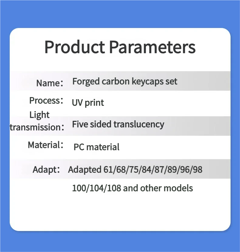 Discover the ultimate upgrade for your mechanical keyboard with our Exclusive Blue Forged Carbon Texture Keycap Set. Designed for discerning enthusiasts, these Forged Carbon Keycaps transform your typing experience into a statement of sophistication. Each keycap features a dynamic blue forged carbon aesthetic, meticulously crafted to blend cutting-edge modern tech with unique artistry. Made from durable Blue PC Keycaps, they offer a premium feel and lasting vibrancy. The sleek Side-Printed Keycaps ensure a clean, minimalist look while providing clear legend visibility from your typical viewing angle. With an ergonomic Cherry Profile Keycaps design, comfort is paramount during extended gaming sessions or productive work. Elevate your desk setup with this exclusive collection, embodying both performance and unparalleled style.