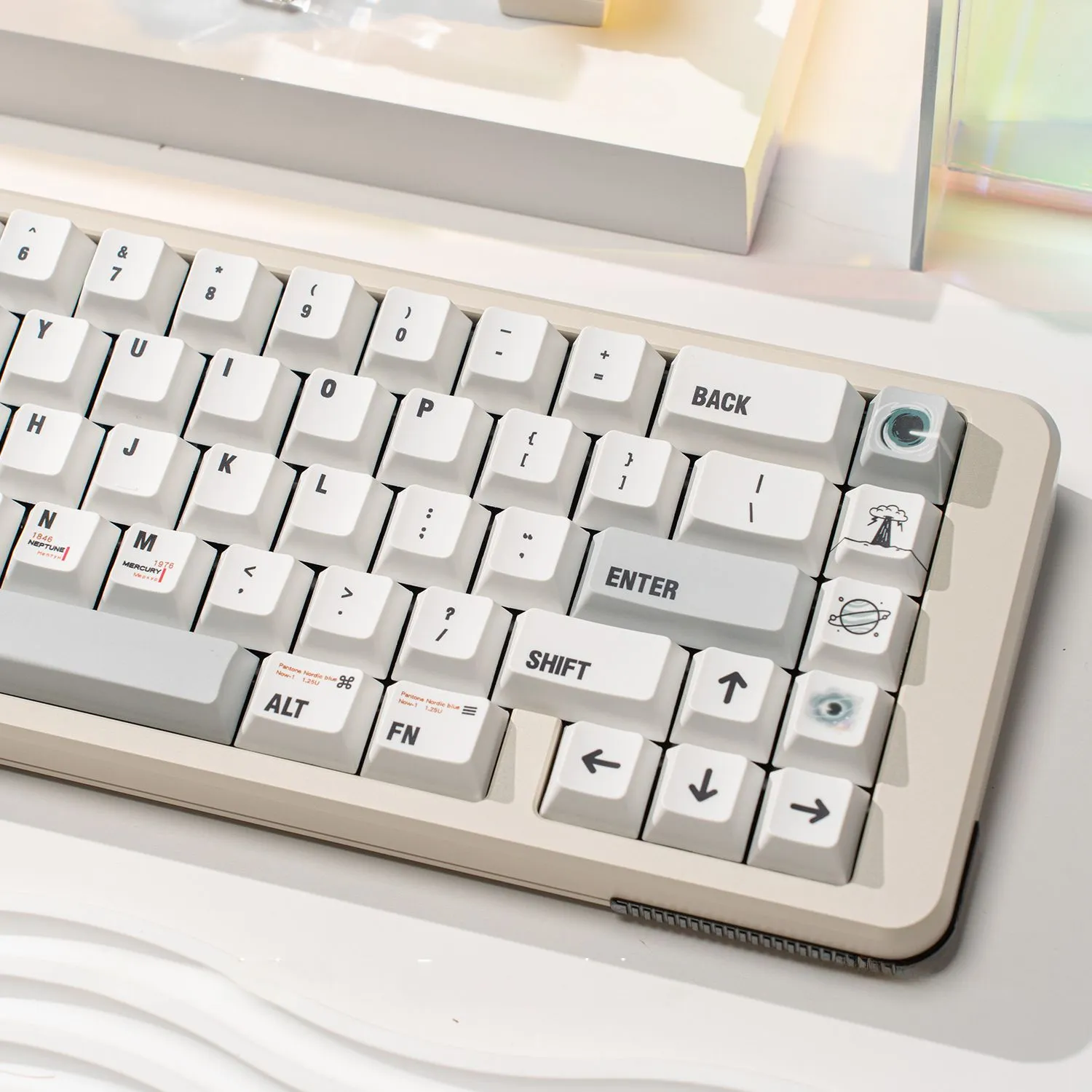 Illuminate your typing experience with the Brightness Series Keycap Set! Each of the four options in this adaptable collection. Which are divided into OEM and MO sets that comes in either bag or box packaging. This set produces a sophisticated visual style with its sleek white base and sophisticated grey keycaps. Some keycaps give your keyboard a cosmic flair by featuring quirky icons of the sun, moon and planets. The unique font style and black letters on each keycap add flair and readability. These keycaps are made from sturdy PBT material. That are intended to endure regular use without losing their gorgeous hues. Use the Brightness Series Keycap Set to add some color to your workstation!
