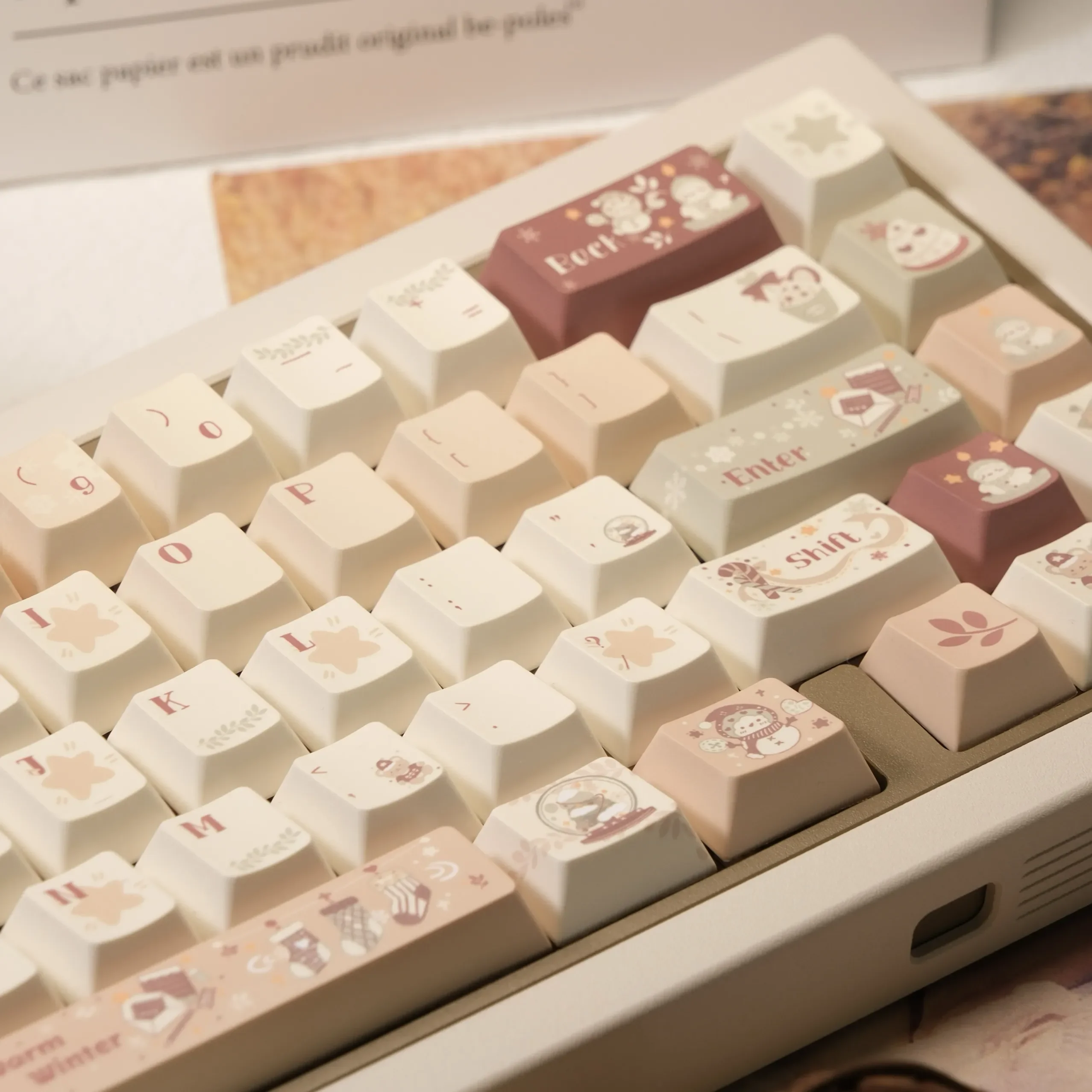 Evoke a comforting sense of warmth and sweet nostalgia with our exquisite Caramel Winter Cherry Keycap Set. Designed to transform your desk into a snug winter haven, this premium PBT Keycap Set offers an unparalleled tactile and visual experience for your custom mechanical keyboard. Immerse yourself in a cozy aesthetic with the rich, inviting palette of caramel, cream, and soft browns, meticulously crafted to deliver a truly luxurious feel. These Cherry Profile Keycaps are not only stunning but also engineered for superior durability and a comfortable typing experience, making them perfect for your cozy workspace. Upgrade your Warm Tone Keyboard and create an inviting atmosphere that enhances productivity and relaxation alike. Embrace the exceptional quality and unique charm of our Caramel Keycaps and make every keystroke a delight.