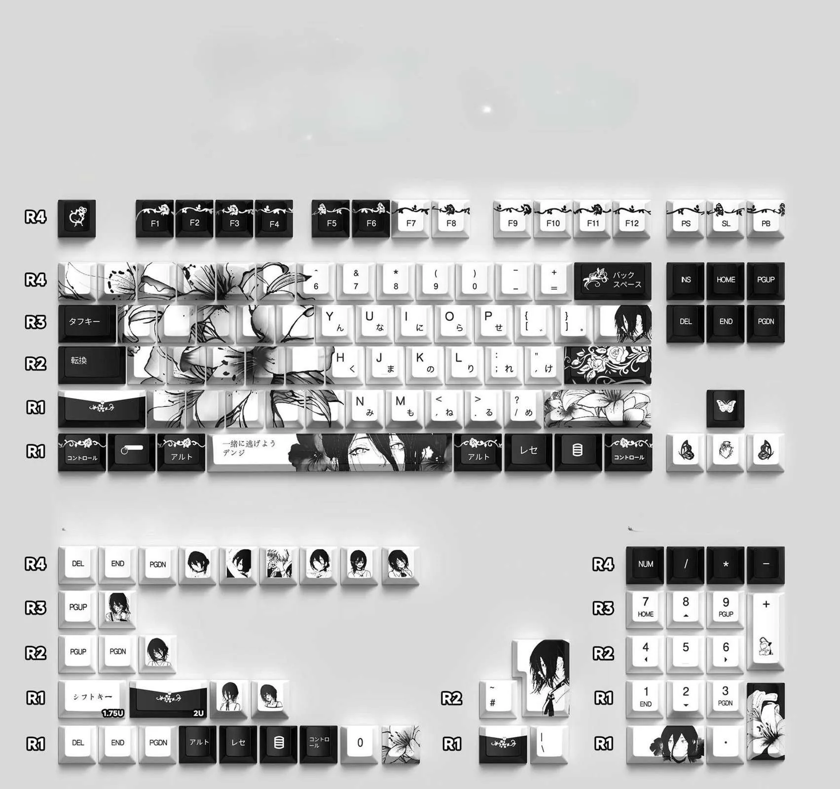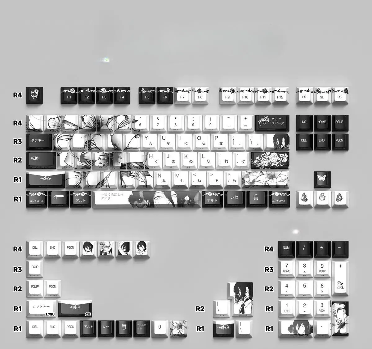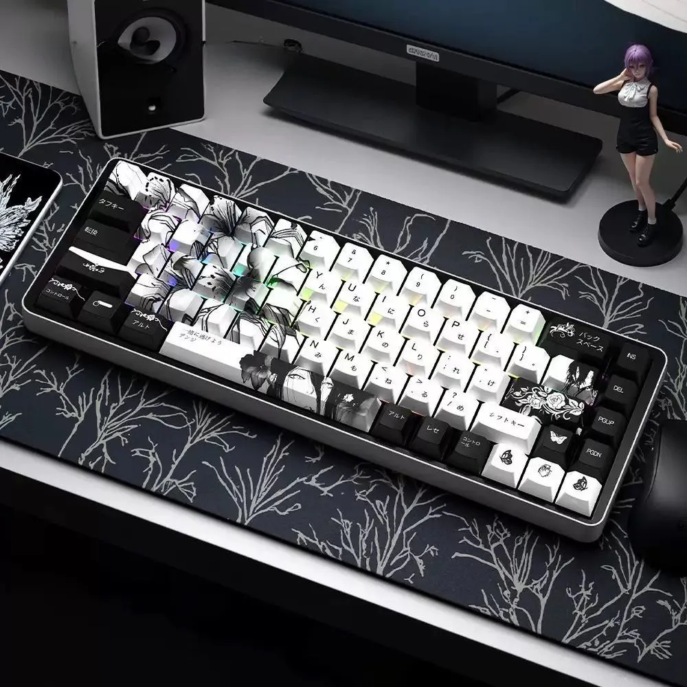 Elevate your keyboard game with the Chainsaw Man: Reze Themed Cherry Keycap Set! This gorgeous collection comes with two varieties. Which including Front Lettering Keycap Set with 135 keys and Side Lettering Keycap Sets with 74 or 129 keys. Every keycap features a dramatic black keycap that contrasts sharply with a sleek white base. In addition to improving readability which the black and white lettering gives it a contemporary look. The Space Key with character icon that feature Reze’s persona. While directional keys are decorated with distinctive symbols that with a pretty butterfly. This set which is made of sturdy PBT in a cherry profile. That blends fashion and utility for all fans!