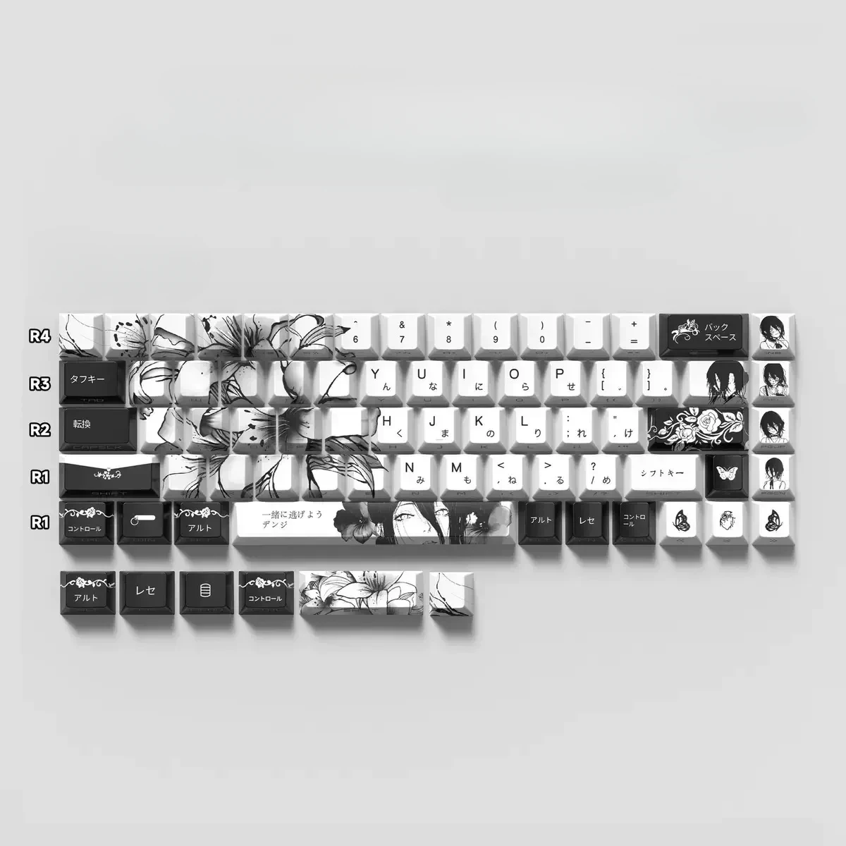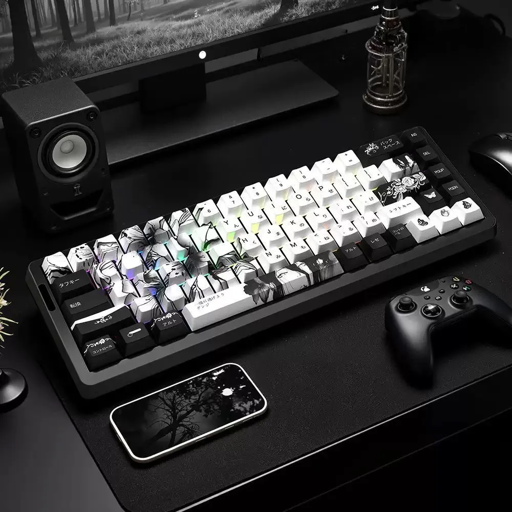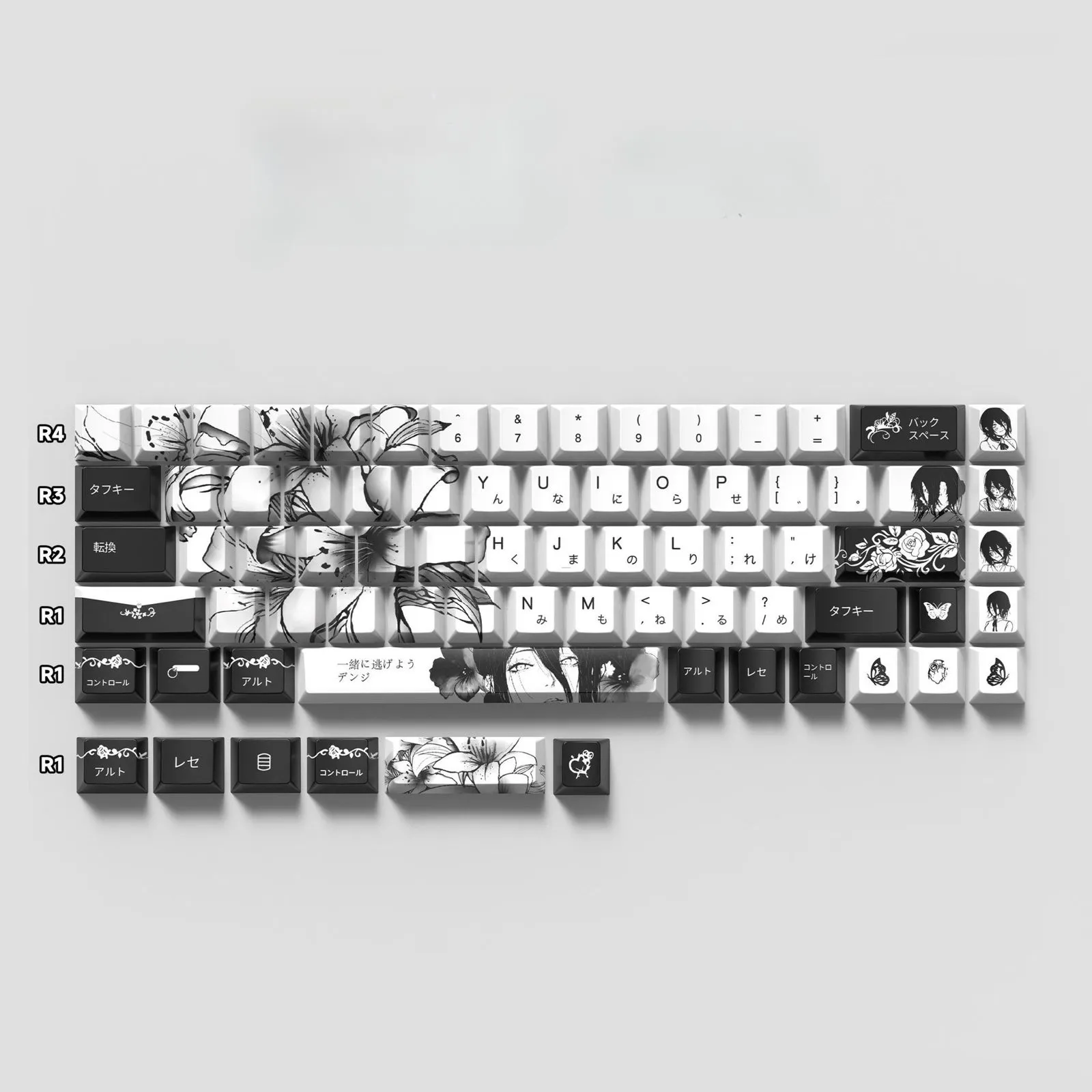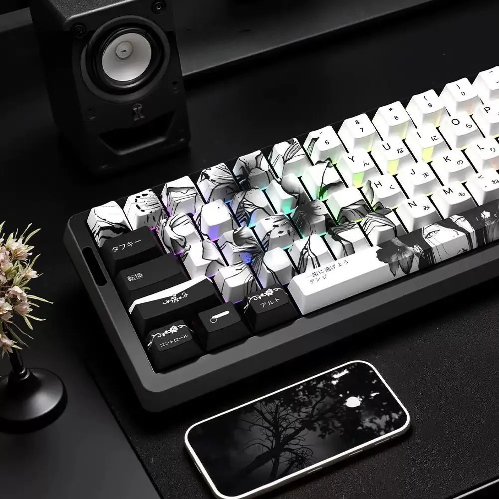 Elevate your keyboard game with the Chainsaw Man: Reze Themed Cherry Keycap Set! This gorgeous collection comes with two varieties. Which including Front Lettering Keycap Set with 135 keys and Side Lettering Keycap Sets with 74 or 129 keys. Every keycap features a dramatic black keycap that contrasts sharply with a sleek white base. In addition to improving readability which the black and white lettering gives it a contemporary look. The Space Key with character icon that feature Reze’s persona. While directional keys are decorated with distinctive symbols that with a pretty butterfly. This set which is made of sturdy PBT in a cherry profile. That blends fashion and utility for all fans!