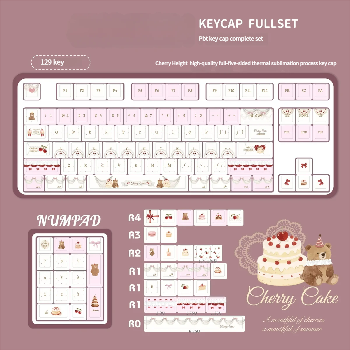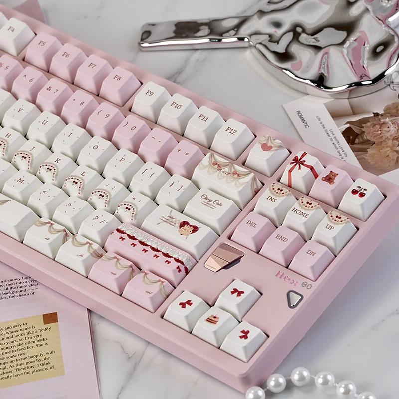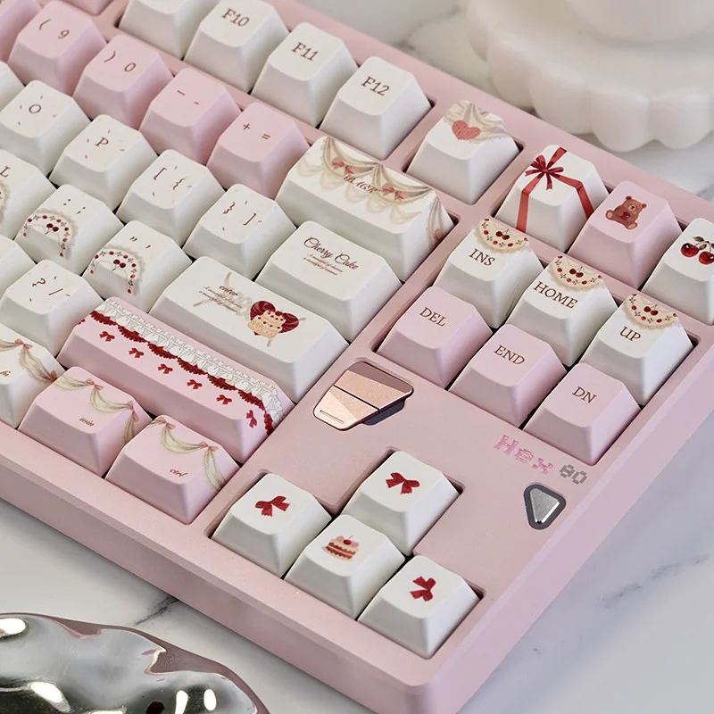 Transform your daily typing into a delightful experience with our Cherry Cake Cherry Keycap Set! Infuse your desk setup with a sweet, whimsical charm, boasting a charming pastel pink aesthetic adorned with playful cherry and cake motifs. Crafted from premium PBT material, these dye-sub PBT keycaps offer superior durability and resistance to shine. Which ensuring your legends remain crisp and vibrant for years. Designed in the popular Cherry profile keycaps, they provide a comfortable and familiar typing feel. Perfect for keyboard enthusiasts seeking to personalize their space, these dessert theme keycaps are more than just custom keyboard accessories. As they’re a daily dose of delight. Elevate your creative workspace or collection with these unique pink aesthetic keycaps and let your personality shine!