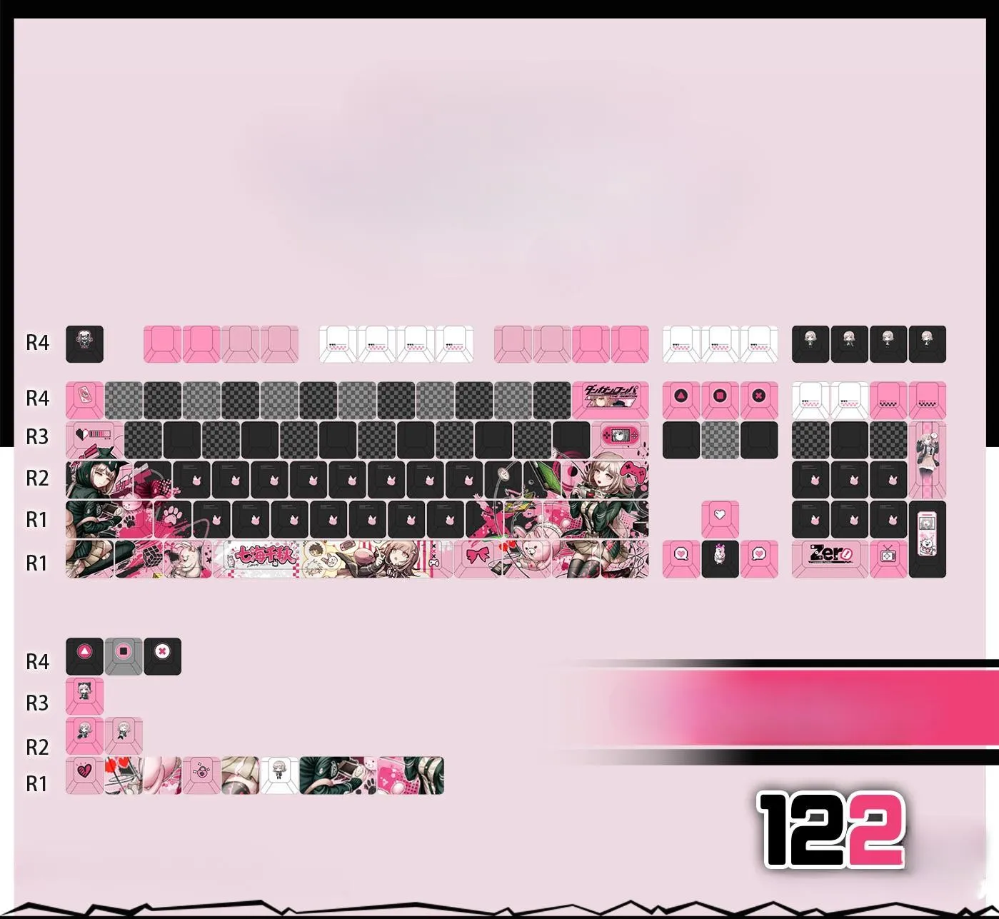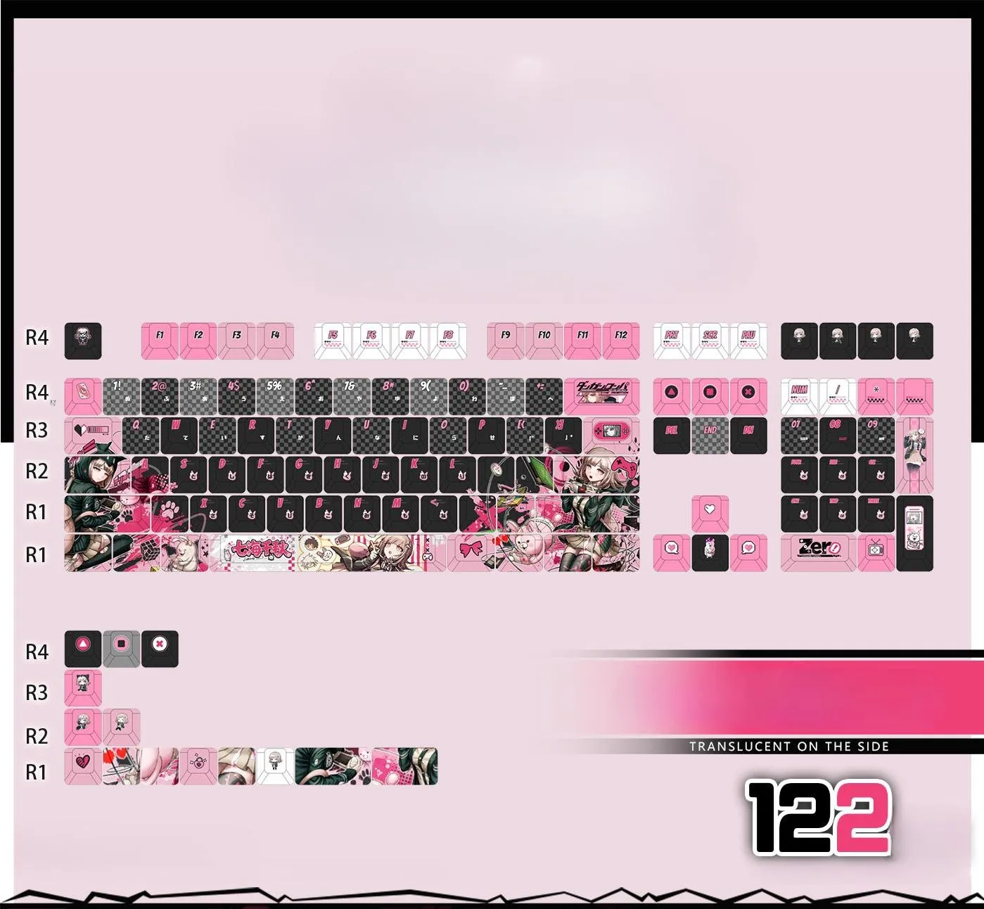 Transform your typing experience with the Danganronpa 2: Goodbye Despair: Chiaki Nanami Cherry Keycap Set & Mechanical Keyboard! Front-Lit, Side-Lit and Opaque are three gorgeous keycap styles with five possibilities each. Choose from keyboards with 87 or 108 keys that including tri-mode models or a keycap set with 122 keys. Keycaps with distinctive checkerboard art designs in shades of pink, white and grey compliment the sleek black base. Keycaps feature cute character symbols, such as the ESC Key and distinctive black and pink text. Additional flair on directional keys as with heart-shaped symbols. Keycaps made of sturdy PBT in a traditional Cherry profile that perfect for typist, gamers or others.