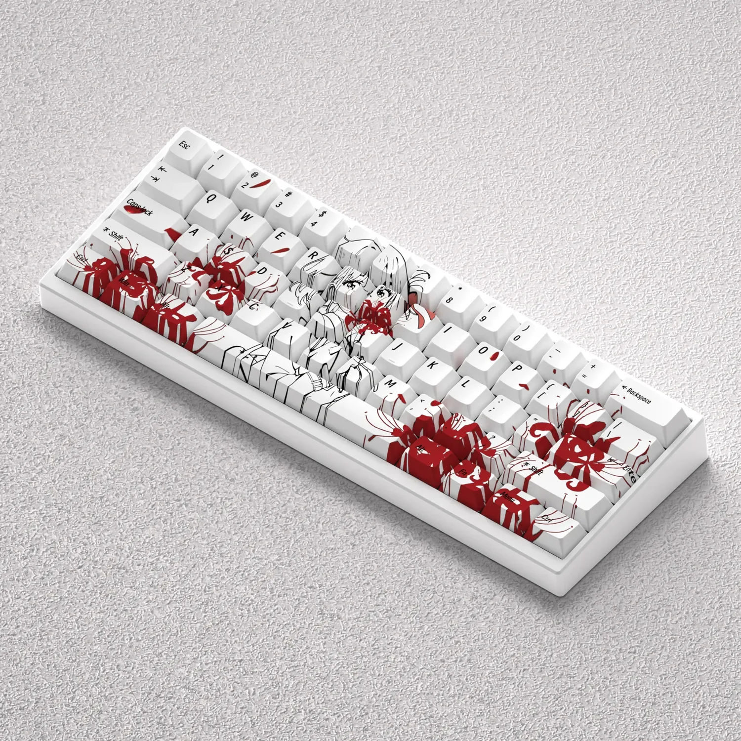 Unleash your fandom with subtle elegance using our exclusive Lycoris Recoil: Chisato Nishikigi Cherry Keycap Set. This PBT keycap set, a sophisticated homage to Lycoris Recoil, transforms your keyboard into a personalized artistic statement. Each keycap features crisp, front-printed legends, revealing minimalist anime art that resonates with your fandom pride without dominating your workspace aesthetic. Crafted from durable PBT material, these Anime PBT Keycaps offer exceptional longevity and a satisfying texture, resisting shine for lasting beauty. They seamlessly fit 60 Percent Keyboard Keycaps and other 60%, 65%, 68% layouts. More than an upgrade, these Lycoris Recoil Keycaps are an expression of identity, blending premium craftsmanship with your unique style. Elevate your personal workspace with this distinctive set.
