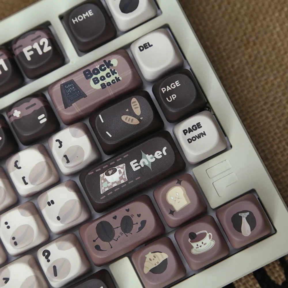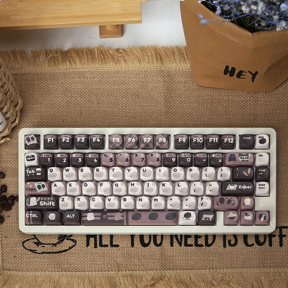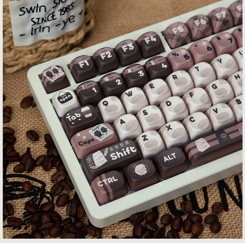 Grab the adorable Coffee Bean MOA Keycap Set to change the look of your keyboard! This set is ideal for coffee aficionados with its chic beige base and rich brown keycaps. Charming coffee bean symbols decorate the majority of keycaps that giving your setup a whimsical touch. The entire appearance is improved by the distinctive font style of the black and white text. For a playful twist the directional keys display adorable designs such as bread, coffee and other icons. These keycaps’ quality feel and lifespan are guaranteed by their sturdy PBT construction. Enjoy typing more with this exquisitely designed keycap set that honors your passion for coffee!
