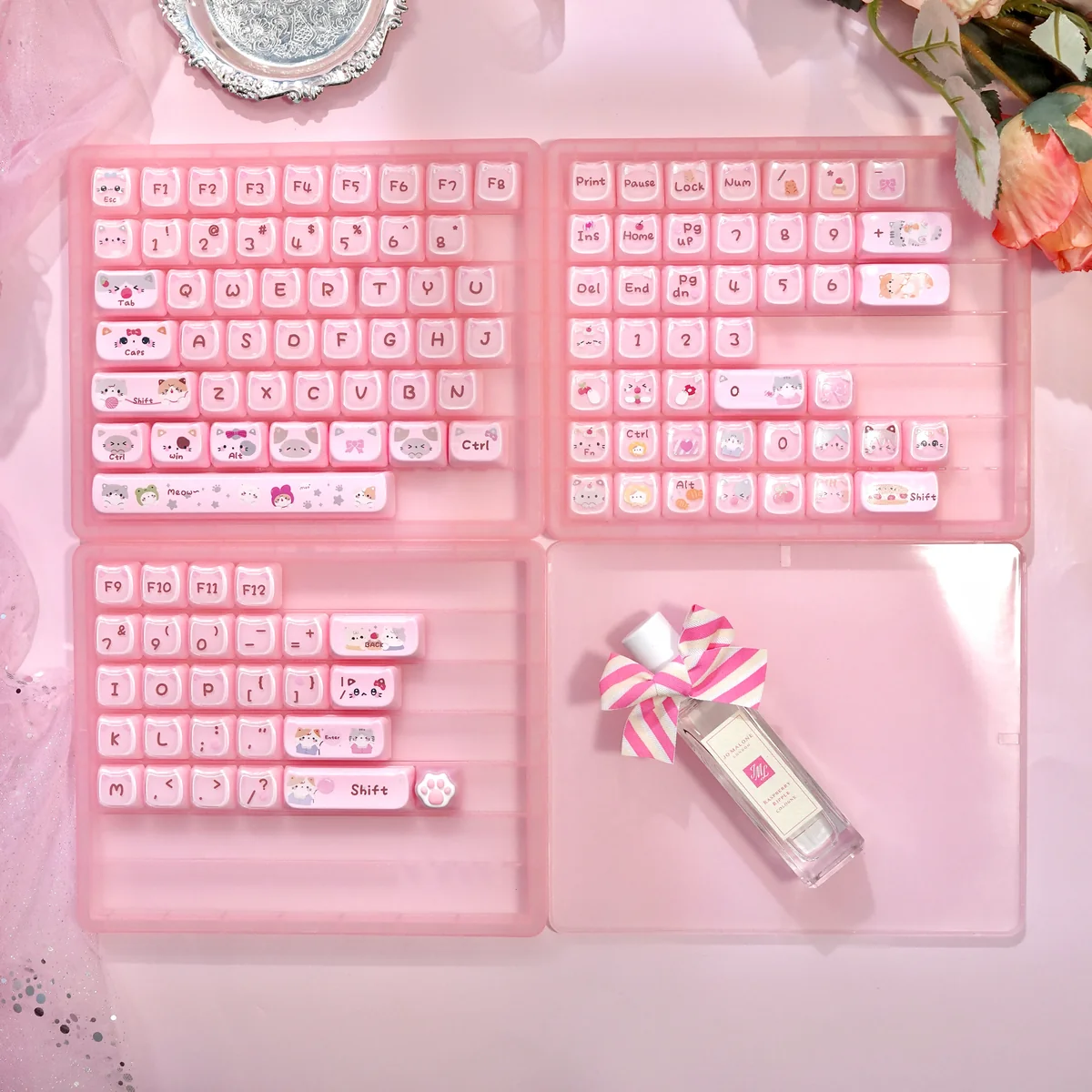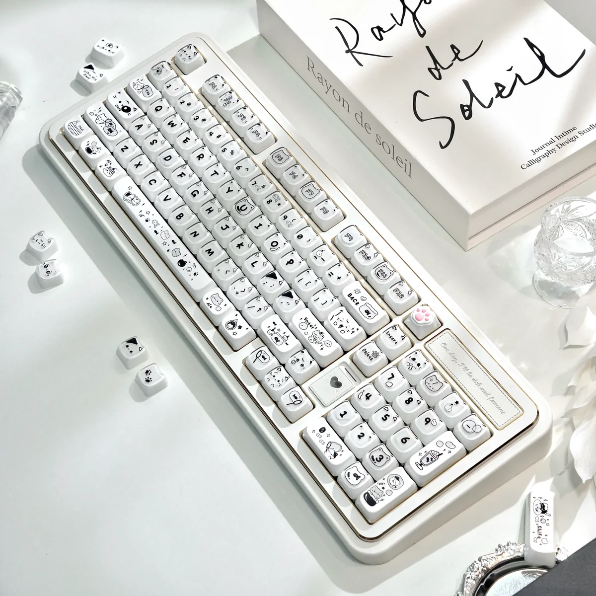 Unleash a wave of delight and personalization onto your desk with our enchanting Crystal Jelly MAO Keycap Set. Designed for the discerning enthusiast, these Transparent Keycaps transform your mechanical keyboard into a vibrant canvas. Each piece showcases intricate Custom Cat Keycaps designs, rendered in playful translucent pastel hues, creating a mesmerizing visual theme. The unique MAO Profile Keycaps are not only aesthetically pleasing but also ergonomically crafted to provide a supremely comfortable and delightful typing experience. Thanks to an innovative Double-Layer Keycaps construction, these keycaps offer exceptional depth and clarity, making every key press a moment of joy. Featuring sleek Side-Engraved Keycaps, the legends appear subtly, enhancing the clean and artistic aesthetic. Perfect for creative setups, personalizing your workspace, or adding a unique piece to your collection, our Jelly MAO Keycaps promise to elevate your keyboard with unparalleled charm and functionality.