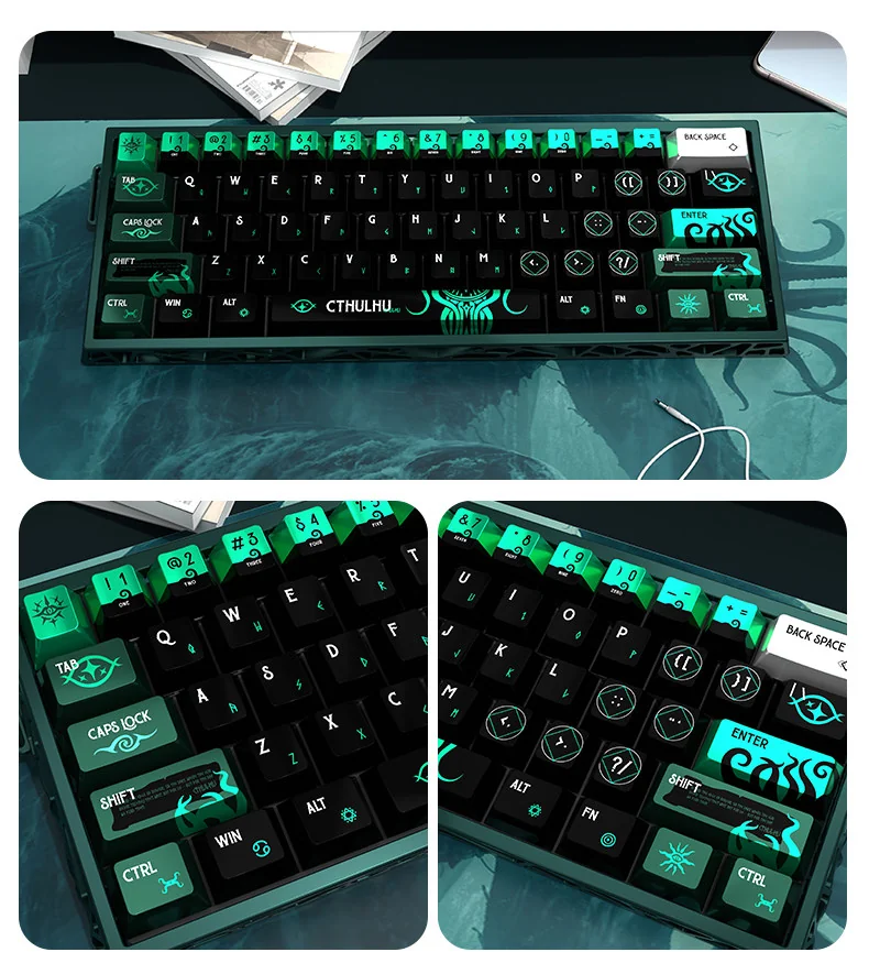 Unleash an ancient, otherworldly presence upon your keyboard with our exclusive Cthulhu Keycap Set. Designed for enthusiasts who embrace the cosmic horror aesthetic, this premium set transforms your setup into an artifact of untold dread. Each keycap is crafted from high-quality pearlescent PBT, offering a uniquely tactile experience and a shimmering, metallic finish that evokes the dark depths of the ocean and the mysteries beyond. The intricate Cthulhu motifs are applied using advanced dye-sublimation, ensuring crisp, durable legends that will never fade. Beyond their stunning visual appeal, these Cthulhu Keycaps are specifically engineered as Magnetic Switch Keycaps, providing seamless compatibility with high-performance boards, including Wooting compatible keycaps. Elevate your gaming or collection with a touch of the unknown. Immerse yourself in the chilling allure of the cosmos and make a statement that transcends the ordinary.