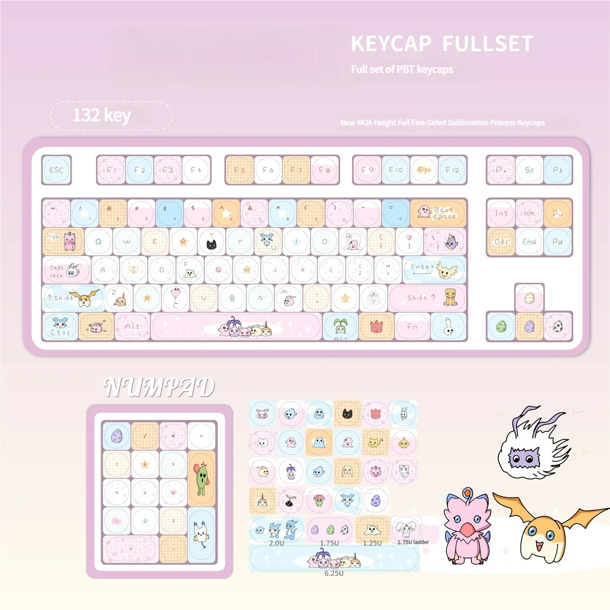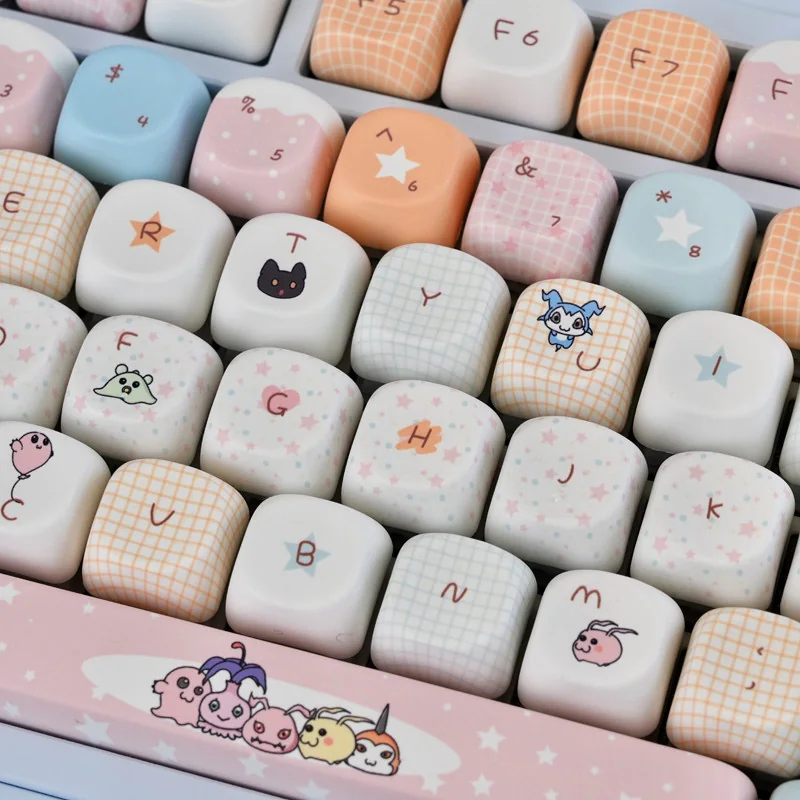Embark on a nostalgic journey back to the Digital World with our Digimon: Characters MOA Keycap Set! Each set is a vibrant homage to your favorite childhood companions, meticulously crafted to bring a burst of playful energy to your mechanical keyboard. These cute anime keycaps feature stunning five-sided dye-sublimation. That ensuring every detail of your beloved Digimon characters is rendered with vivid, long-lasting color that won’t fade or wear. Designed with an ergonomic MOA profile, these Digimon keycaps offer a uniquely comfortable and satisfying typing experience. The smooth, spherical tops and uniform height provide a distinct aesthetic and feel, setting your setup apart. Made for Cherry MX switches and compatible with popular layouts, our dye-sublimation keycaps are the ultimate upgrade for fans seeking both style and substance.
