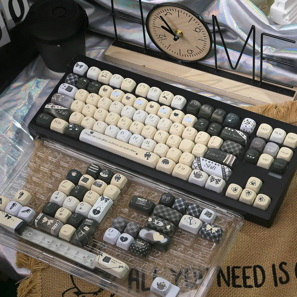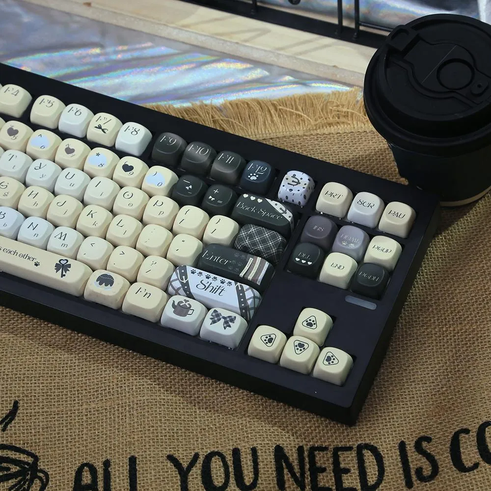 Refresh the look of your keyboard with the Eve’s Dream MOA Keycap Set! The keycaps in this captivating set are a tasteful combination of white, beige, black and grey. A touch of refinement is added to each keycap with grey lettering in a distinctive font style. Some keycaps have cute animal paw print symbols and the Space key has a sweet heart-shaped icon. The ESC key’s visual appeal is further enhanced by the addition of a charming ribbon icon. With its MOA profile design and sturdy PBT construction. Which this keycap set blends quality and whimsical charm. Change your configuration now and allow your keyboard to express who you are!