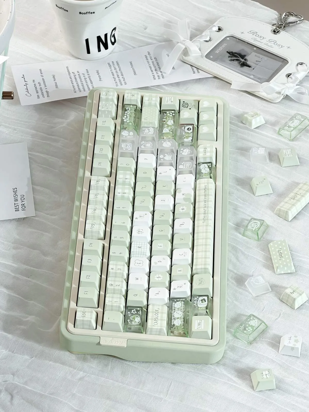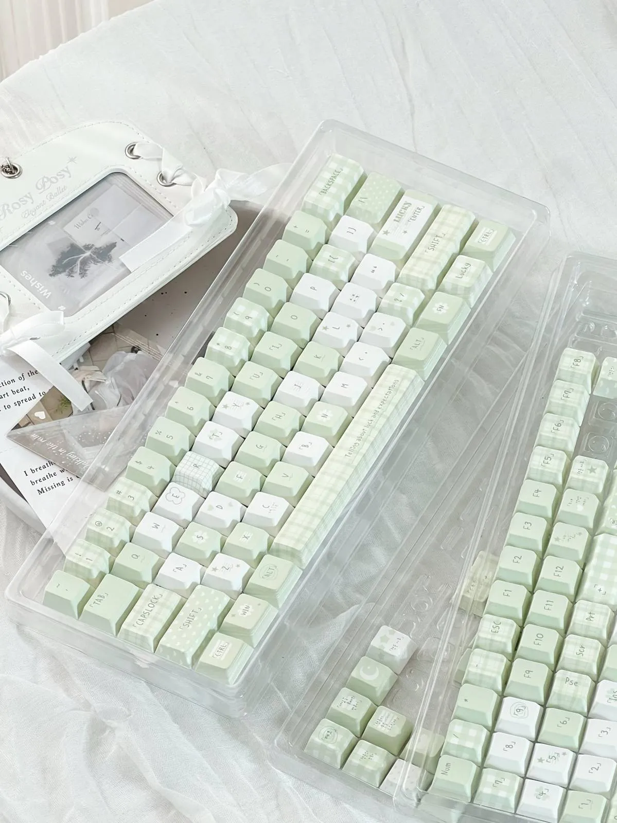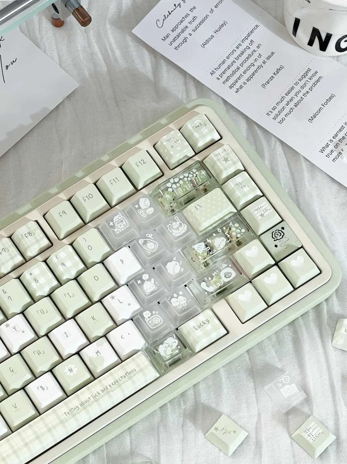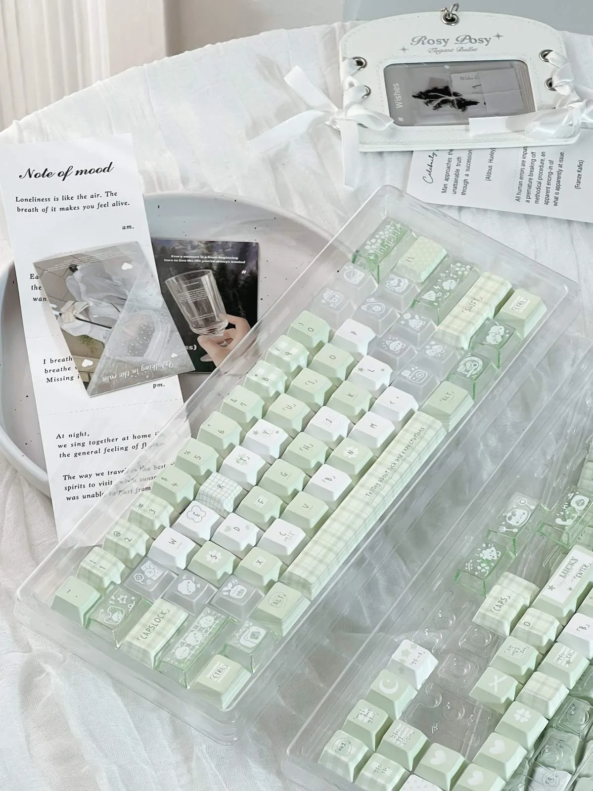 Immerse yourself in nature with the Forest Language Cherry Keycap Set! The Forest Language Keycap Set and the Forest Language with PC Supplement Keycap Set are both available. That they both have a calming white and light green keycap combination. Your keyboard is made more charming by the unusual green text which is smaller than usual. Several keycaps have a complex lattice pattern that adds to the overall elegance. While one directional key displays a charming heart-shaped emblem. These keycaps are long-lasting and stylish because they are made of sturdy PBT in cherry profile. This charming set will turn your typing experience into a calm forest adventure!