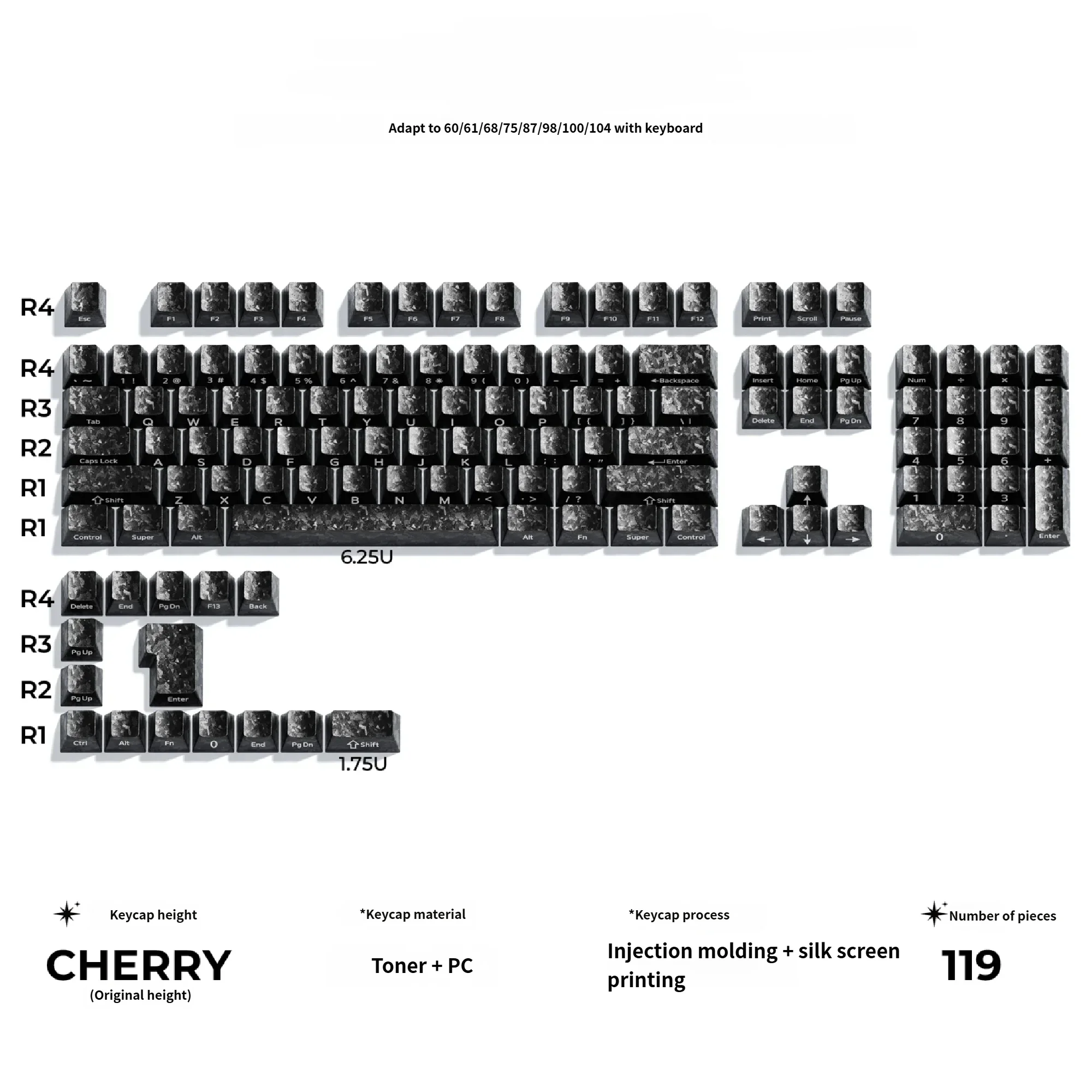 Transform your mechanical keyboard into a high-performance, aggressively styled masterpiece with our Forged Carbon Texture Cherry Keycap Set. Inspired by cutting-edge automotive design, these keycaps boast a dynamic, irregular forged carbon texture that immediately catches the eye, blending sophisticated modern aesthetics with a raw, powerful look. Each keycap is meticulously crafted to deliver an exciting visual and tactile experience. Designed for enthusiasts and gamers alike, these magnetic keyboard caps feature discreet side-print legends, maintaining a sleek, uncluttered top surface while ensuring clear visibility of your commands. This stealthy design enhances the overall premium feel, making your setup truly unique. Furthermore, these Forged Carbon keycaps offer full magnetic switch compatibility, making them perfect for performance keyboards like Wooting keycaps, ensuring seamless integration and optimal responsiveness. Upgrade your setup with these side print keycaps and unlock a new level of style and performance that exudes excitement.