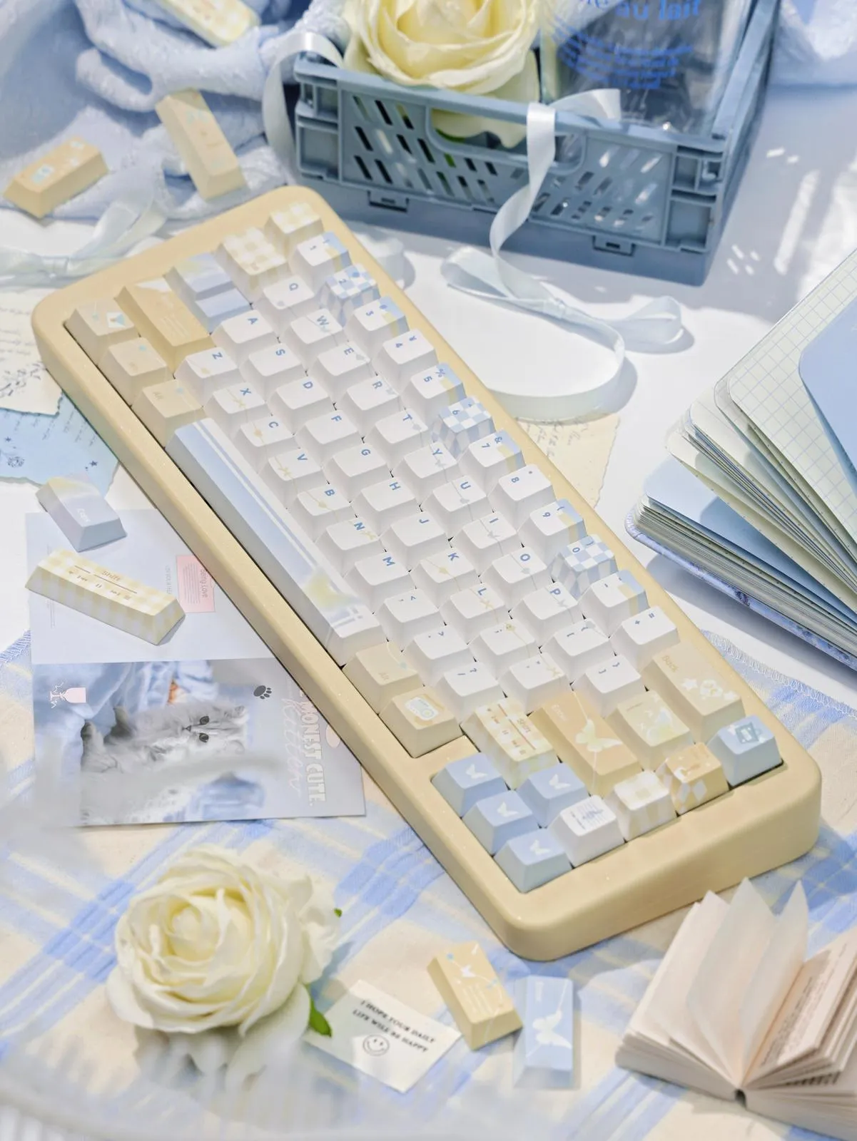 Enhance your typing experience with the Frost Flower Series Keycap Set! The Cherry Keycap Set and the SOA Keycap Set are the two alternatives available in this lovely collection. Vibrant yellow and blue keycaps with striking blue lettering in a distinctive font style. That match the sophisticated white base. A whimsical touch is added by the adorable butterfly symbols that grace the Enter and directional keys. Certain keycaps include elaborate lattice art patterns that add to their aesthetic appeal. This set is ideal for any keyboard aficionado because it is made of sturdy PBT. Which this design comes in Cherry Profile or SOA Profile.
