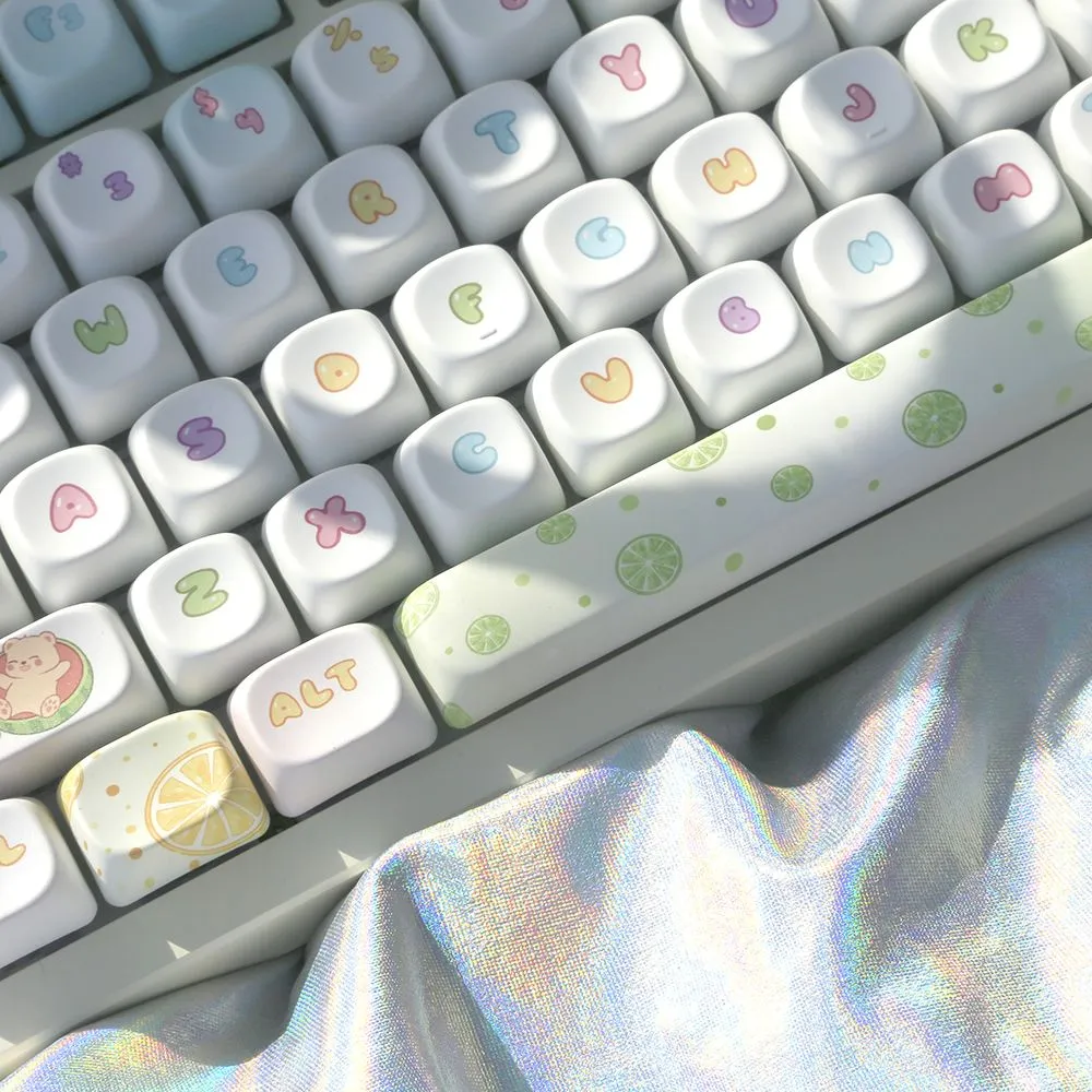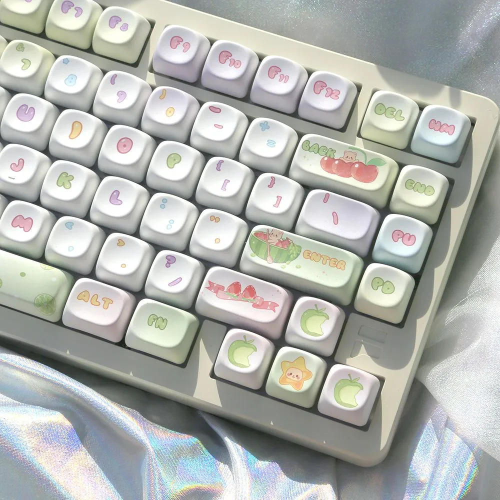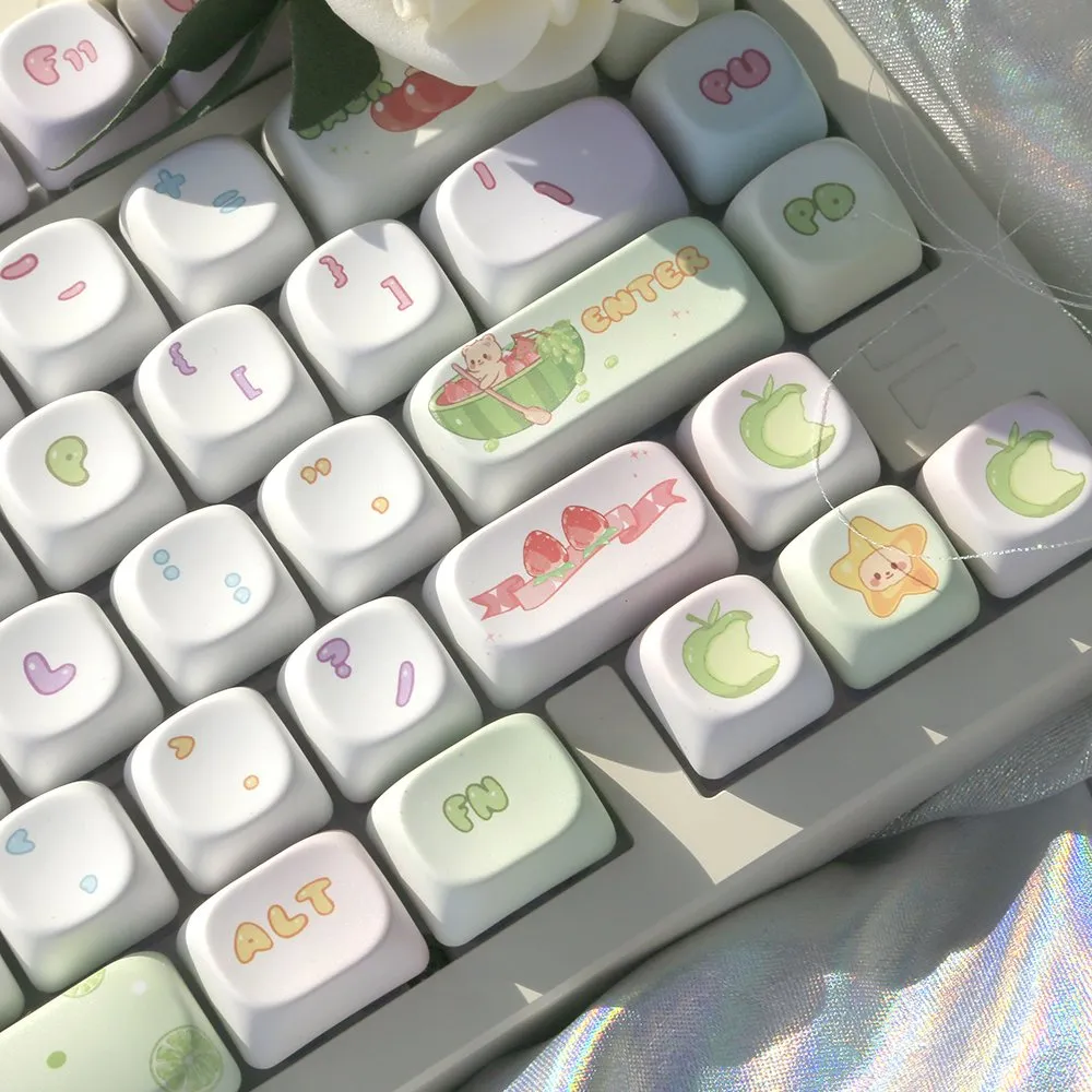 Transform your keyboard with the vibrant Fruit Paradise MOA Keycap Set! Eye-catching purple, green and blue keycaps decorate this set which has a clean white base. Each keycap adds a whimsical touch to your setup with its vibrant lettering in a distinctive font style. For a playful twist, the directional keys have cute apple symbols. While the Enter key delights with a charming watermelon icon. In keeping with the general motif, the Caps key is also adorned with a cute banana image. This keycap set is ideal for anyone who wish to add a little happiness to their workstation. Because it is made of sturdy PBT material and is designed in MOA profile!