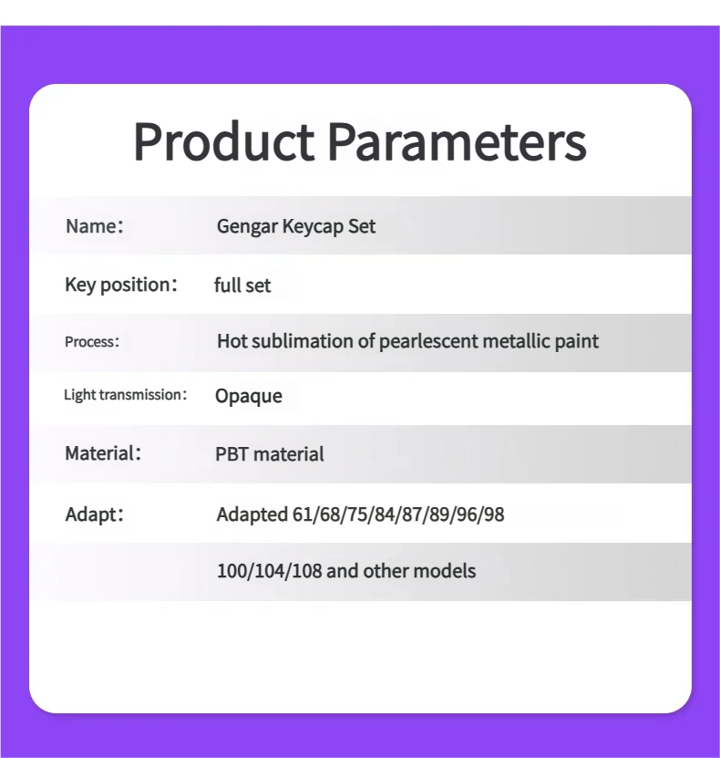Unleash the mischievous charm of Gengar onto your gaming rig with our exclusive Gengar PBT Keycaps Set. Blending iconic Pokemon nostalgia with a sophisticated, pearlescent metallic finish, these keycaps offer the ultimate gaming aesthetic. Each keycap shimmers with a high-gloss sheen, bringing Gengar’s ghostly presence to life in a truly premium way. Crafted from durable PBT material, these Gengar PBT Keycaps promise exceptional longevity and a satisfying tactile feel, resisting shine and wear even through intense gaming sessions. Engineered specifically as magnetic switch keycaps, they provide seamless compatibility and enhanced responsiveness for a superior gaming experience. Fully optimized as Wooting compatible keycaps, they are a must-have upgrade for serious gamers seeking both style and precision. Transform your keyboard into a legendary centerpiece with these unique Pearlescent Gengar keycaps and immerse yourself in a world of excitement every time you play.