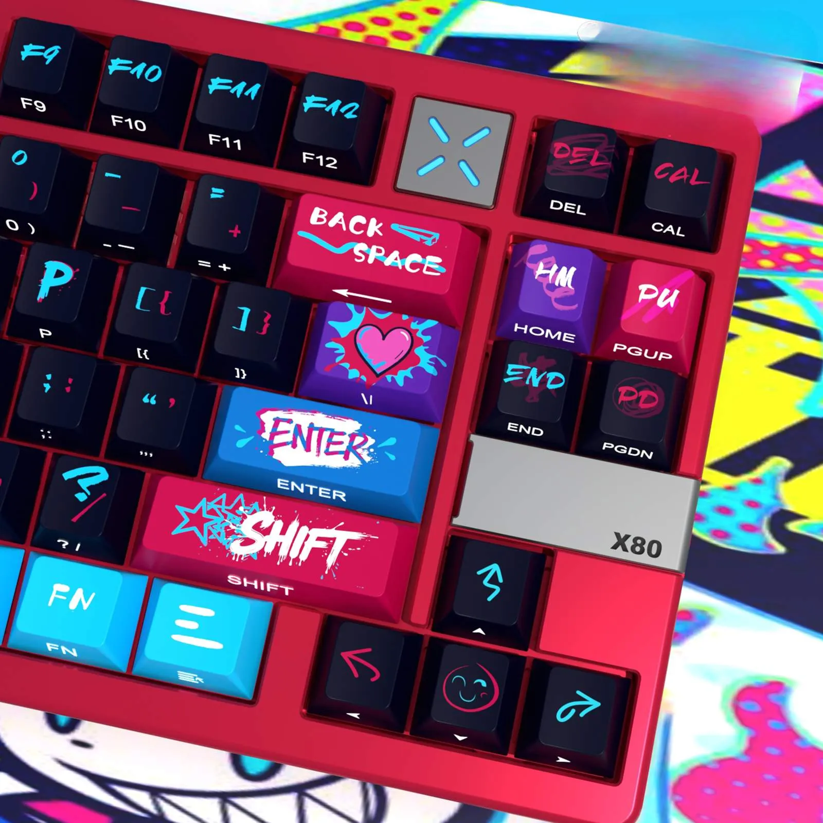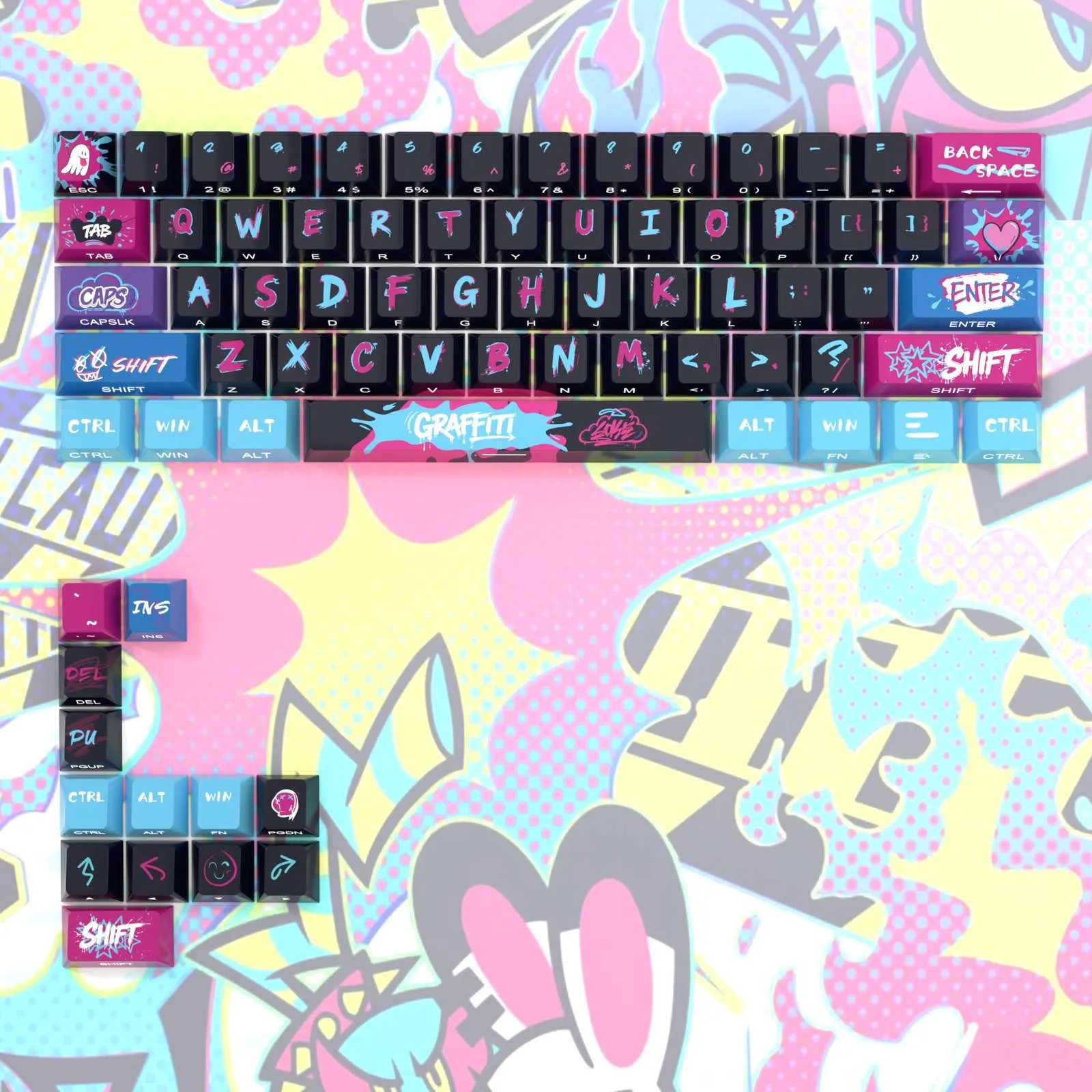 Elevate your keyboard with the stunning Ghost Graffiti Cherry Keycap Set! This striking set comes in two varieties: full keycap set or Keycap Set Compatible With 60/68. The bright blue, purple and pink keycaps stand out against the sleek black base. A splash design adds flair. That each keycap is embellished with distinctive pink, blue and white lettering in a fashionable font. The ESC Key features a cute ghost spirit symbol and the Space Key proudly shows the phrase “GRAFITTI.” This keycap set is ideal for enthusiasts who want to customize their setup. Because it crafted by sturdy PBT material which has a cozy Cherry profile.