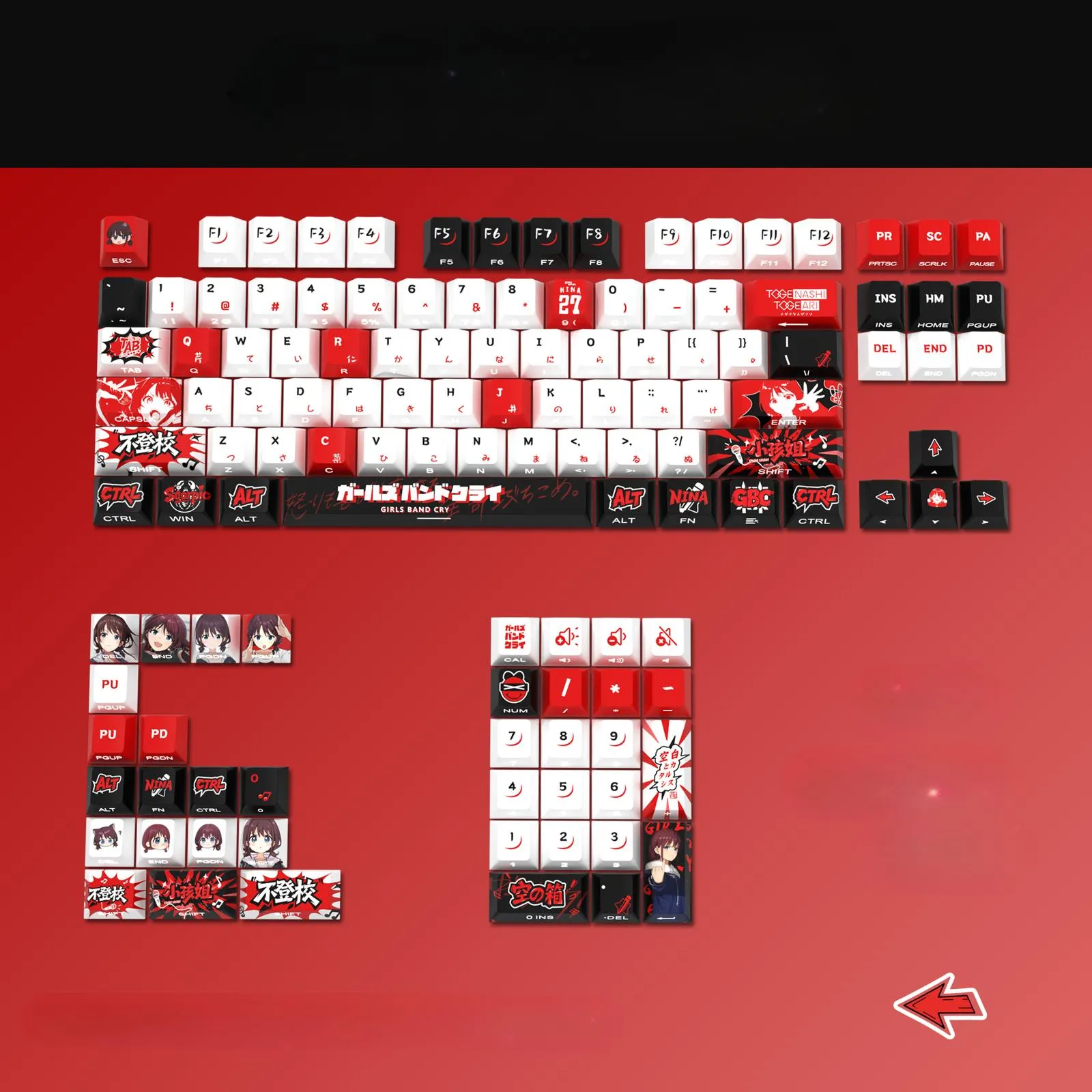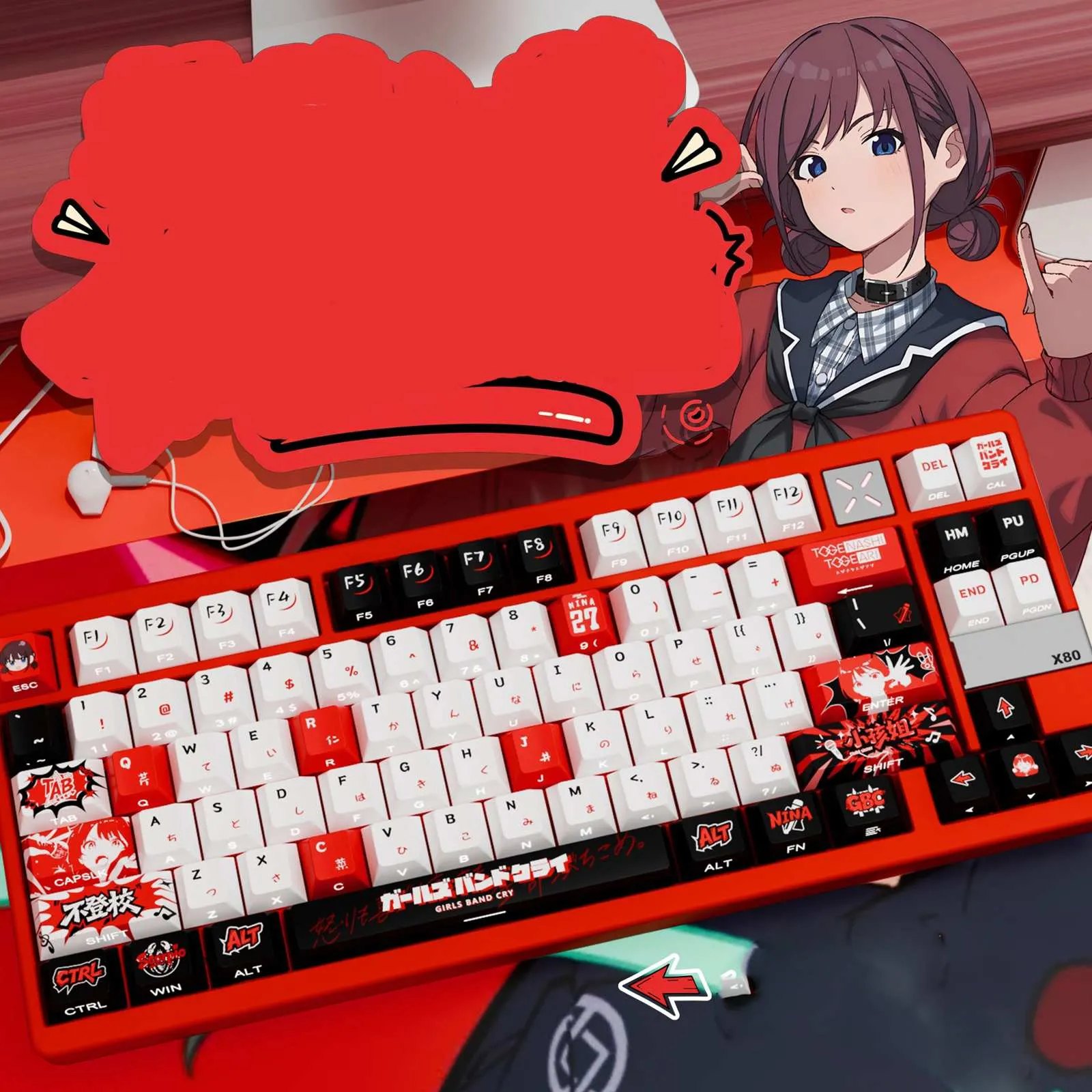 Revolutionize your typing experience with the colorful Girls Band Cry: Nina Iseri Cherry Keycap Set! There are two choices: Nina Iseri Keycap Set or Keycap Set Compatible With 60/68. Which is able to select according your personalize. Bold red and black keycaps contrast well with the stark white base. That giving your setup a splash of color design. Some keycaps have adorable character images like the ESC key. While others have black writing for easier reading. These keycaps are made of sturdy PBT which guarantees longevity and a high end feel. This Cherry profile keycap set is ideal for collectors and lovers alike. Because it provides comfort and style.