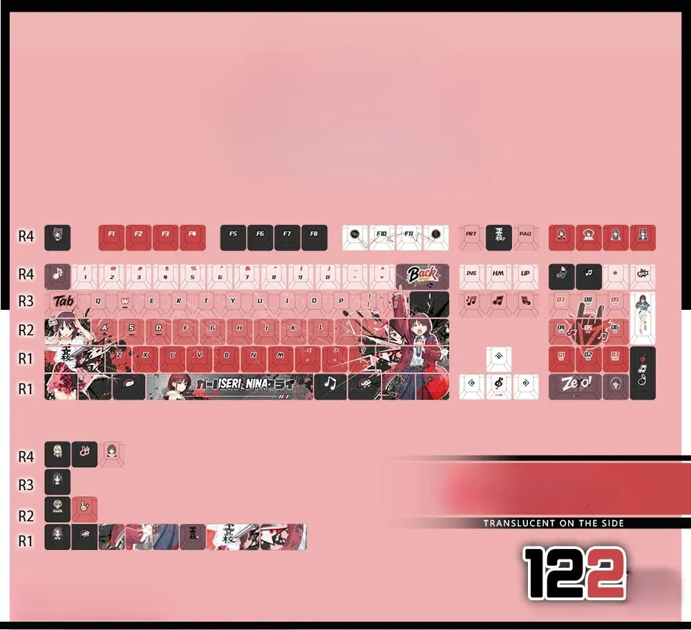Unleash your creativity with the vibrant Girls Band Cry: Nina Iseri Cherry Keycap Set & Mechanical Keyboard! You may personalize your configuration with the three keycap types available. Which in this exclusive collection: Front-Lit, Side-Lit and Opaque. 122-key set, 87-key keyboard, tri-mode 87-key, 108-key keyboard or tri-mode 108-key choice are among the five combinations available. Keycaps in shades of purple, pink, white and black provide a stunning contrast with the vivid red base. Certain keycaps have distinctive character icon designs. Such as an ESC key that depicts Nina Iseri holding a microphone. The set is composed of sturdy PBT in a Cherry profile and the Space Key proudly displays her name. Boost your gaming experience right now!