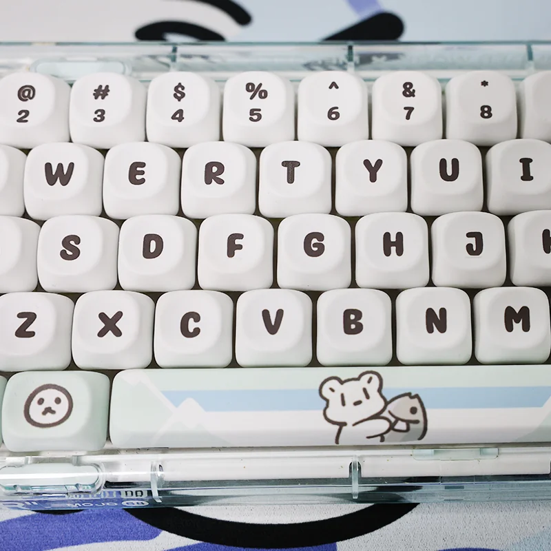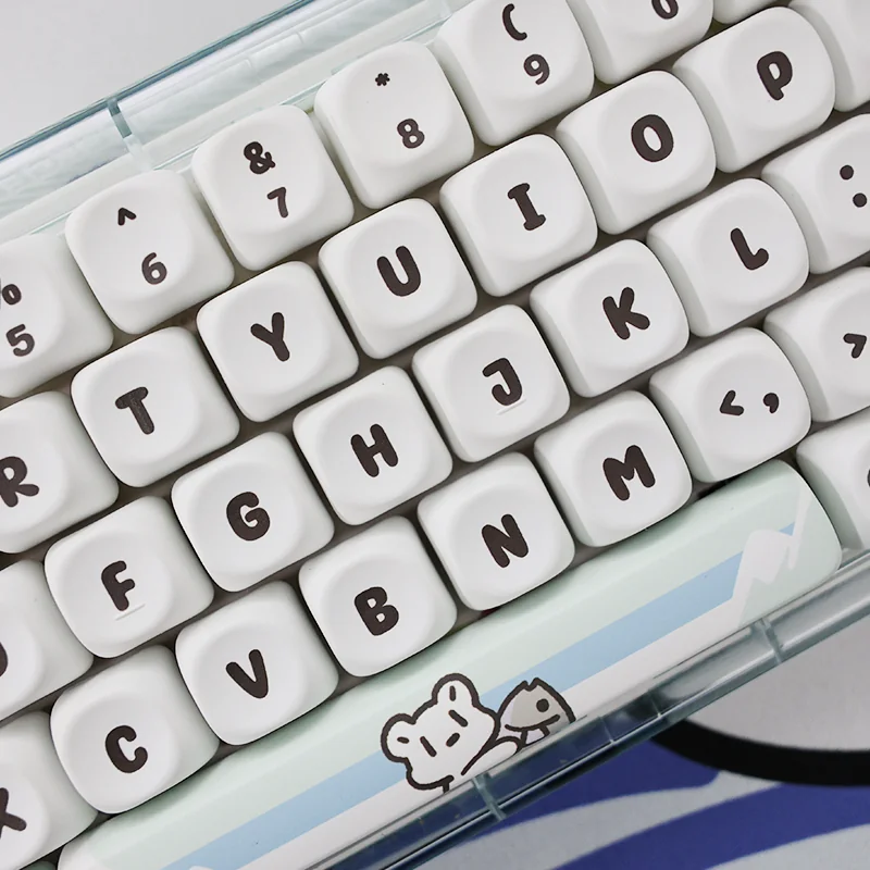 Immerse yourself in a cool, serene aesthetic with our Glacier Bear MOA Keycap Set. Crafted from high-quality PBT, this durable PBT keycap set features a delightful icy blue and white color palette. Which complete with an adorable bear motif, evoking a peaceful winter landscape. The advanced Dye-sublimation process ensures that the legends remain crisp and vibrant, resisting wear and fading for a truly lasting custom keyboard aesthetic. Experience a truly unique typing experience with the ergonomic MOA profile, designed for comfort and a satisfying feel. Whether you’re gaming, working in the office, or engaged in creative pursuits, these keycaps transform your keyboard into a statement of uniqueness and creativity. Perfect for collectors and anyone seeking to infuse their setup with a touch of serene artistry. That this set is an essential upgrade for any custom keyboard enthusiast.
