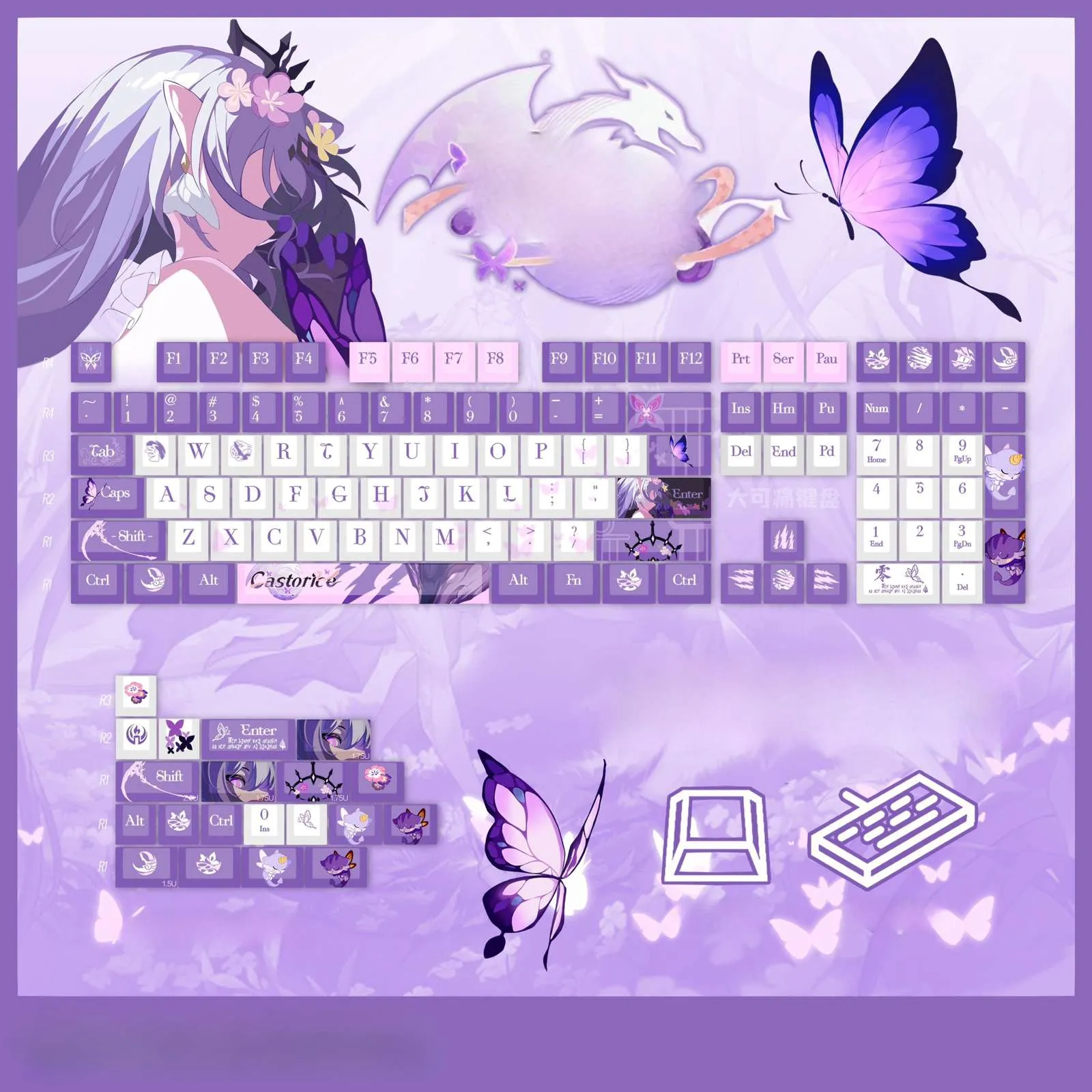 Utilize the Honkai: Star Rail: Castorice Keycap Set to improve your gaming setup! This set which has a clean white base that features gorgeous purple series keycaps. That give your keyboard a colorful touch. The distinctive purple and white script that adorns the keycaps ensures an eye-catching look. Character icons on a number of keycap, such as the Enter Key. Which give your typing experience personality. The Caps Key features a lovely butterfly motif. While the Space Key boldly shows the name of the character “Castorice.” These keycaps are ideal for any Honkai: Star Rail fan wishing to upgrade their setup. Because they are made of sturdy PBT material!
