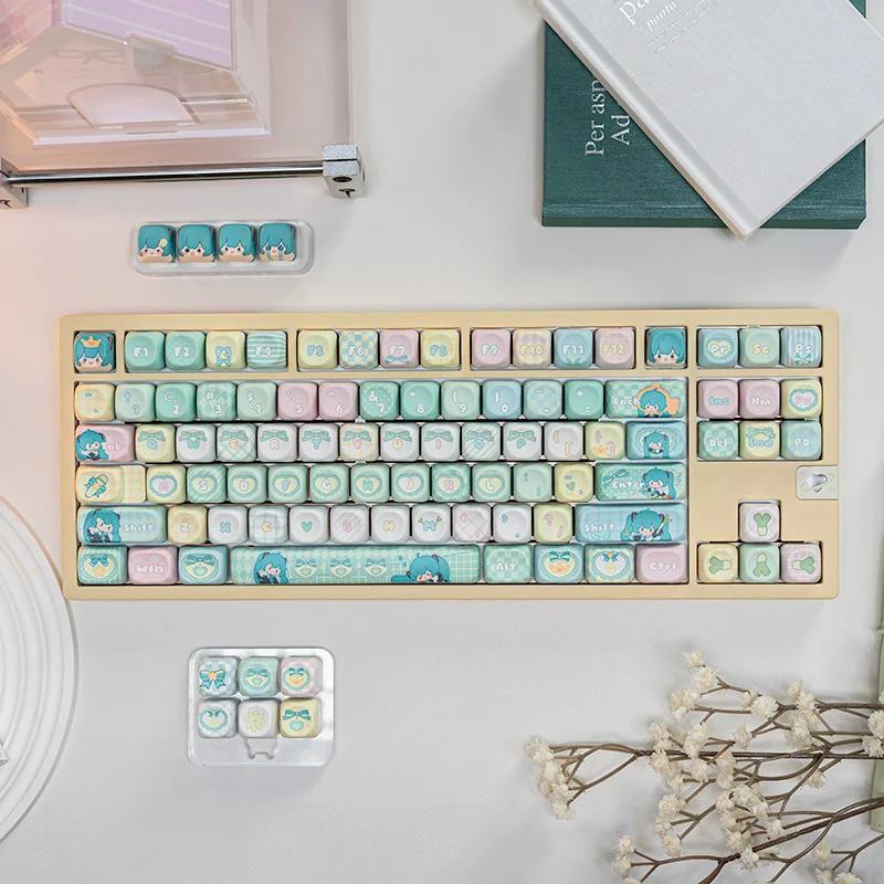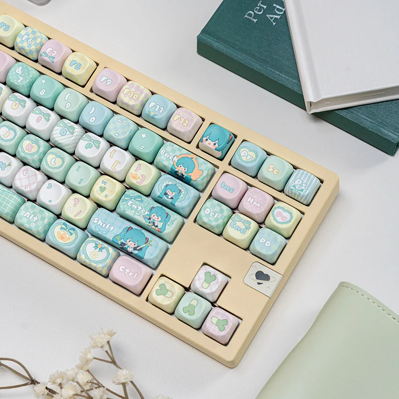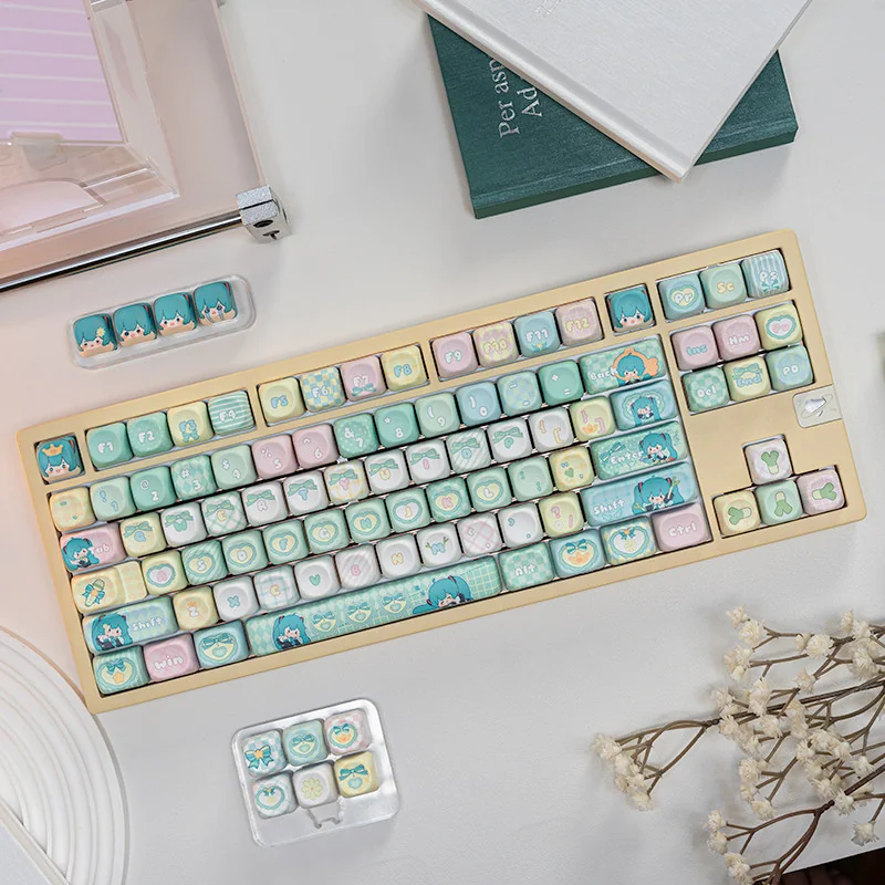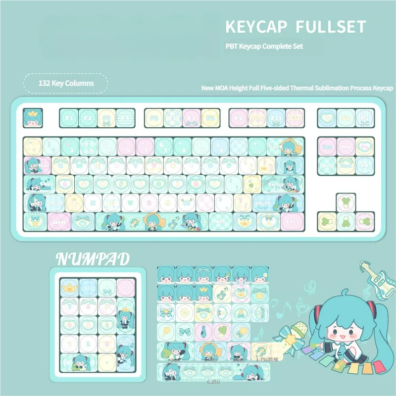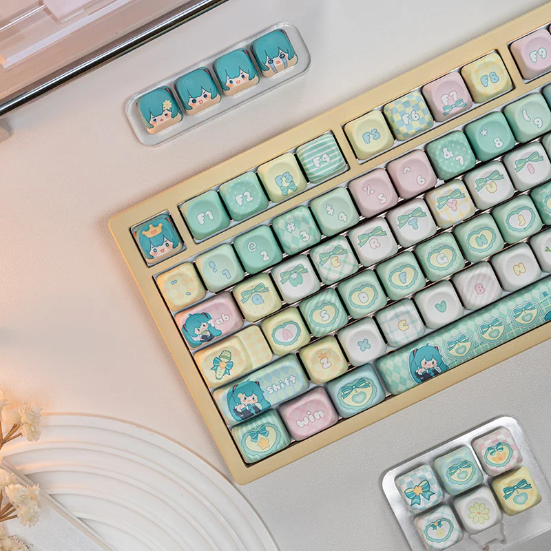 Unleash your inner fan and infuse your setup with pure joy using our VOCALOID: Iconic Hatsune Miku MOA Keycap Set! This iconic PBT dye-sublimated keycap set is more than just an upgrade; it’s a playful tribute to the beloved Vocaloid superstar. Dive into a world of pop culture aesthetics with keycaps. Which featuring stunning Hatsune Miku character art and a delightful, colorful design that screams personal expression. Crafted from premium PBT material using advanced dye-sublimation, these Anime mechanical keycaps ensure legends that won’t fade or wear. The unique MOA height offers an ergonomic and comfortable typing experience, making every keystroke a pleasure. Perfect for enthusiasts seeking cute custom keycaps, this Vocaloid keyboard set is compatible with 60-108 key mechanical keyboards. Elevate your gaming station or collection with a touch of Miku magic and let your keyboard sing!