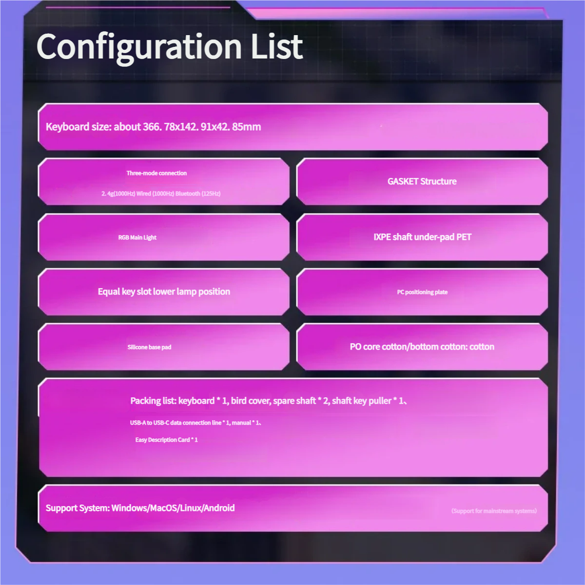 This keyboard supports Bluetooth, Wired and wireless 2.4G connections for versatile usability.