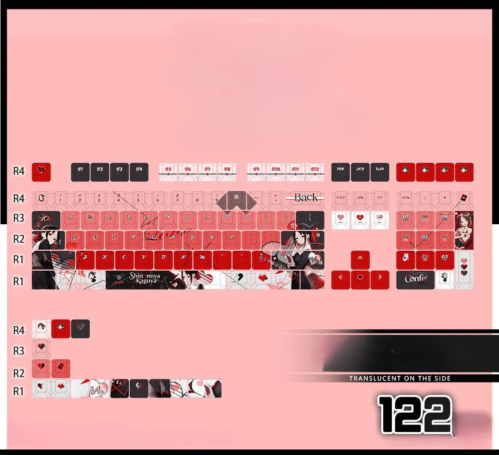 Boosts your typing experience with the captivating Kaguya-sama: Love Is War: Kaguya Shinomiya Cherry Keycap Set & Mechanical Keyboard! Front-Lit, Side-Lit and Opaque keycaps are among the 15 possibilities available in this remarkable collection. Keycap Set with 122 keys, Keyboard with 87 keys, Keyboard with 108 keys or Tri Mode Keyboard are among the five options offered by each version. Pink, black and grey keycaps with distinctive black, white and red lettering. Which elegantly compliment the eye-catching red series base. Both the left and right keycaps have character icons. While the Space Key has the name “Shinomiya Kaguya.” Fans will love this Cherry Profile set which is made of sturdy PBT!