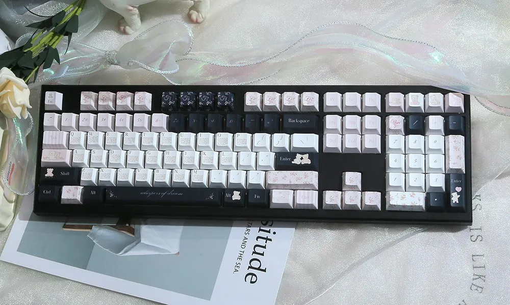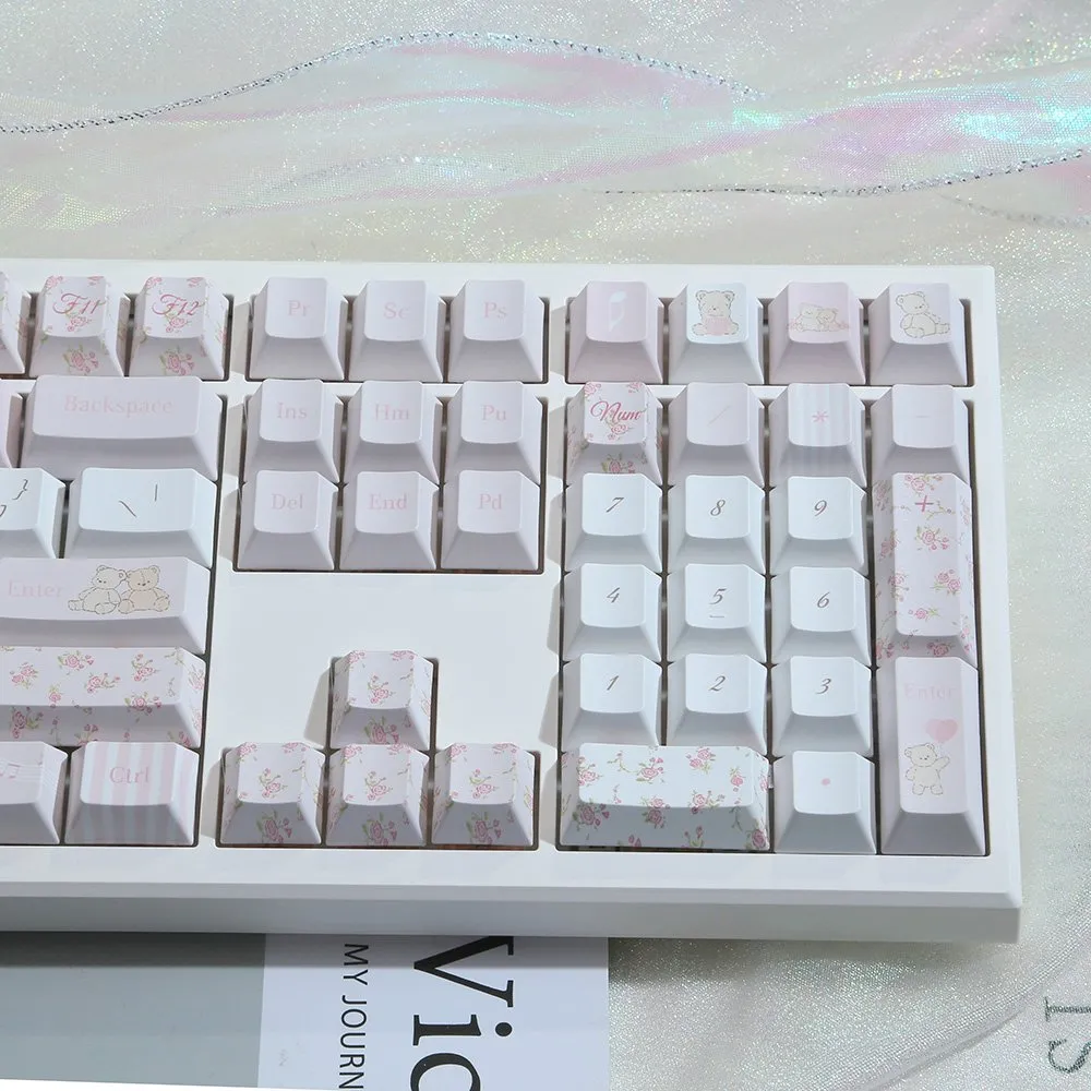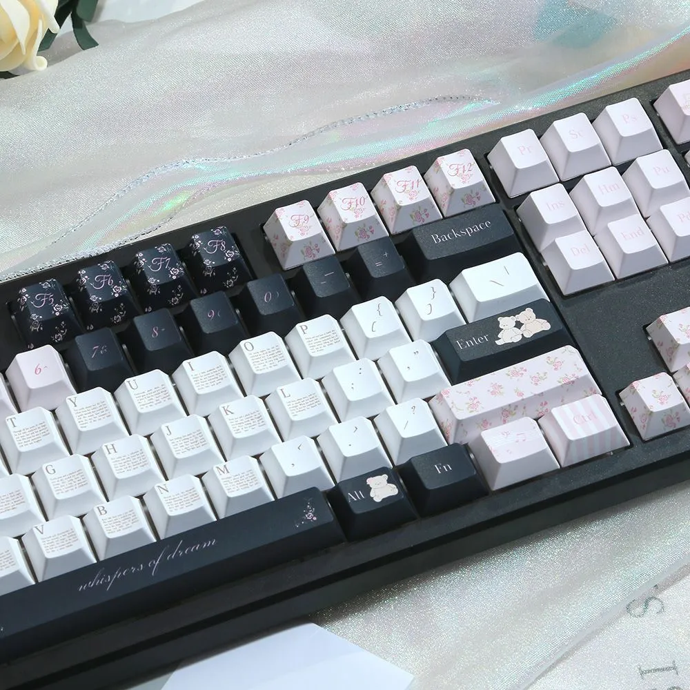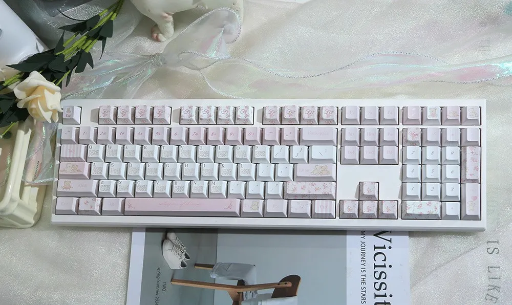Take typing to the next level with the adorable Little Bear Floral Cherry Keycap Set! The Pink White Keycap Set and the Black Pink Keycap Set are two adorable possibilities. The Black Pink variant is ideal for a dramatic look. Because it has a clean white base with eye-catching black and pink keycaps. The Pink White variant, on the other hand which features a delicate appearance with a white base and pink keycaps. A whimsical touch is added with adorable icons. Such as a flower on the Shift Key and a charming bear on the Enter Key. These Cherry-profiled keycaps which are made of sturdy PBT. That provide any keyboard aficionado longevity and flair.