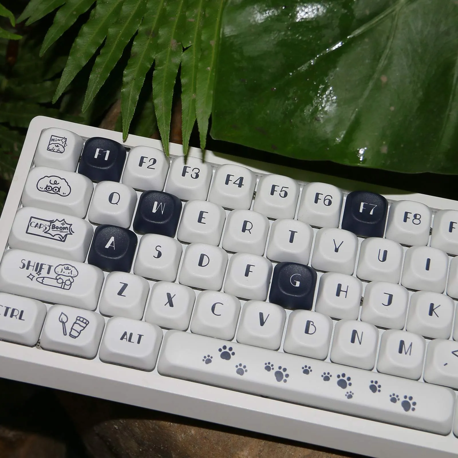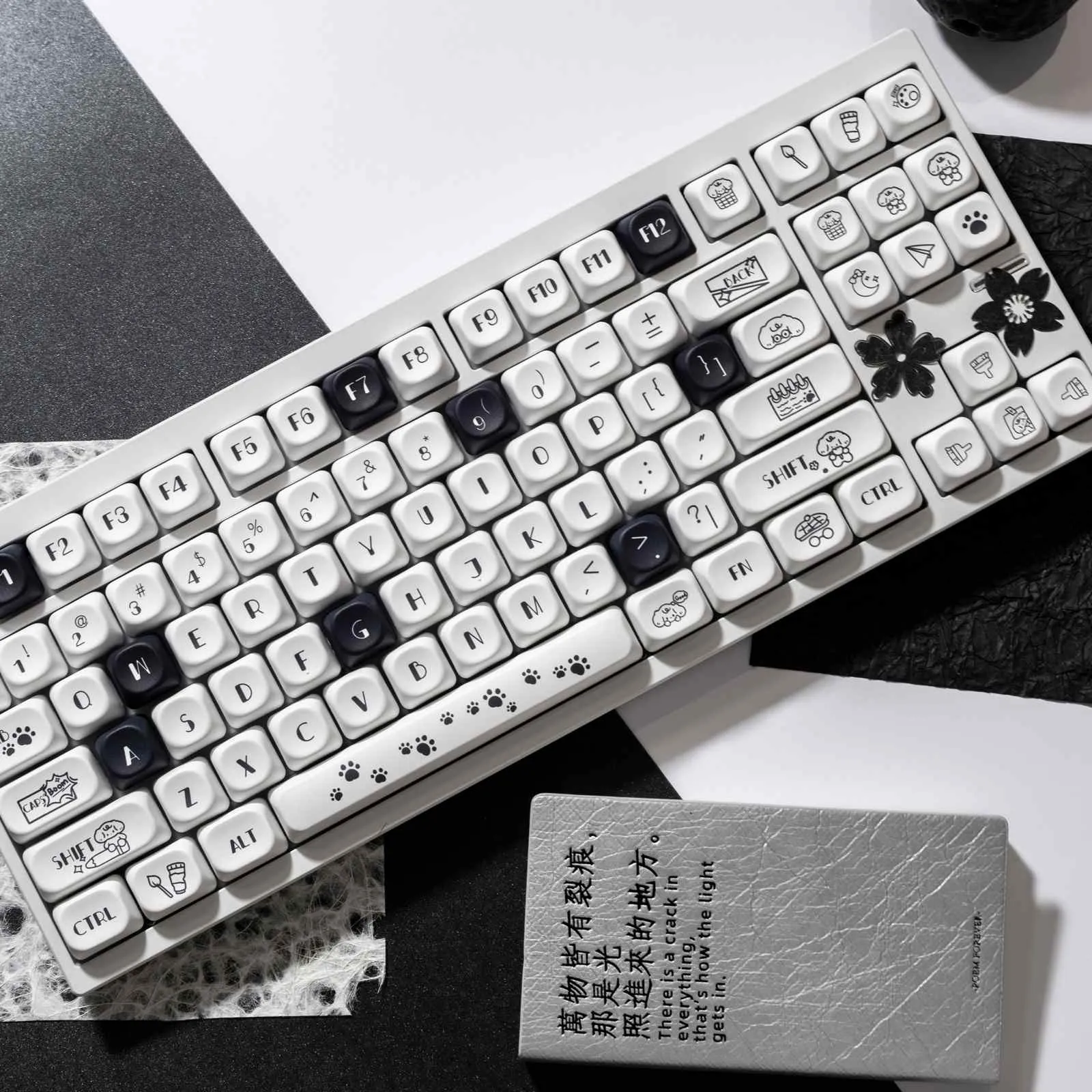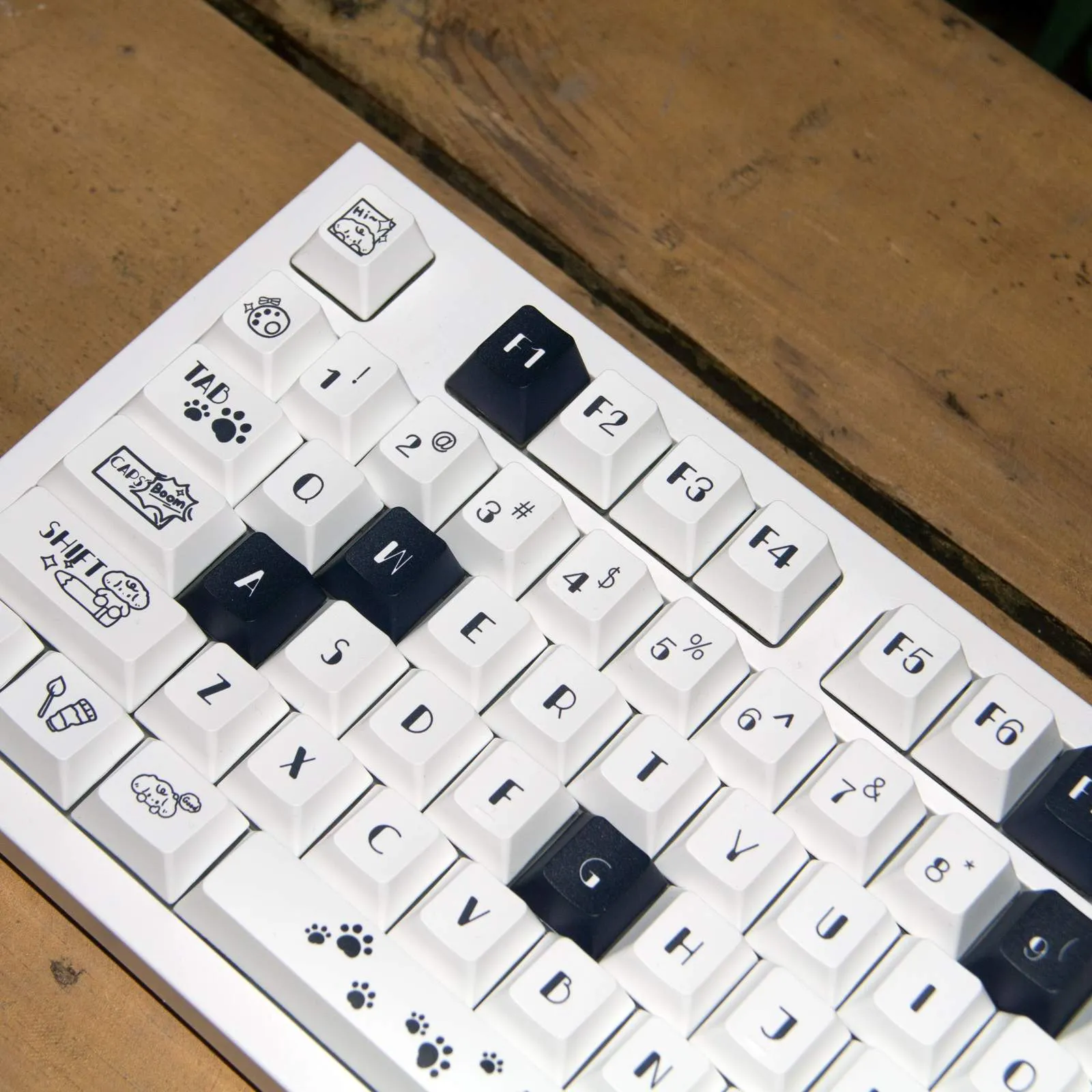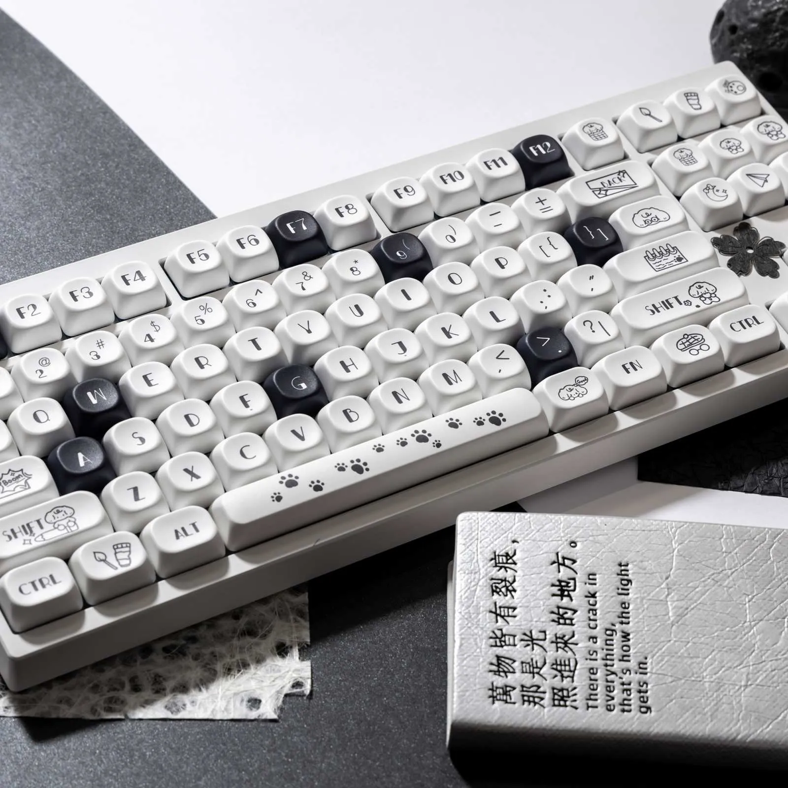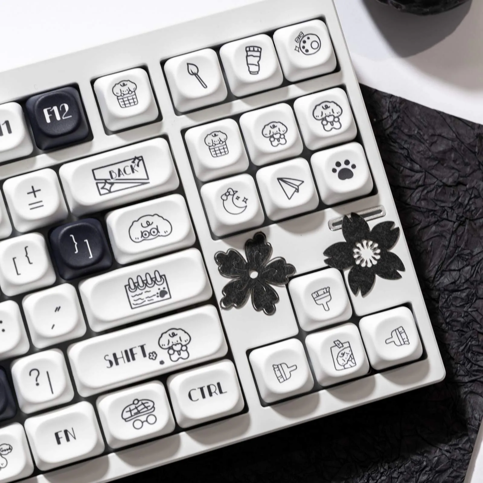 Announcing the Little Dog Comics Series Keycap Set which is a fun addition for both keyboard fans and dog lovers! Select between the contemporary QX3 Keycap Set and the vintage OEM Keycap Set. Both have a modern white base with eye-catching black keycaps that stand out. Each keycap adds personality to your setup with its own font style and black lettering. Adorable dog images can even be seen on some keycaps. Such as the ESC key has a particularly lovely design. The whimsical motif is further enhanced by the humorous design of the space key which features a dog paw image. These keycaps which are made of sturdy PBT material. That guarantee longevity and enhance your typing experience!