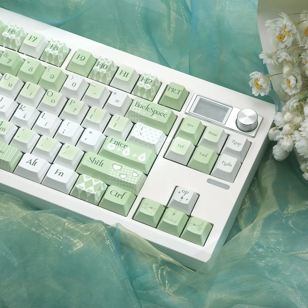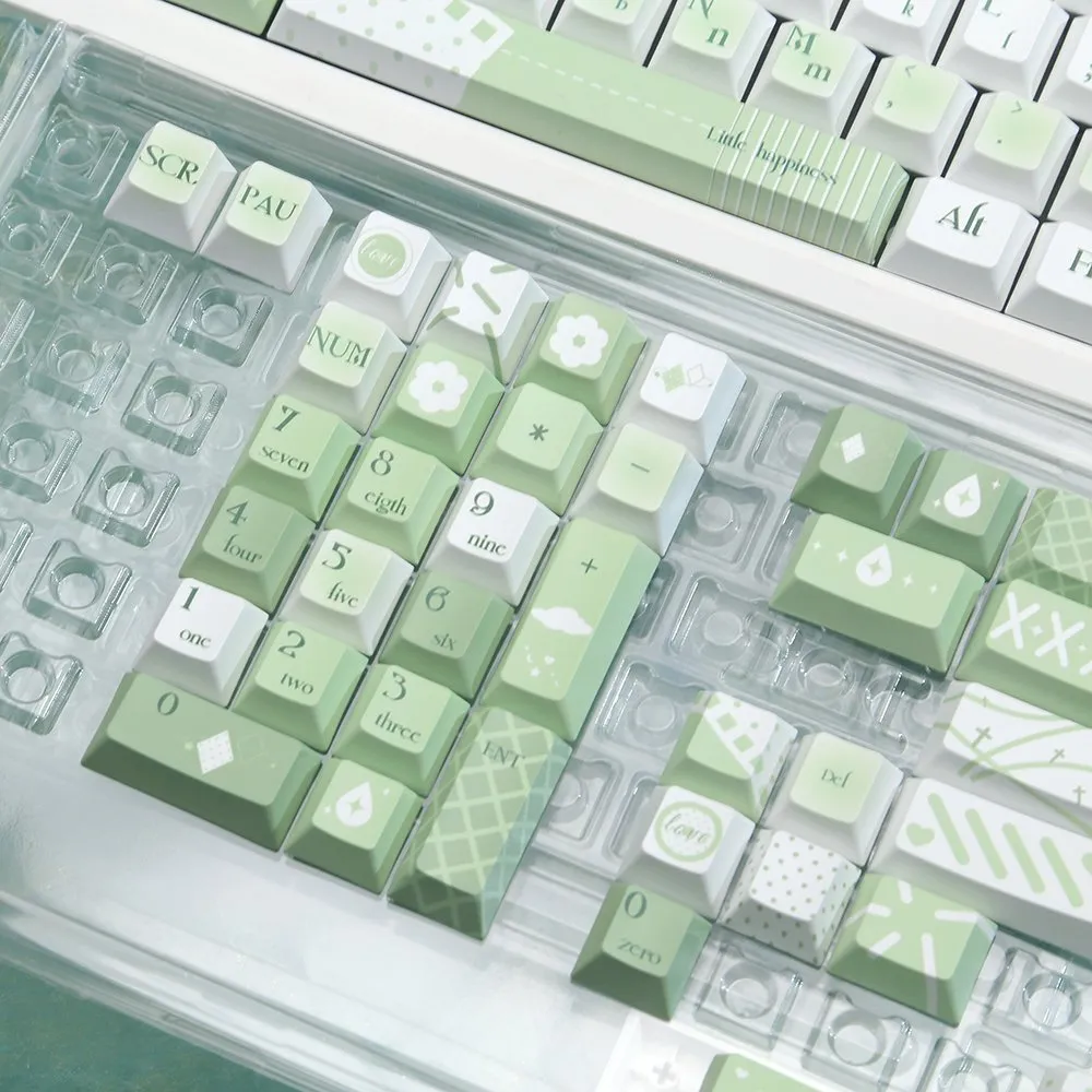 Brighten your keyboard with the Little Happiness Cherry Keycap Set! This adorable set of keycaps instantly improves your typing experience. Which with its appealing white and green combo. With its distinctive font design and vivid green lettering. That each keycap adds a creative touch to your setup. Each keystroke is made happier by the heart-shaped emblem on the Shift key and the phrases “Little Happiness.” Which are boldly displayed on the Space key. With its soft Cherry profile and sturdy PBT construction. That this set is sure to last and feel good. Ideal for people who value a fusion of happiness and style in their work environment!