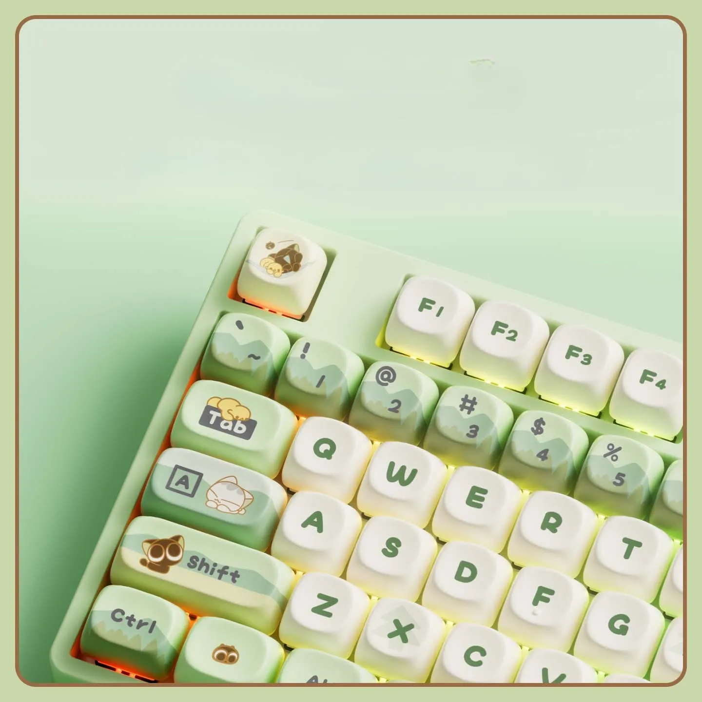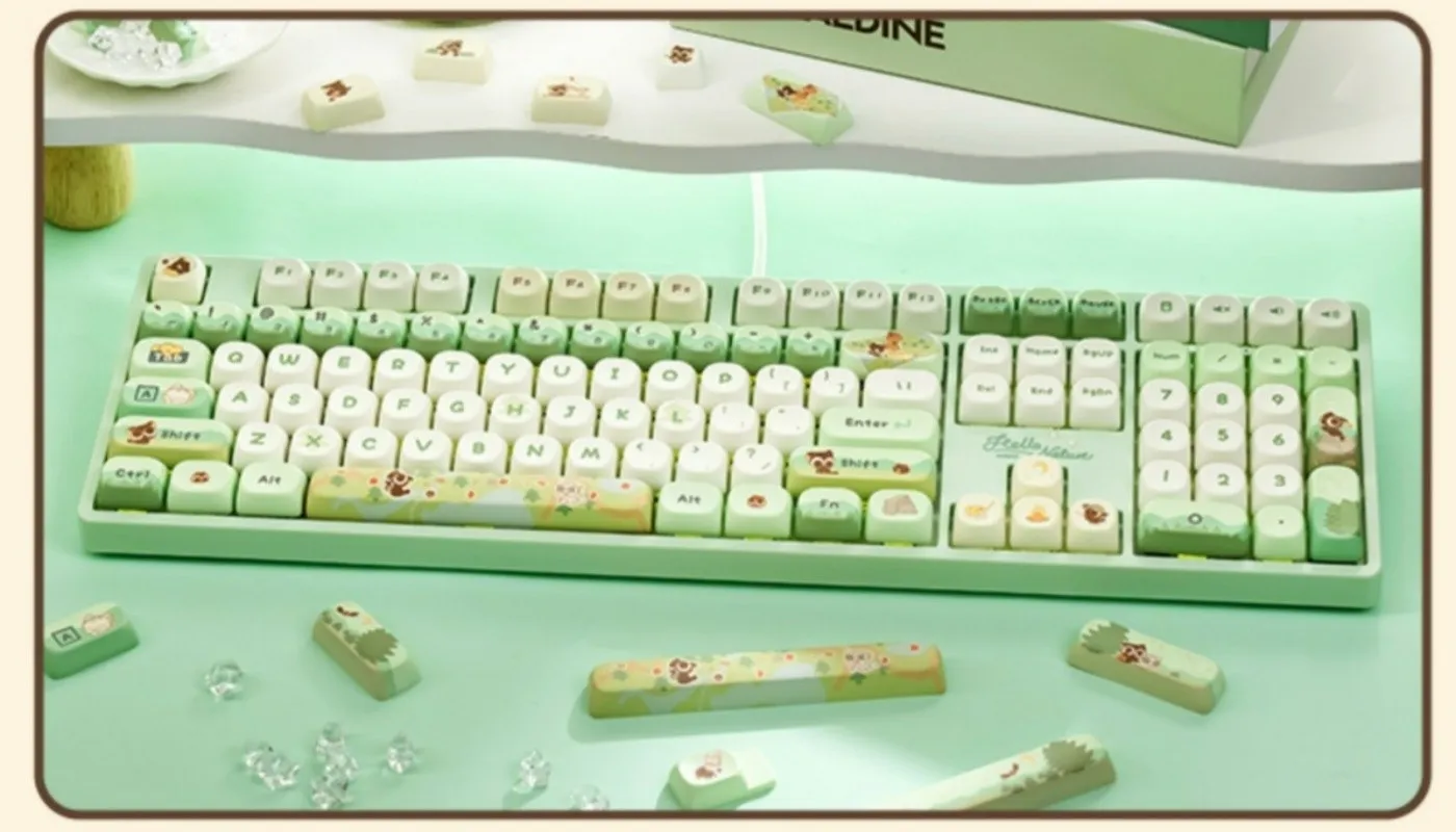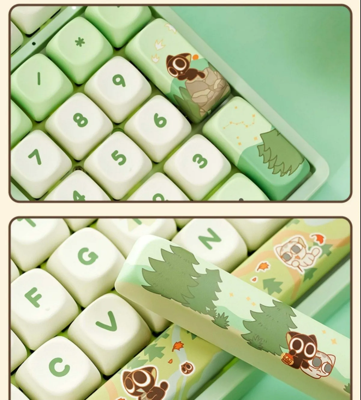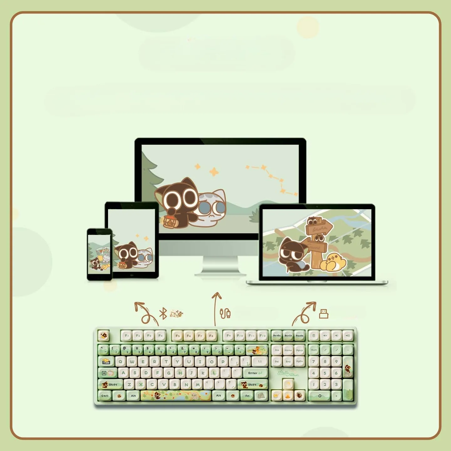 Explore the The Legend of Luo Xiaohei: Luo Xiaohei MOA Tri-Mode Mechanical Keyboard to improve your typing experience. This keyboard sticks out thanks to its chic beige base and vivid green keycaps. Some keycaps offer flair to your setup. Which is by showcasing distinctive character icon designs such as the Shift and ESC keys. Some keys also have symbols of mountains and trees which adds to the visual appeal. Its beautiful appearance is further highlighted by the unique font style used to display the black and green text. This keyboard’s long-lasting quality and performance are guaranteed by its sturdy PBT construction. The Luo Xiaohei MOA Tri-Mode Mechanical Keyboard offers the ideal fusion of design and utility!