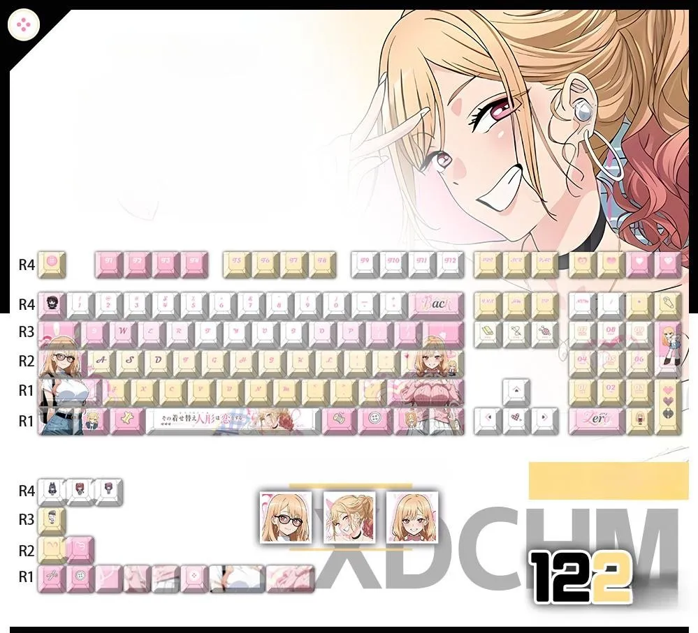 Get the My Dress-Up Darling: Marin Kitagawa Cherry Keycap Set & Mechanical Keyboard to revolutionize your typing experience! Keycap Sets with 122, 87 and 108 keys as well as Tri-Mode keyboards that are among the five possibilities available. Which for each of the three gorgeous versions: Front-Lit, Side-Lit and Opaque. White and pink keycaps contrast with the vivid yellow base that making for a striking appearance. Character icons on both side layouts. While distinctive pink, purple and white text are hallmarks of each keycap. A cute love emblem is even displayed on one directional key. This set guarantees comfort and style with each keyboard thanks to its Cherry profile design. That with sturdy PBT construction!