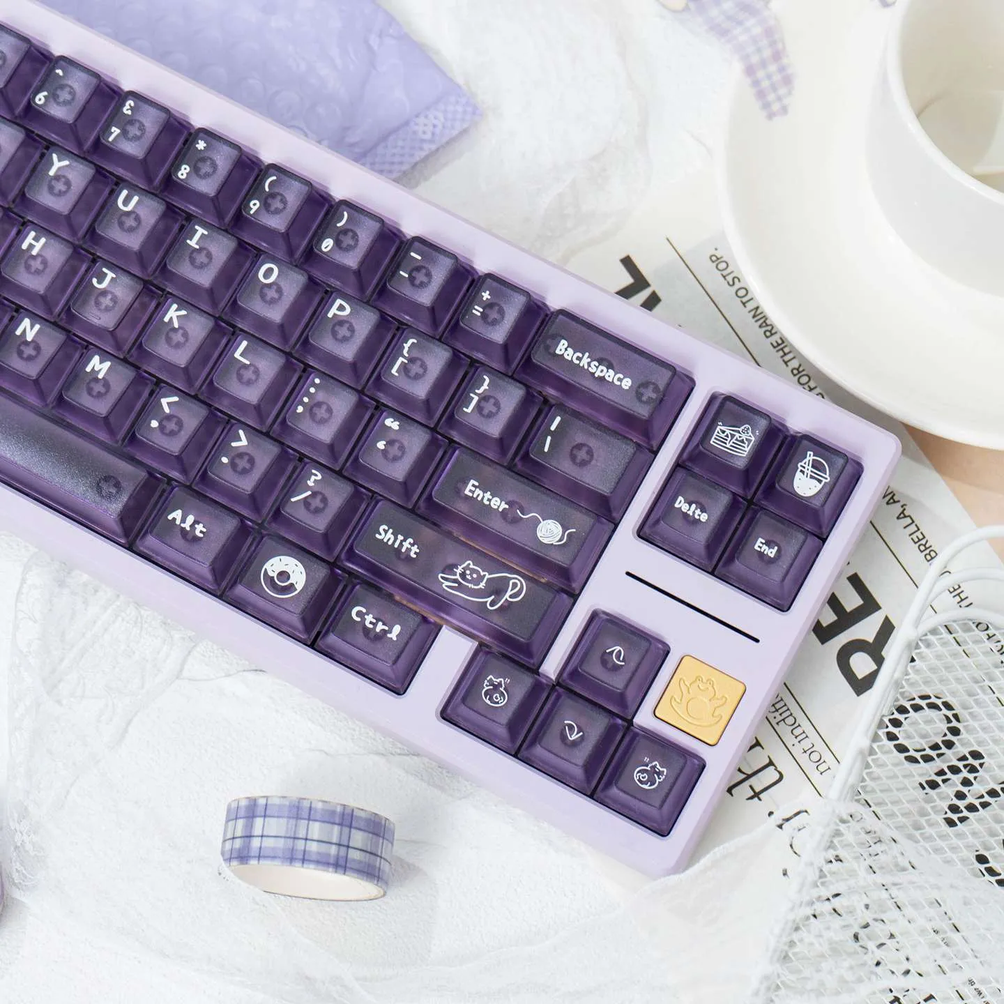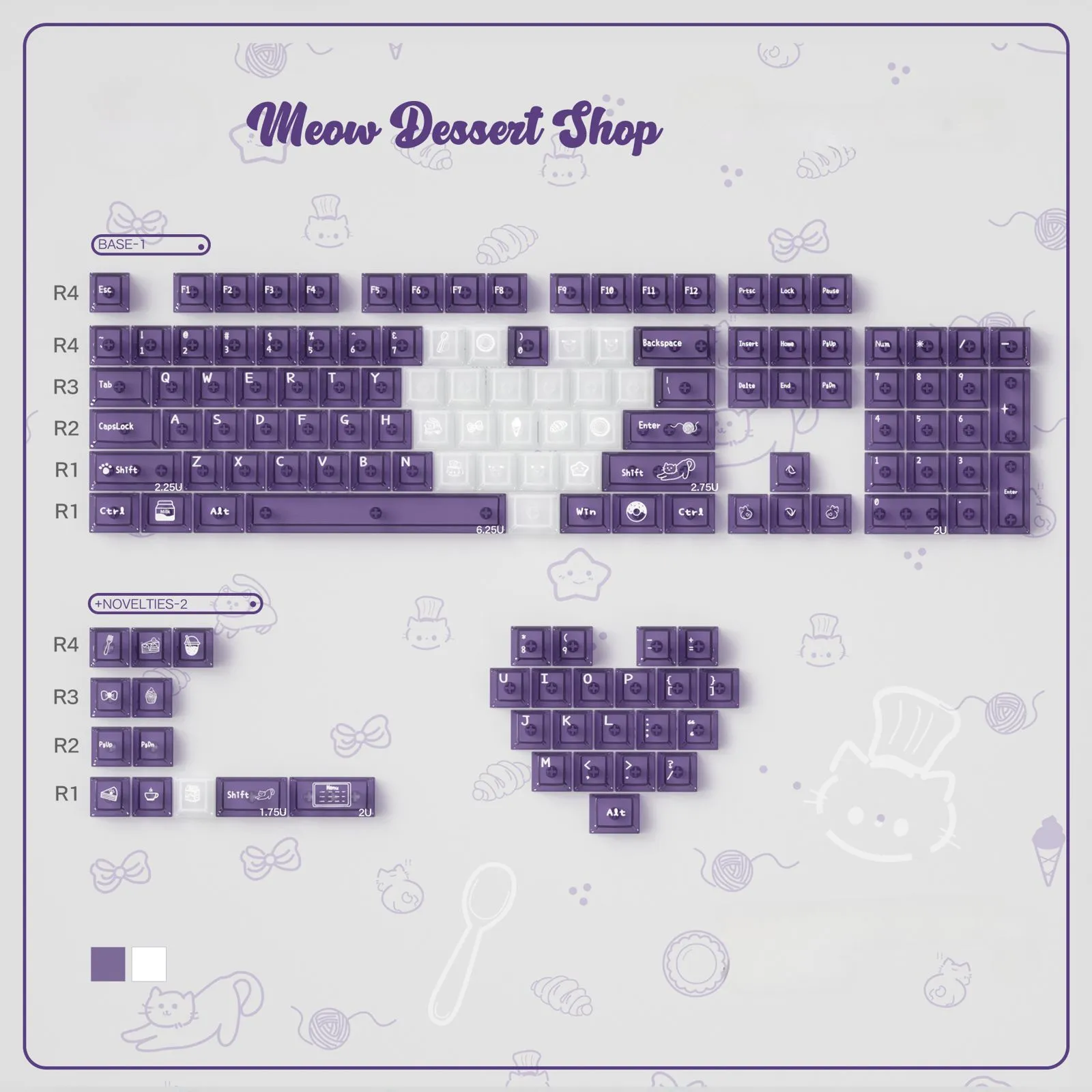 Delight your keyboard with the whimsical Meow Dessert Shop Cherry Keycap Set! This adorable set has a bright purple base and white keycaps. Which combine to create a fun and striking look. Clarity and style are guaranteed by the exquisite white lettering featured on each keycap. Adorable cat images decorate a number of keycaps while exquisite dessert patterns grace others. That making them ideal for both animal and sweet lovers. An animal footprint icon on the Shift key adds a distinctive touch. These keycaps are long lasting and resilient because they crafted by sturdy PC material. This set is perfect for both work and play because of the Cherry profile design. Which guarantees a comfortable typing experience!