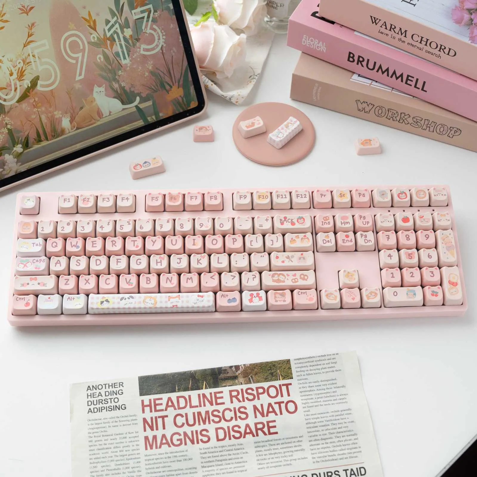 Makeover your workstation with the adorable Meow Meow Hood Keycap Set & Keyboard! This collection is ideal for cat enthusiasts and has a cute image of a cat wearing a warm hood. The Meow Meow Hood Keycap Set, M75 Tri-Mode Mechanical Keyboard, White TK108 Tri-Mode Mechanical Keyboard, and Pink TK108 Tri-Mode Mechanical Keyboard are four amazing selections from which to choose. These keycaps are long-lasting because they are made of sturdy PBT material. The special “SPACE” key glows in brilliant white, offering a distinctive touch, and the gradient with a pink theme smoothly changes from light pink to lively pink. With this lovely combination of beauty and utility, you can type more efficiently!