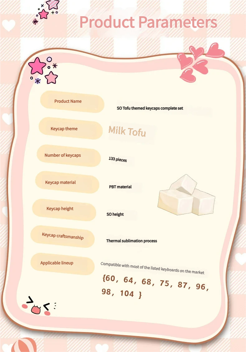 Immerse yourself in tranquility with our Milk Tofu Keycap Set, a PBT Keycap Set that embodies minimalist elegance. Inspired by the purity and calm of soft tofu, this set transforms your keyboard into a sanctuary of serenity. Each keycap is crafted from high-quality PBT material, renowned for its exceptional durability and resistance to shine, ensuring your typing experience remains pristine for years to come. The advanced Dye-Sublimation Keycaps process guarantees crisp, long-lasting legends that will never fade or wear, perfectly preserving the clean, creamy white aesthetic. Designed for those who appreciate understated beauty, these Minimalist Keyboard Keycaps offer a subtle yet profound upgrade to any desk setup. Experience the gentle touch and visual harmony that only our Milk Tofu Keycaps can provide, bringing a unique blend of sophistication and calm to your daily interactions.