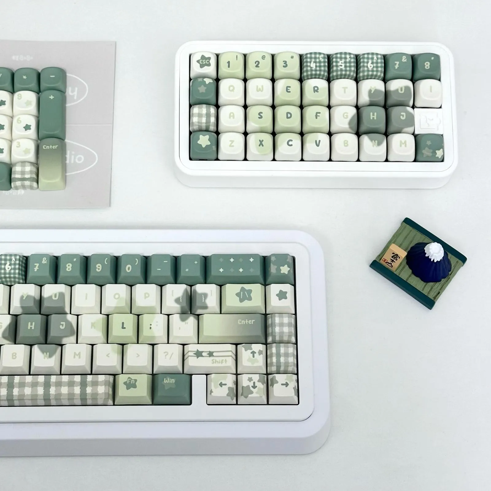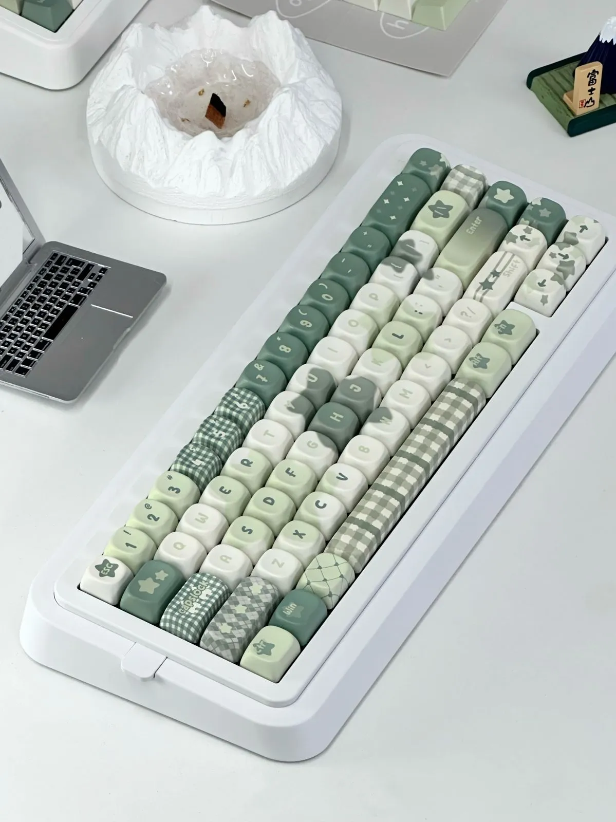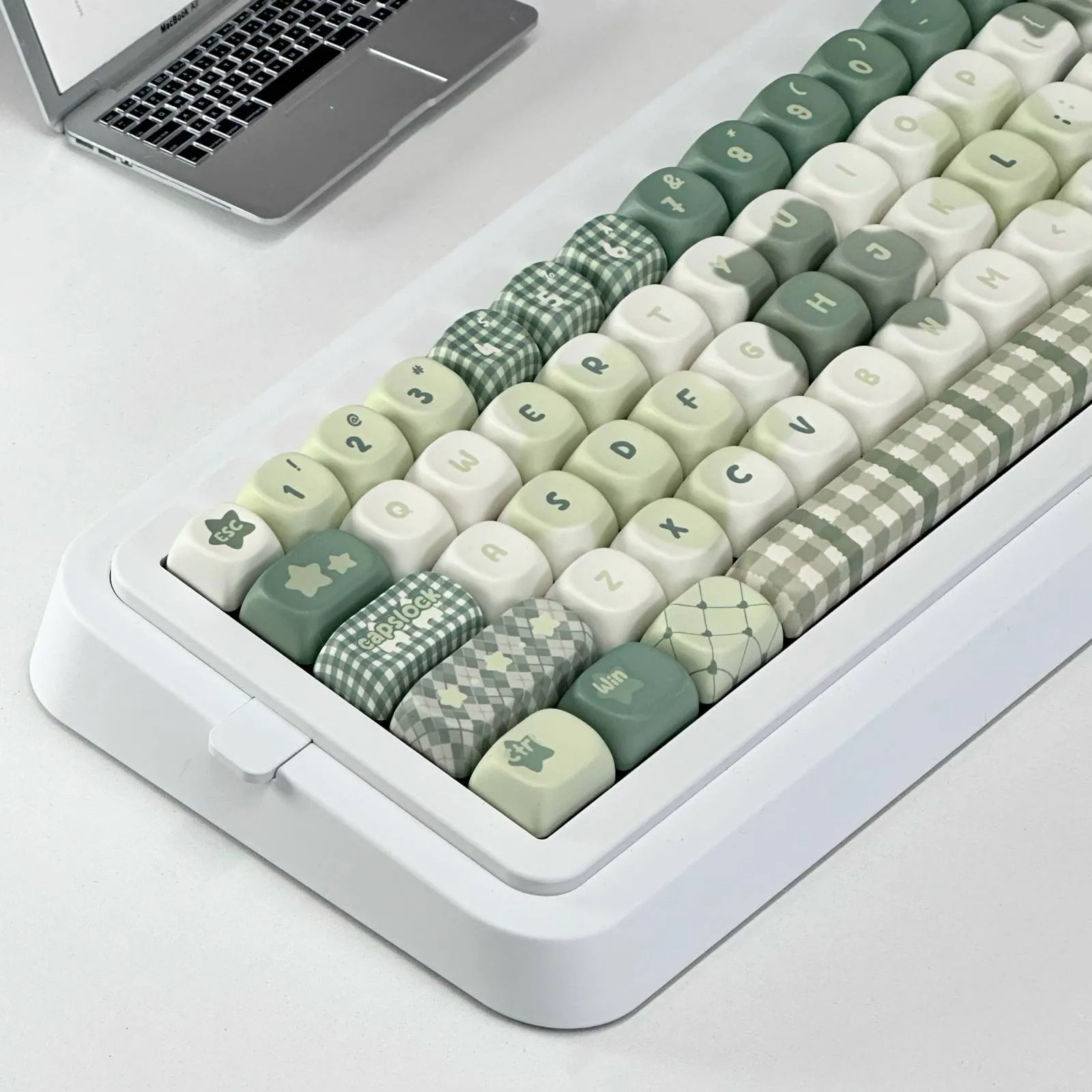 Transform your typing experience with the Mint Star Series Keycap Set! The beautiful mix of white, green and mint keycaps in this alluring assortment will liven up any keyboard. The green series gives your setup a new look by showcasing white letters in a distinctive font style. To improve their aesthetic appeal with some keycaps even feature a lovely lattice design. For those who enjoy a little flair that the fanciful star emblem on the ESC key makes it stand out. These keycaps crafted by sturdy PBT material which guarantees their durability. This set is perfect for anyone wishing to add style to their workstation. Because it comes with both Cherry Profile and MOA choices!