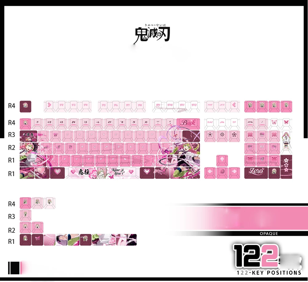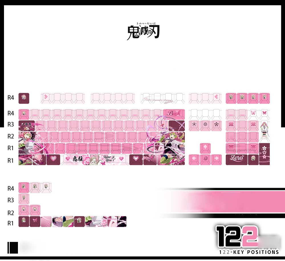 Transform your keyboard into a vibrant tribute to Mitsuri Kanroji with this meticulously crafted Demon Slayer keycap set! This comprehensive 122-key set features dye-sublimated PBT keycaps, while it was showcasing iconic images of the Love Hashira. It’s quality manufactured may ensuring long-lasting vibrancy and resistance to wear. The predominantly pink and white color scheme perfectly captures her aesthetic, bringing Kanroji’s charm and strength to your typing experience. These are gorgeous ideal for Demon Slayer fans and keyboard enthusiasts alike, this set is a single keycap set and the perfect way to infuse your workspace with anime-inspired artistry.
