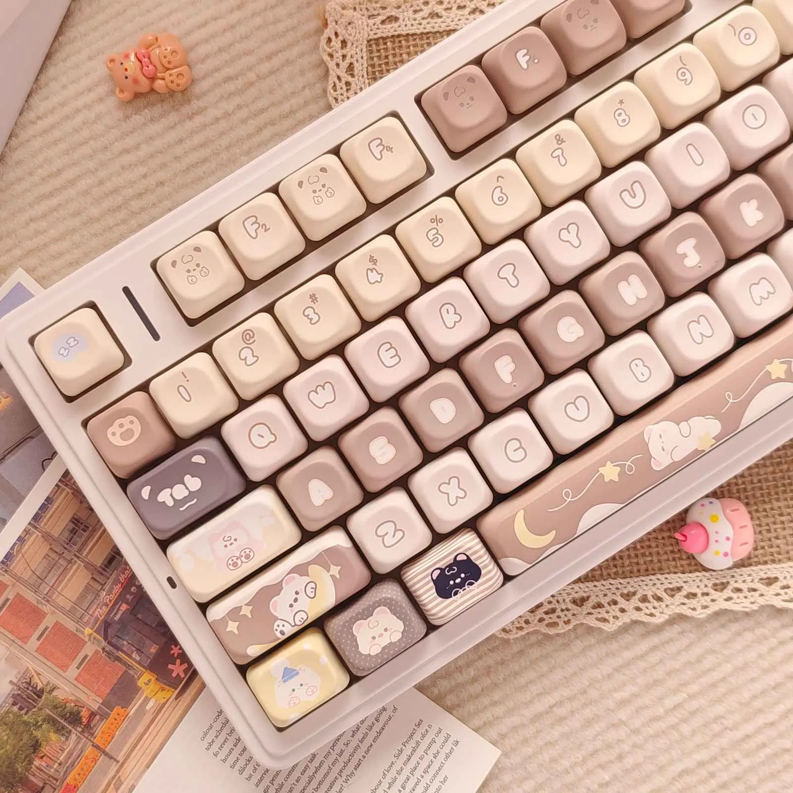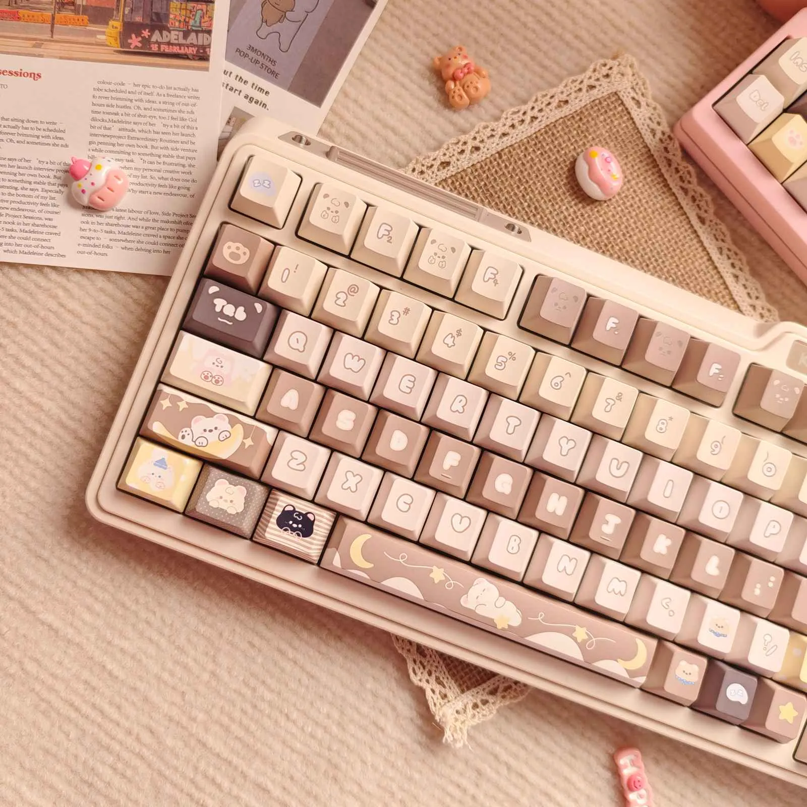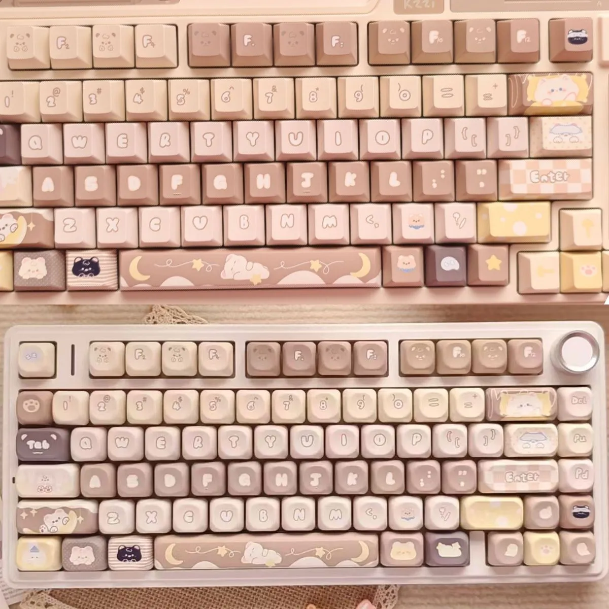 Elevate your typing experience with the enchanting Moon Coffee Series Keycap Set! You can add a personalized touch that suits your style by selecting between the OEM or QX3 Keycap Set. The charming combination of beige and brown keycaps in this gorgeous set. Which creates a cozy and welcoming look that goes well with any keyboard. Each keycap adds personality to your setup with its distinctive font style and white letters with a brown outline. While some keycaps have adorable animal paw motifs. That others are embellished with quirky moon and star emblems. This keycap set which is made of sturdy PBT material. Which is the ideal combination of fashion and utility for any keyboard aficionado!