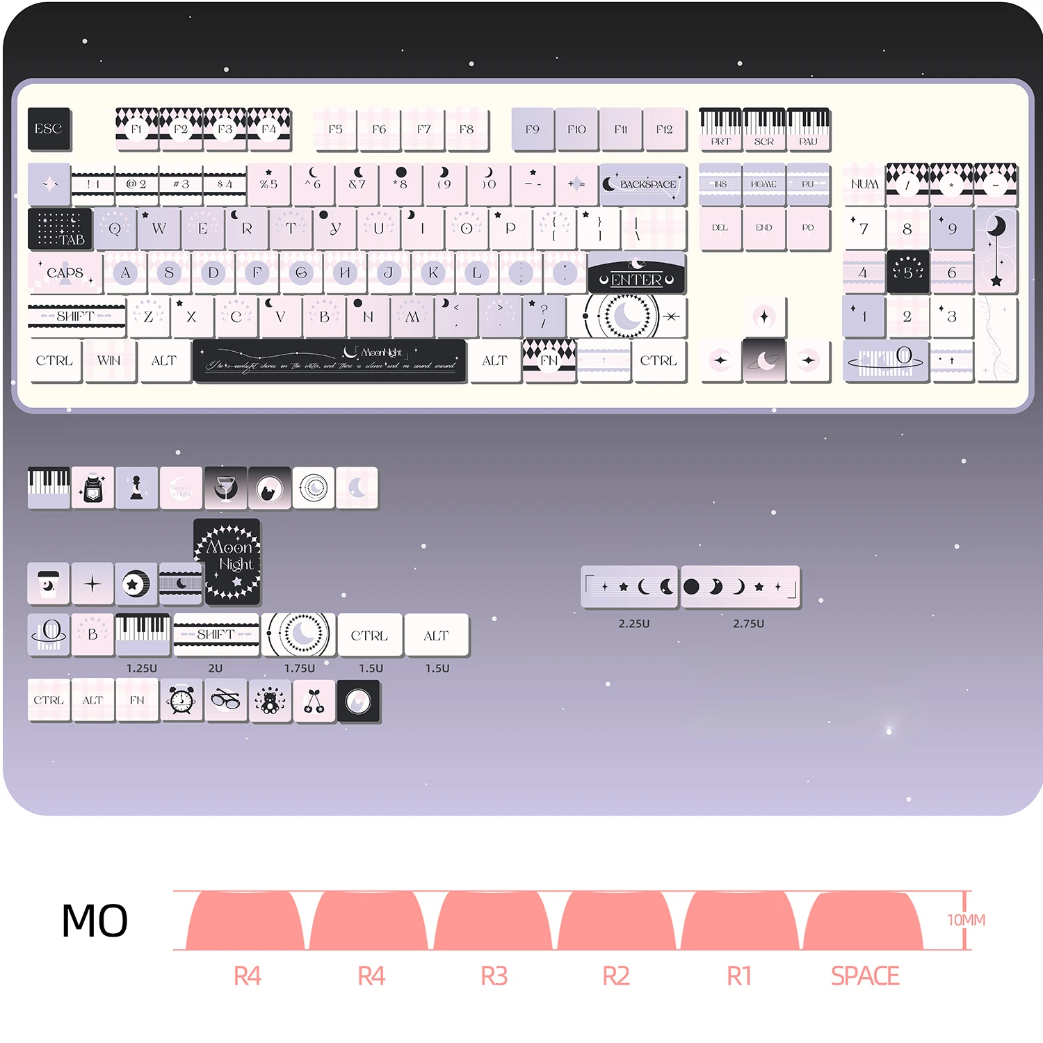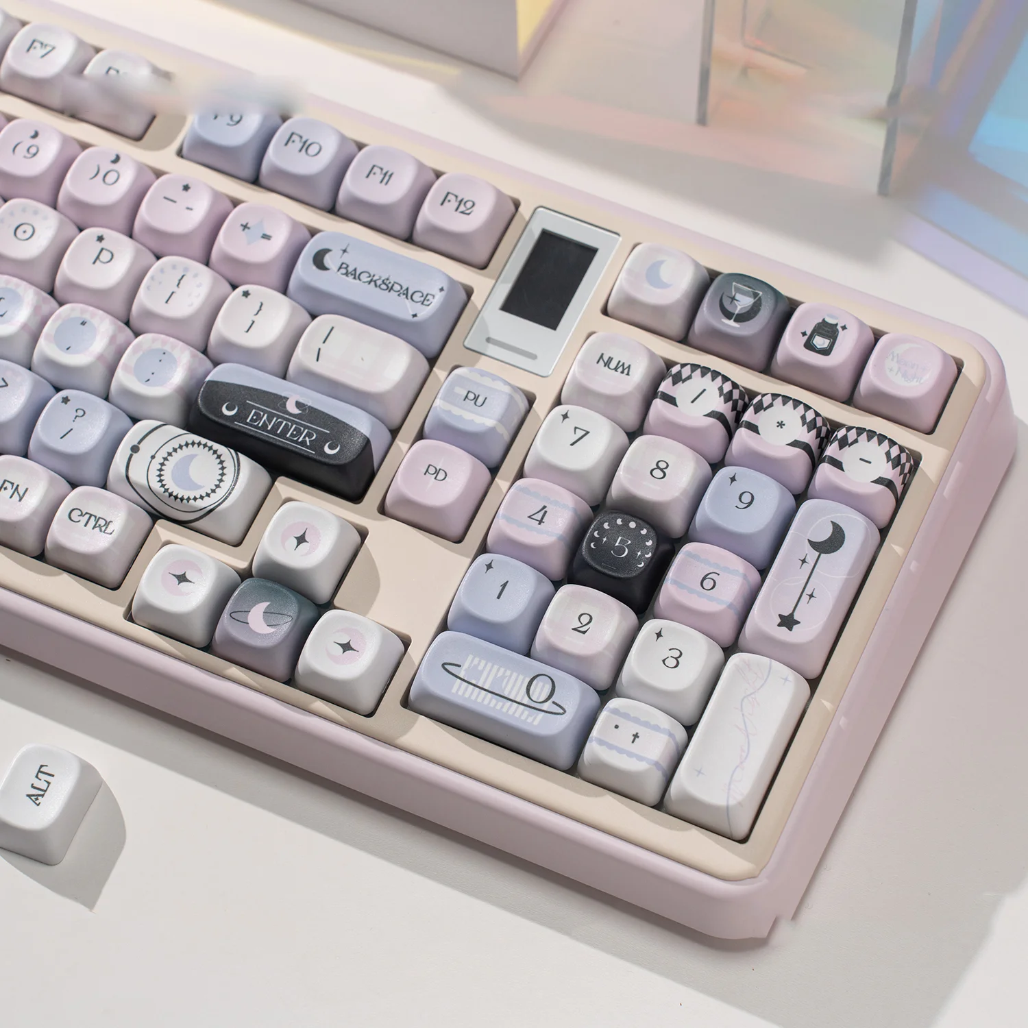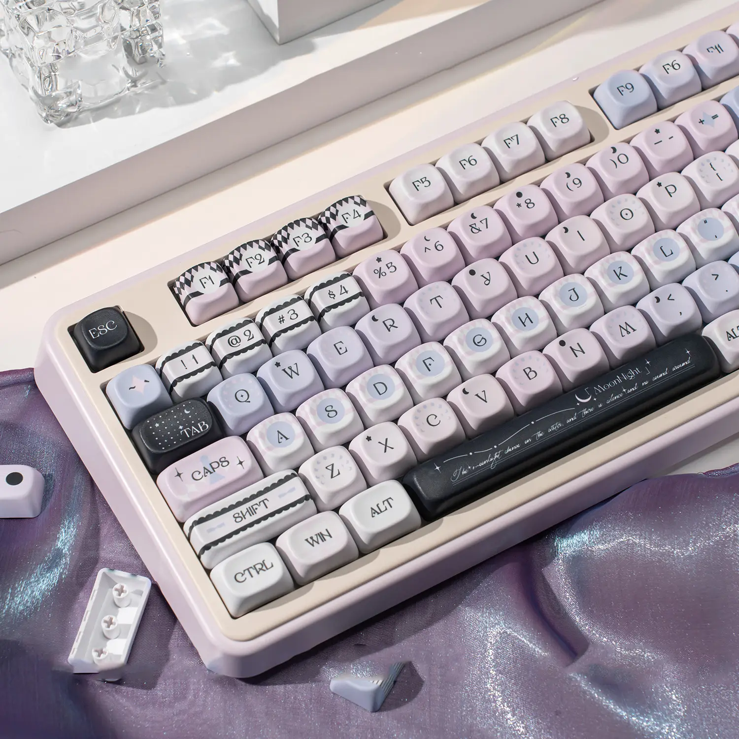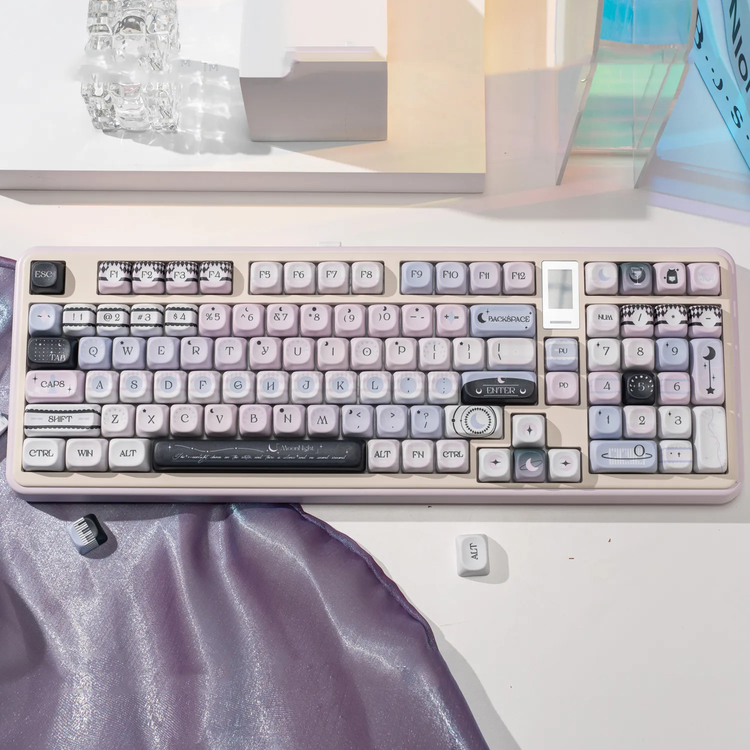 To begin with the Moon Night MO Keycap Set & Tri-Mode Mechanical Keyboard is a gorgeous combination of elegance and practicality that will enhance your workstation. In addition, this keyboard, which is made of sturdy, premium PBT, has a captivating purple and black design that gives any setup a cosmic feel. Additionally, the striking black design of the space key, which features the word “moonnight,” nicely ties in with the celestial theme. Moreover, its ergonomic comfort and gratifying, while the responsive keystrokes making it be the perfect choice for both casual users and ardent fans seeking an outstanding typing experience. Therefore, with features that can be adjusted to suit personal tastes, this attractive keyboard may also improves typing efficiency and lets you show off your individual style in any office!