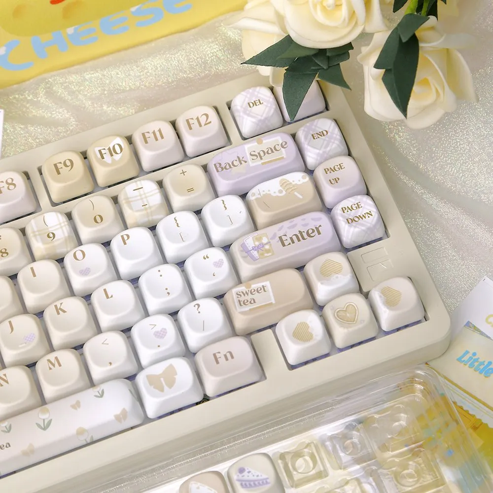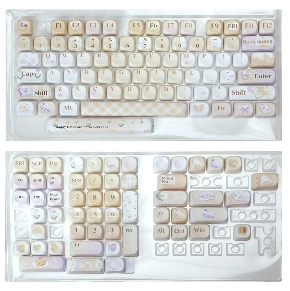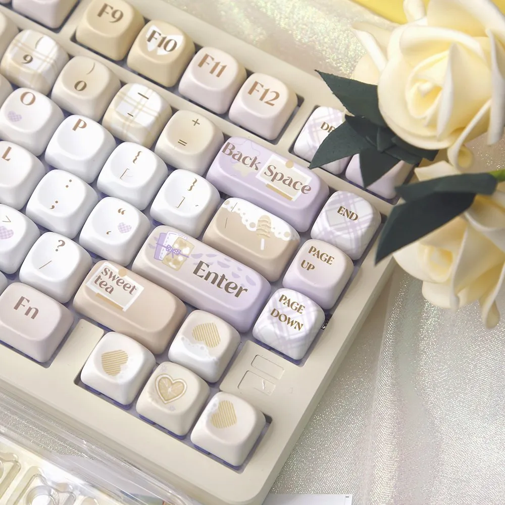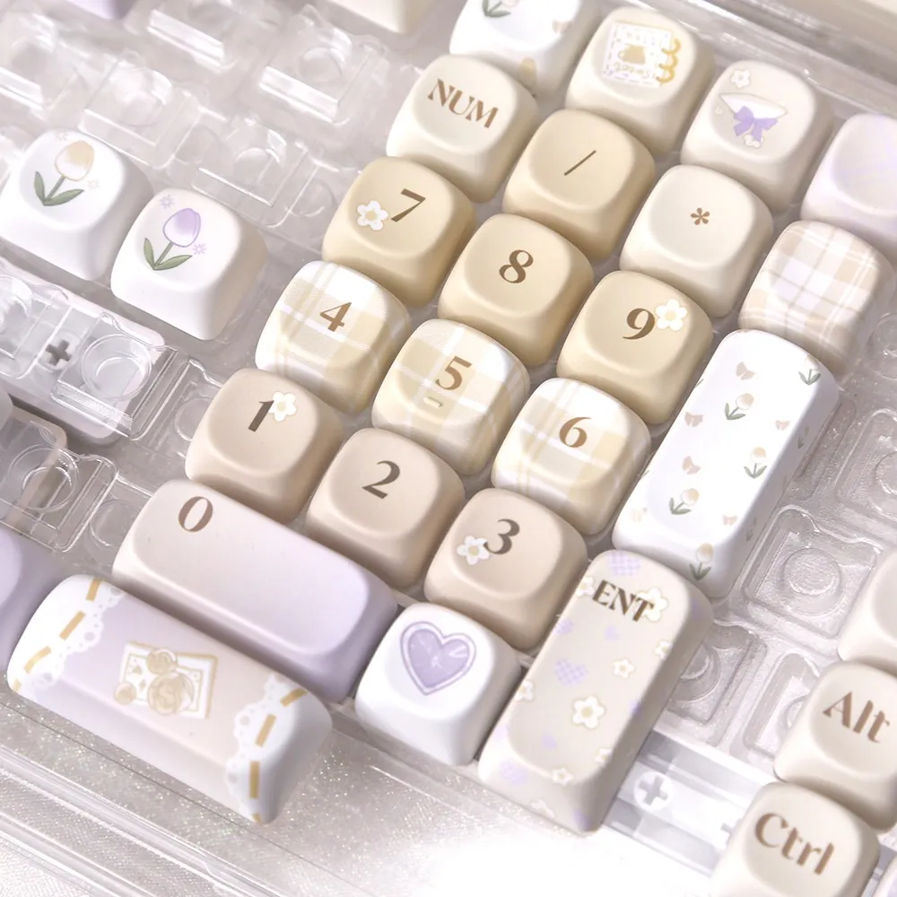 Upgrade the look of your keyboard with the Morning Tea MOA Keycap Set! A tasteful combination of light brown, white and purple keycaps can be found in this charming set. Brown lettering in a distinctive font design adorns each keycap which lending a touch of refinement. The quirky attractiveness of the set is further enhanced by the Caps key. Which features a beautiful flower image. Furthermore, a number of keycaps include heart-shaped patterns. Which are ideal for people who enjoy a little romance in their setup. These keycaps are long lasting and have a high-end feel because they are made of sturdy PBT. Use this captivating keycap set right now to revolutionize your typing experience!