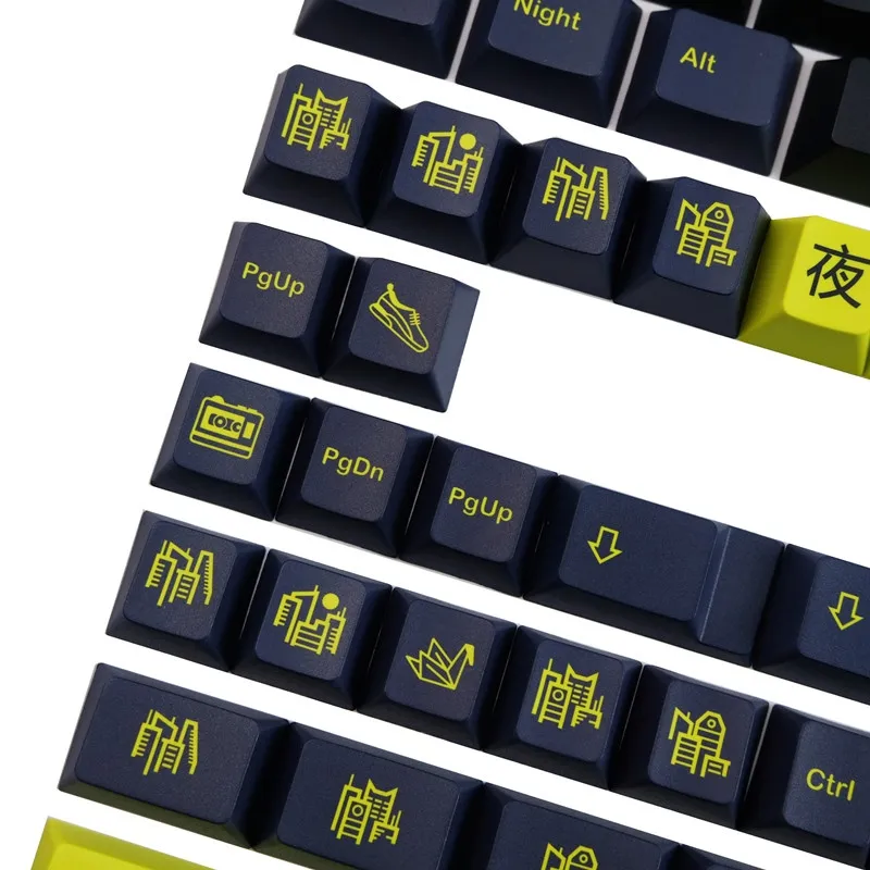 Revitalize your typing experience with the Night Runner Cherry Keycap Set! Dark blue and vivid yellow keycaps contrast sharply with the sleek black base of this eye catching set. Each keycap that adorned with symbol designs inspired by cities which gives your setup a distinctive urban feel. It is both fashionable and practical because of the vivid yellow lettering that guarantees clarity with each keystroke. These keycaps crafted by sturdy PBT material and are designed to endure regular use without losing their style. This keycap set with its traditional cherry profile that is ideal for people who appreciate both style and functionality. Upgrade your workstation and welcome the evening atmosphere right now!